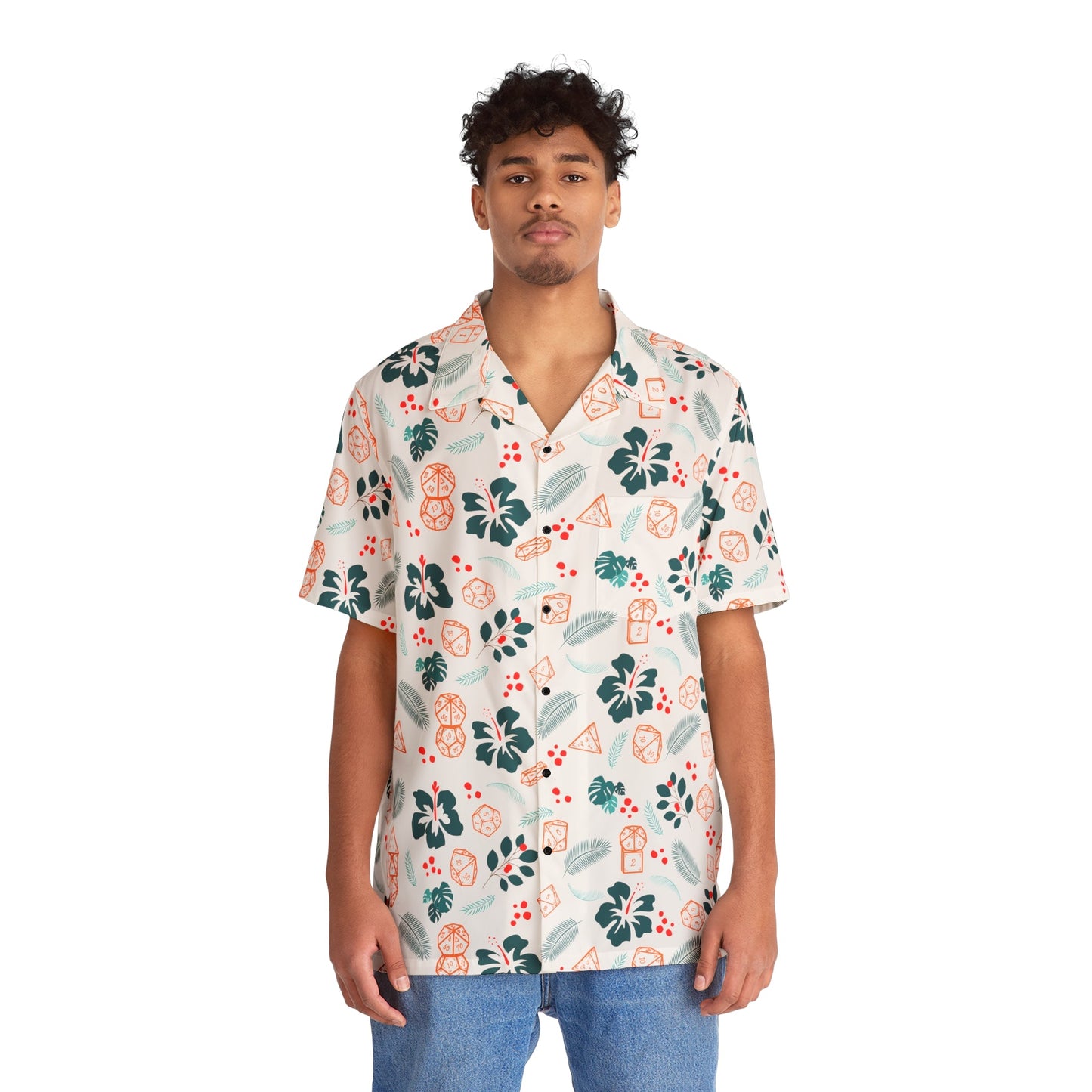 Immerse yourself in a world where tropical charm meets tabletop roleplay and magical-style clothing with our Hawaiian DnD Dice Shirt. Designed with whimsical flowers, lush leaves, and iconic dice, this unique Aloha-style shirt captures the essence of both realms.