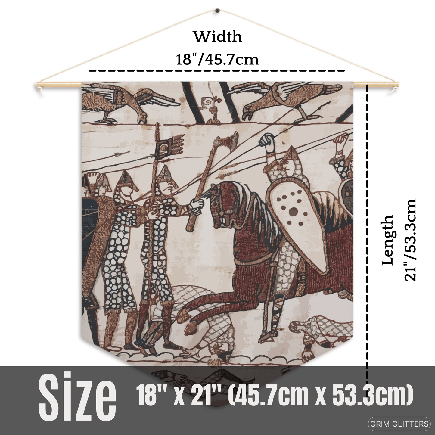 Experience the epic clash of medieval history with our Bayeux Tapestry Pennant Banner. Inspired by the iconic Bayeux Tapestry, this banner vividly depicts the thrilling charge of Norman knights against Anglo-Saxon warriors, capturing the drama and valor of the historic Norman Conquest.