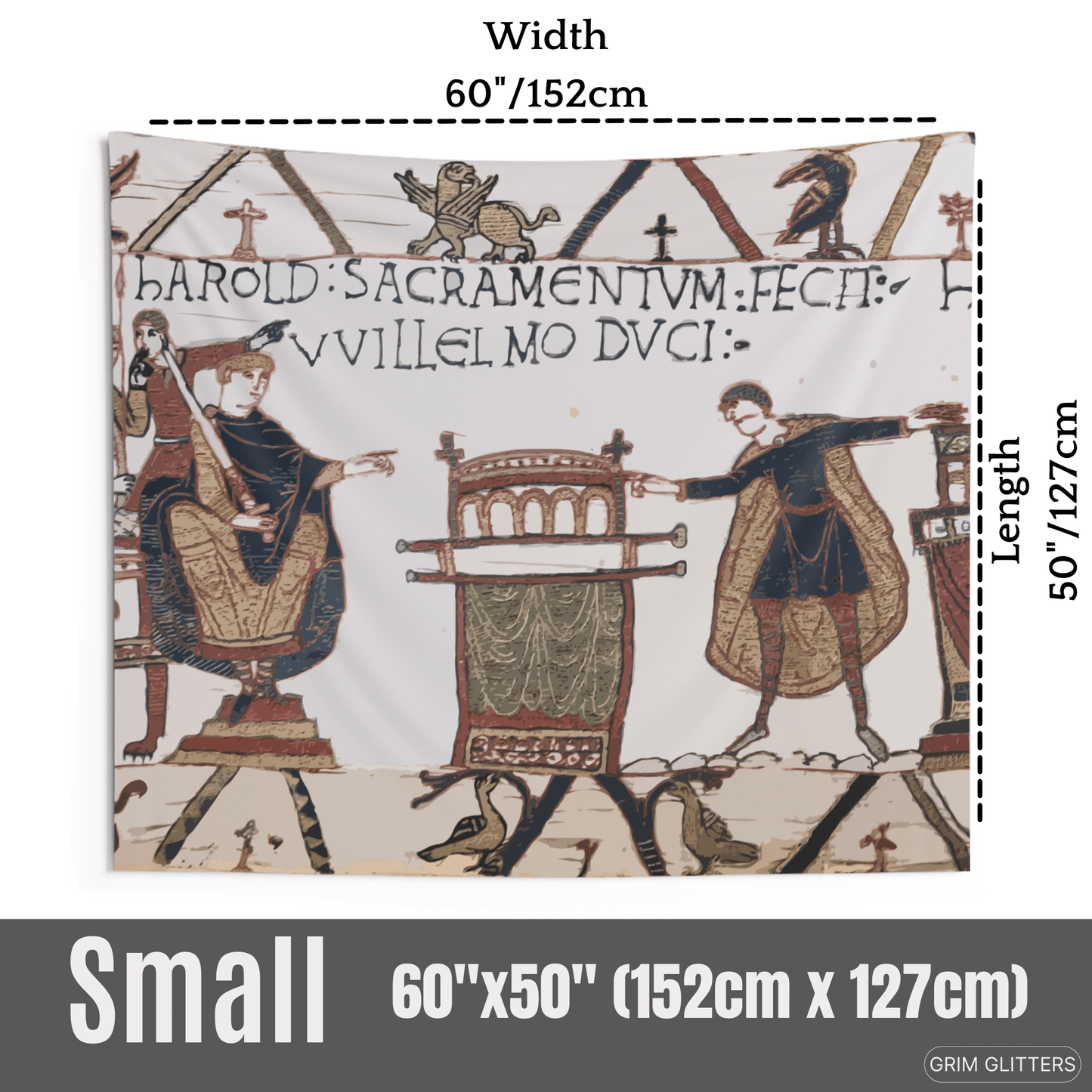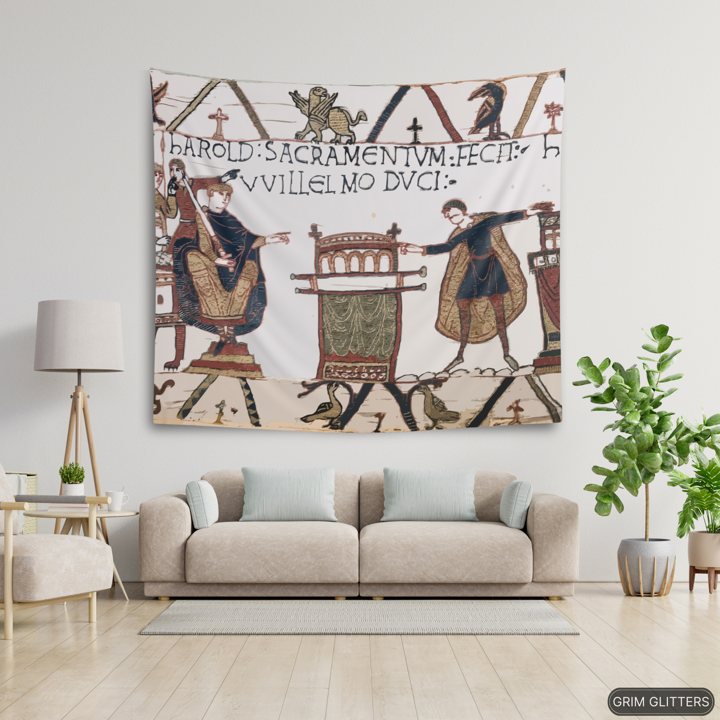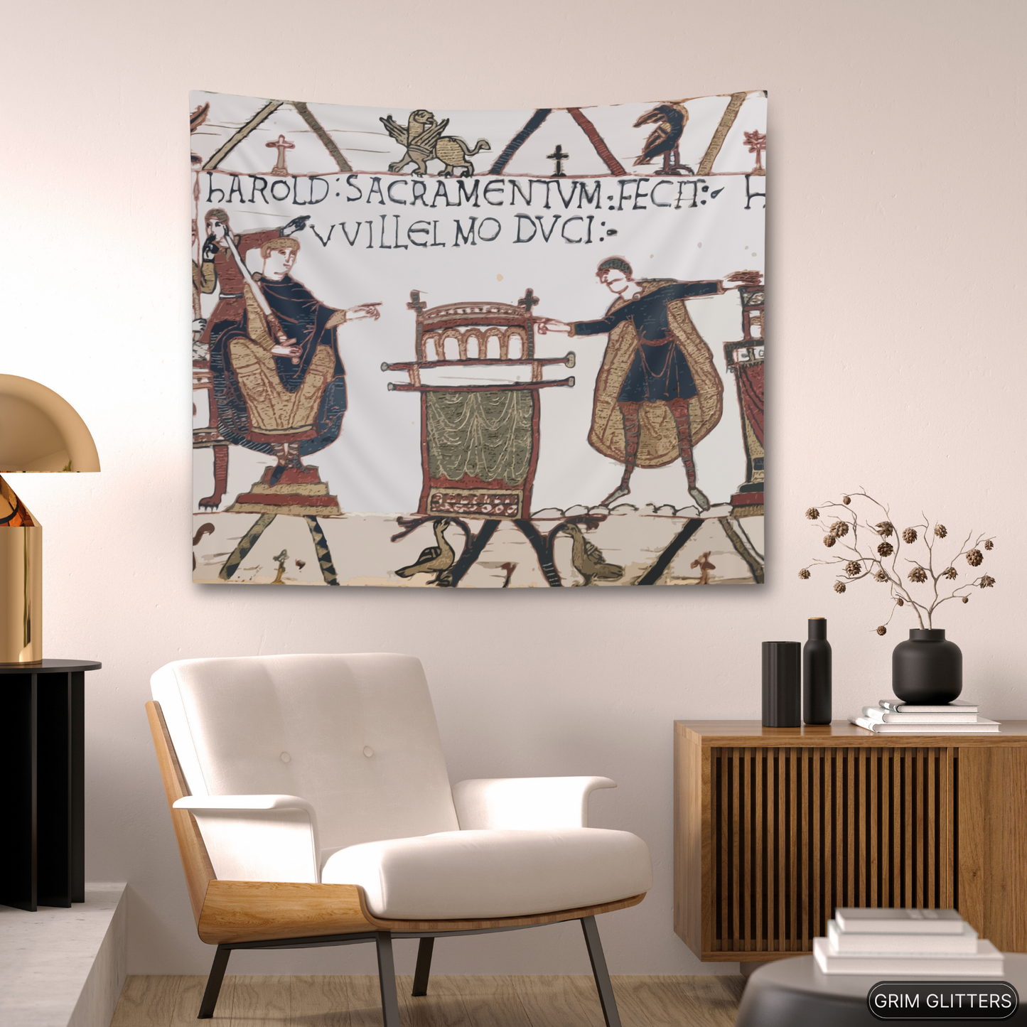 Experience the allure of medieval history and elevate your decor with our 'Bayeux Style' Indoor Tapestry - Harold Swearing Oath on Holy Relics.