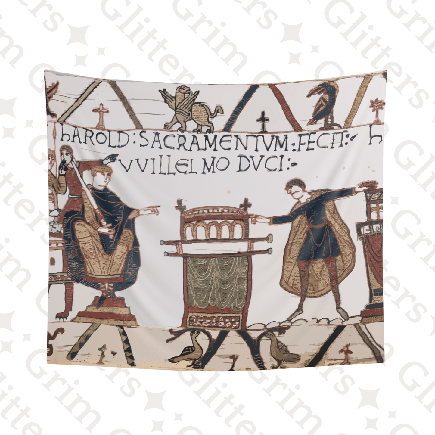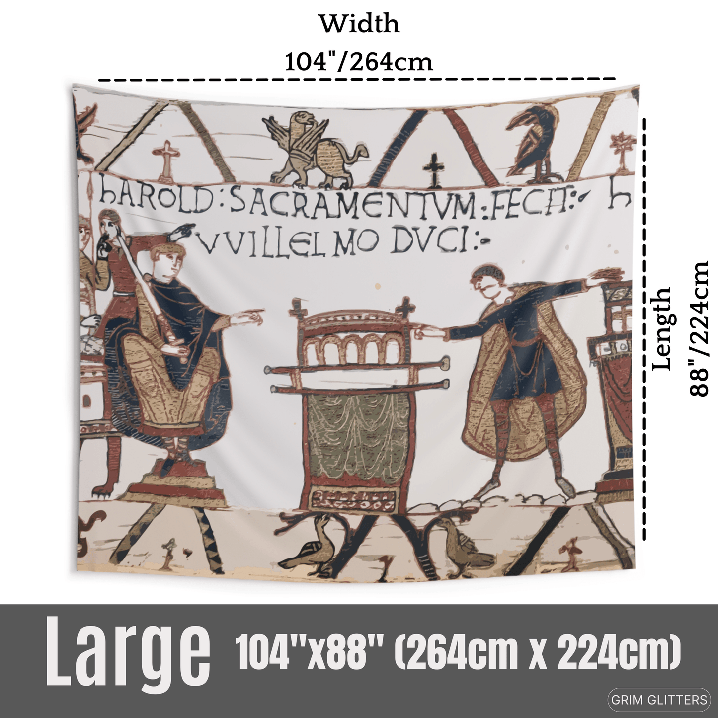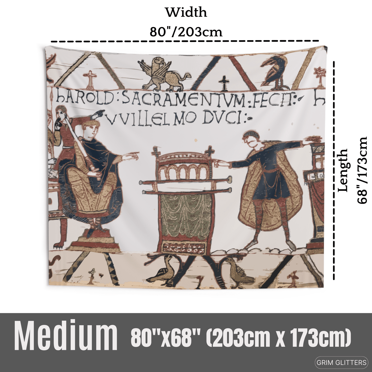 Experience the allure of medieval history and elevate your decor with our 'Bayeux Style' Indoor Tapestry - Harold Swearing Oath on Holy Relics.