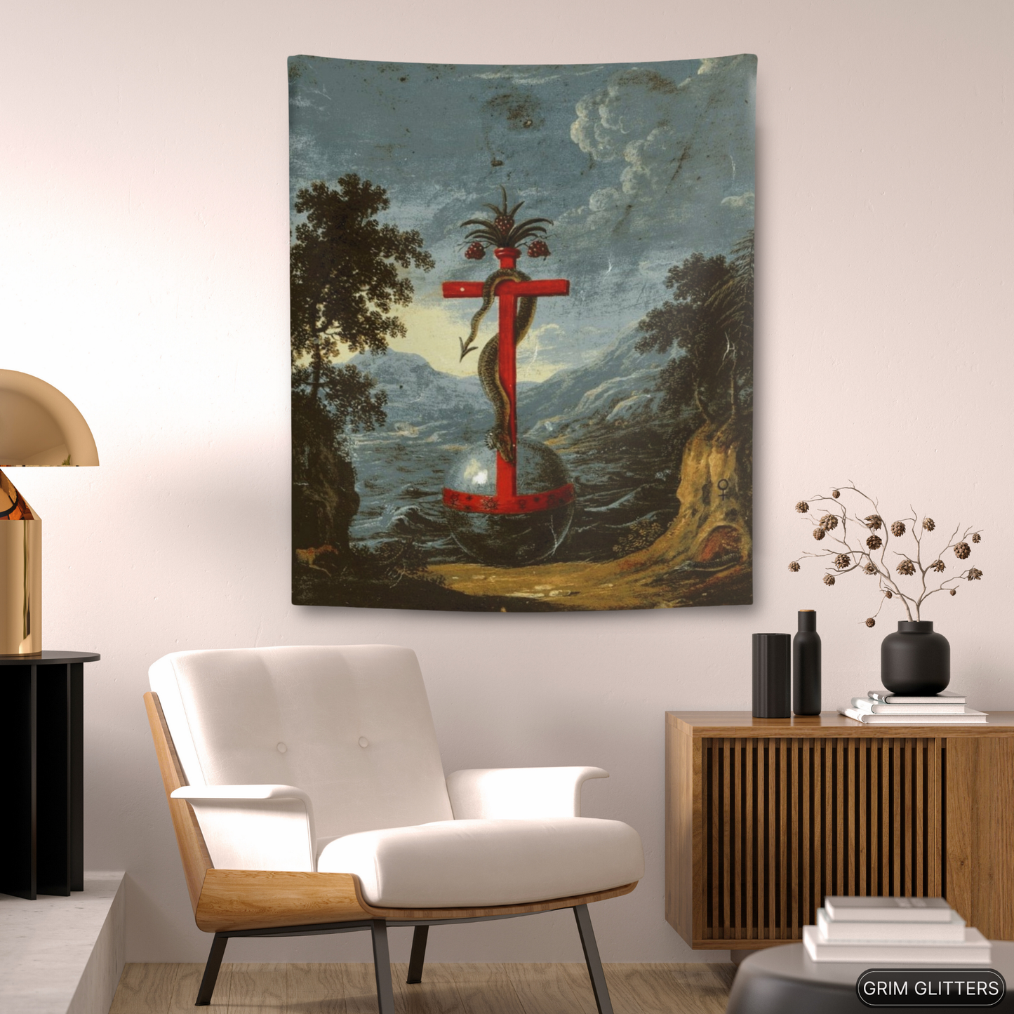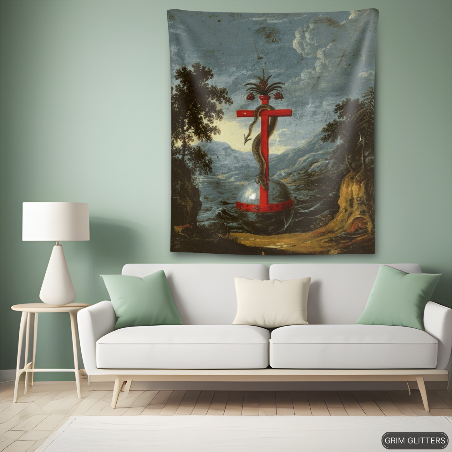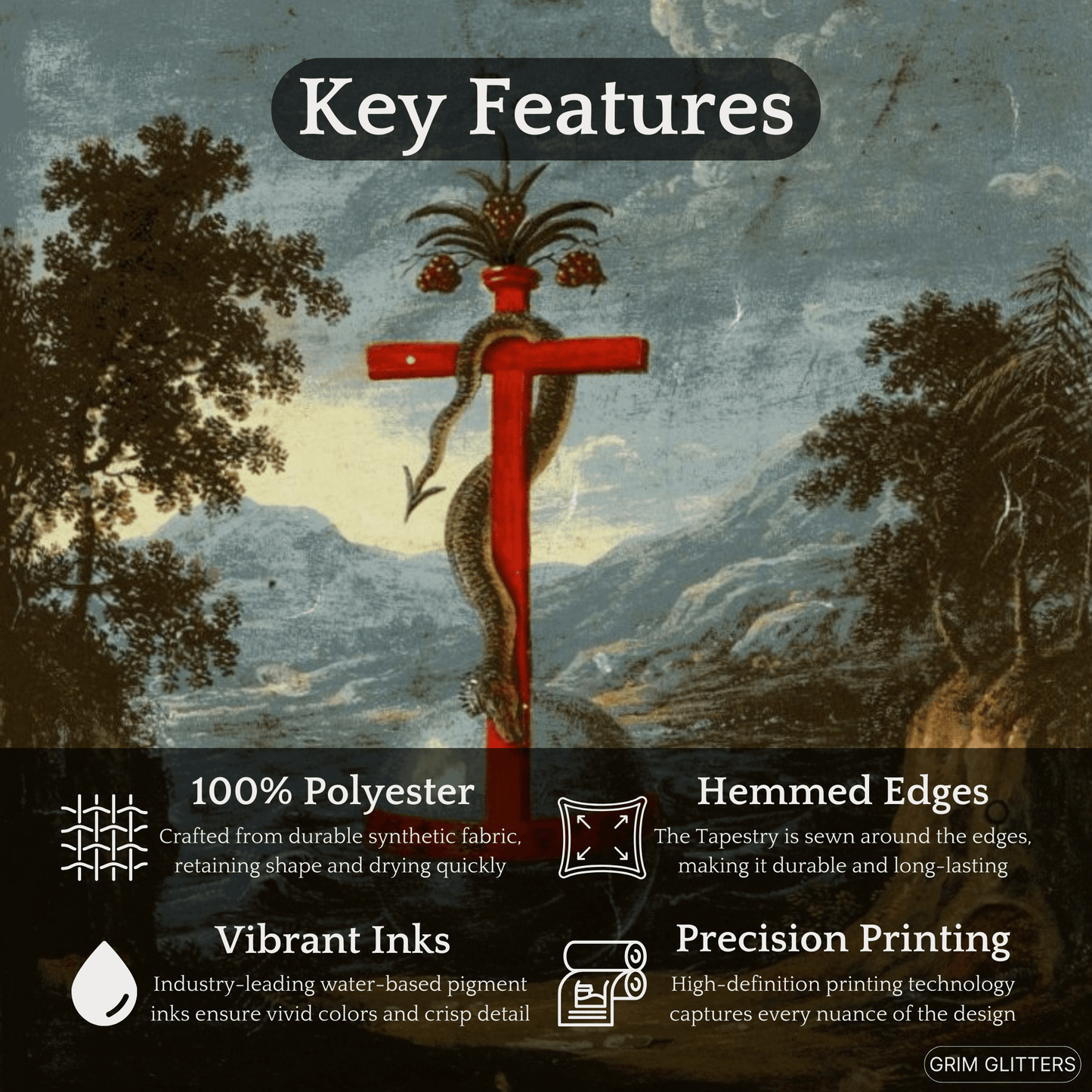 Enhance your home with the historical and mystical charm of our Crucified Serpent Tapestry. Perfect for esoteric enthusiasts, history buffs, and lovers of medieval art, this tapestry adds a touch of ancient wisdom and sophistication to any wall.