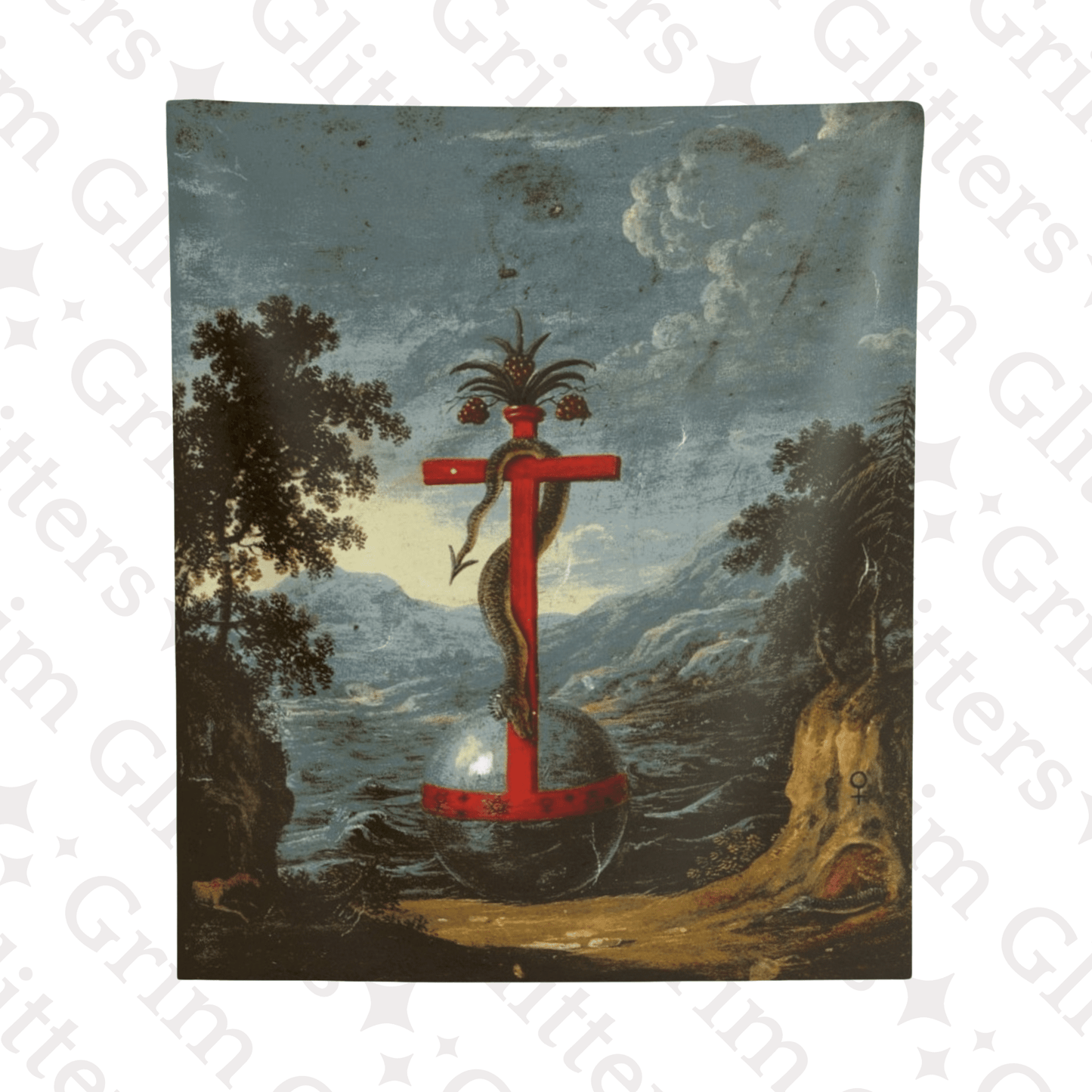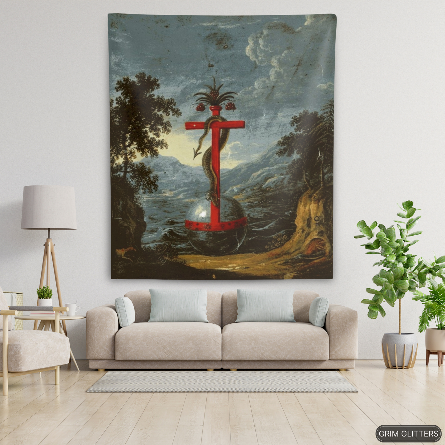 Elevate any room's aesthetics with the profound symbolism and intricate details of the Crucified Serpent. This tapestry adds a unique and captivating focal point to your space, perfect for those who appreciate the deeper meanings of alchemical and hermetic art.