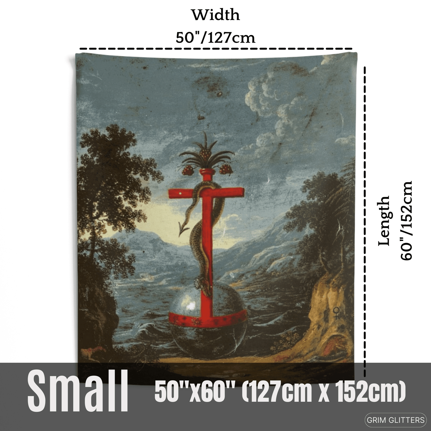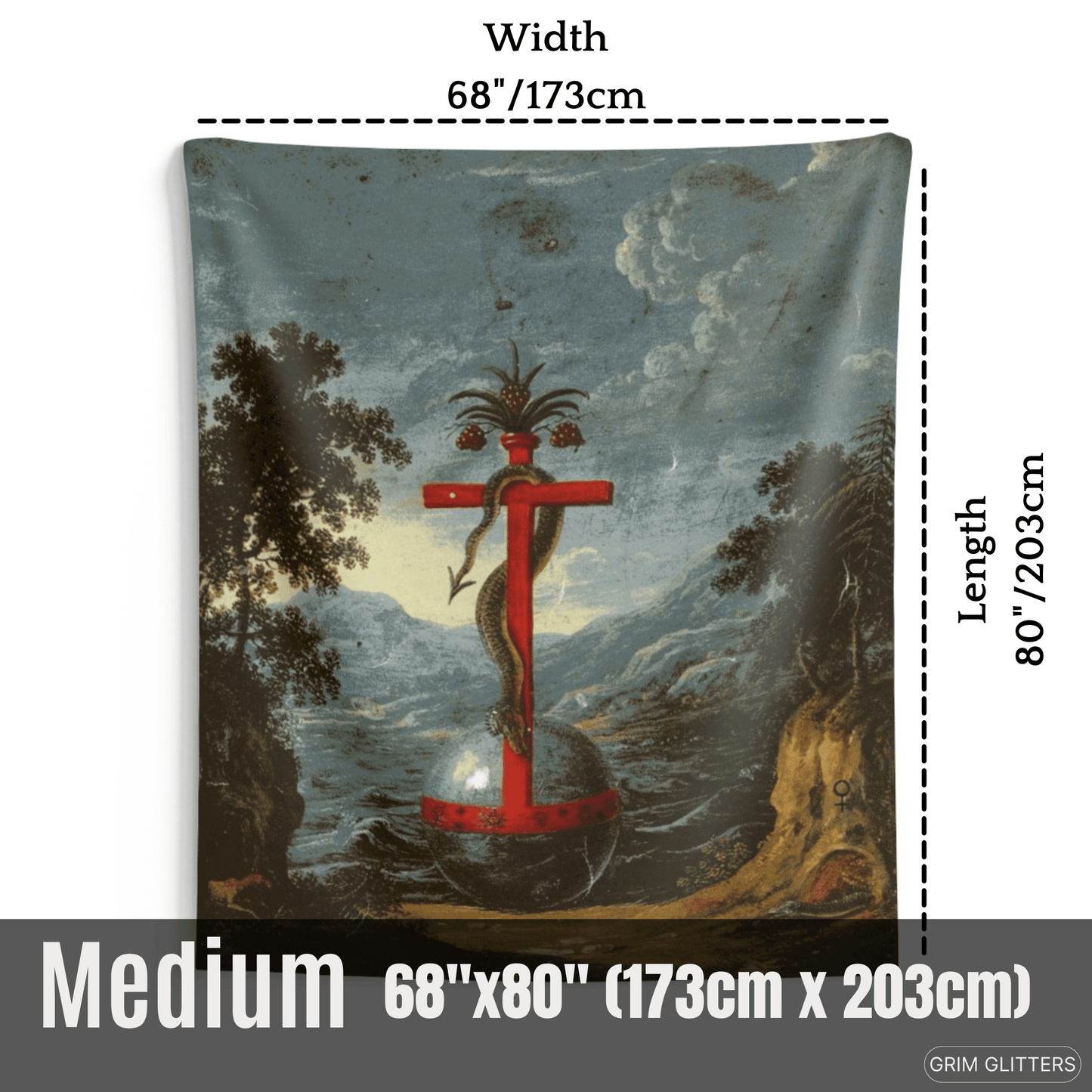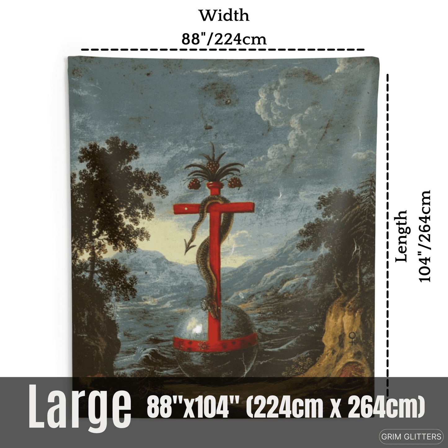 Utilizing advanced tapestry printing techniques, the Crucified Serpent design is reproduced with bright and intense colors, ensuring crisp detail and vivid imagery that brings the alchemical scene to life.