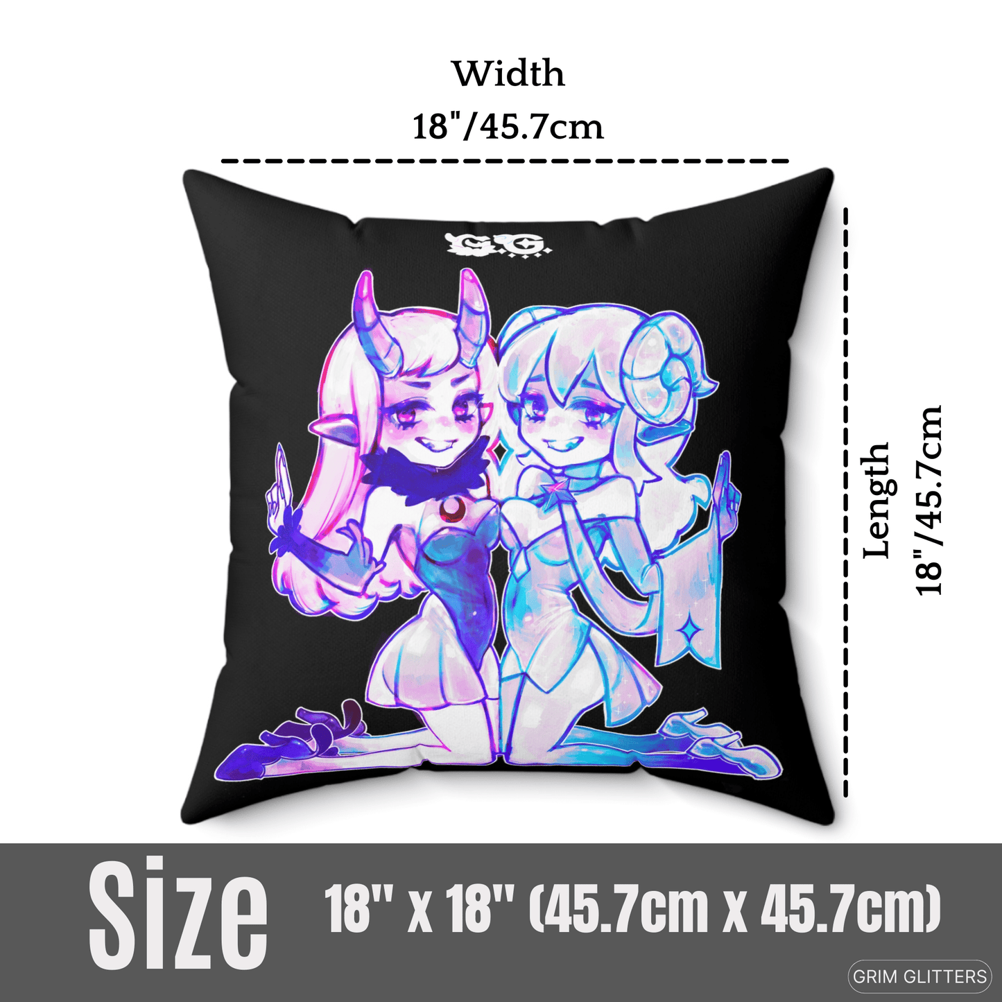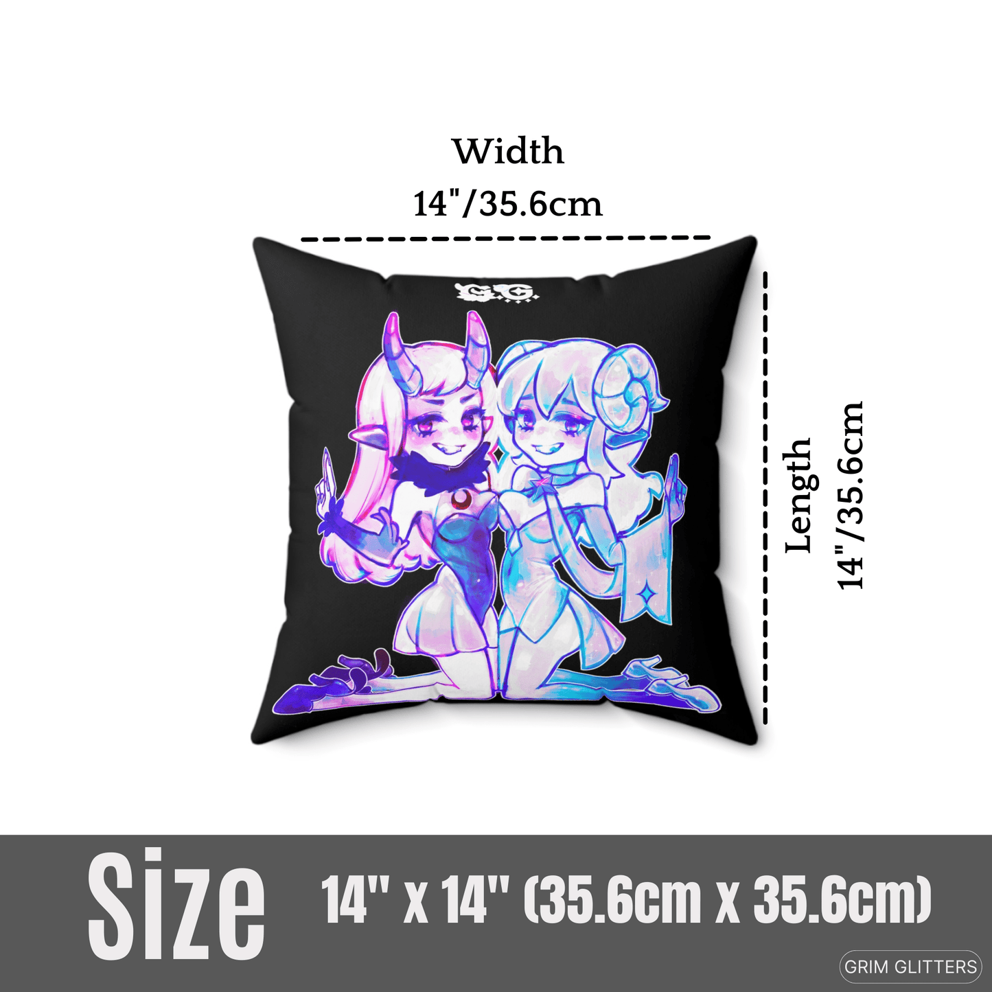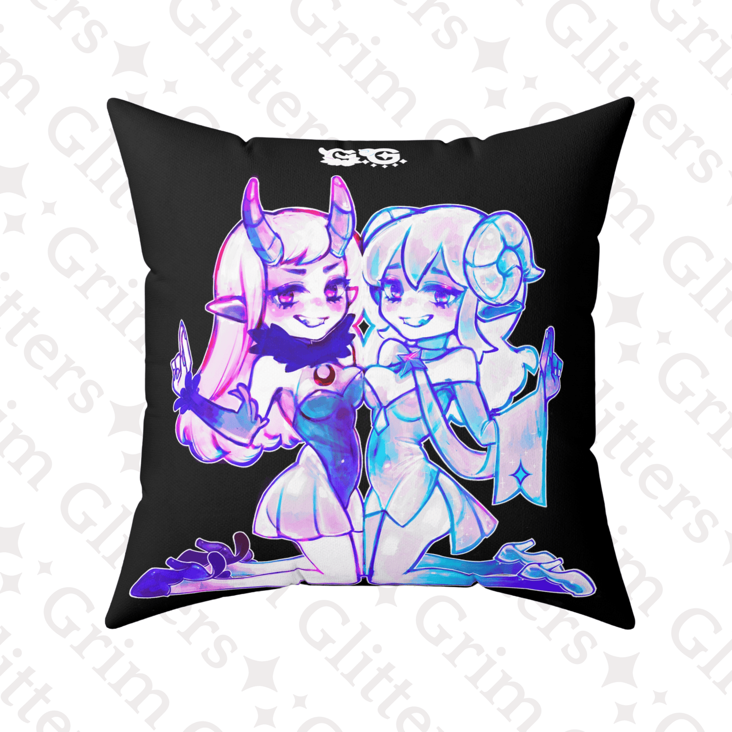 Immerse yourself in the enchanting world of Grim Glitters with our GG originals Square Pillow. Featuring captivating artwork of Lunar demon witch Grim and Astral dream caller Glitta, this pillow adds a touch of mystique and whimsy to any room.