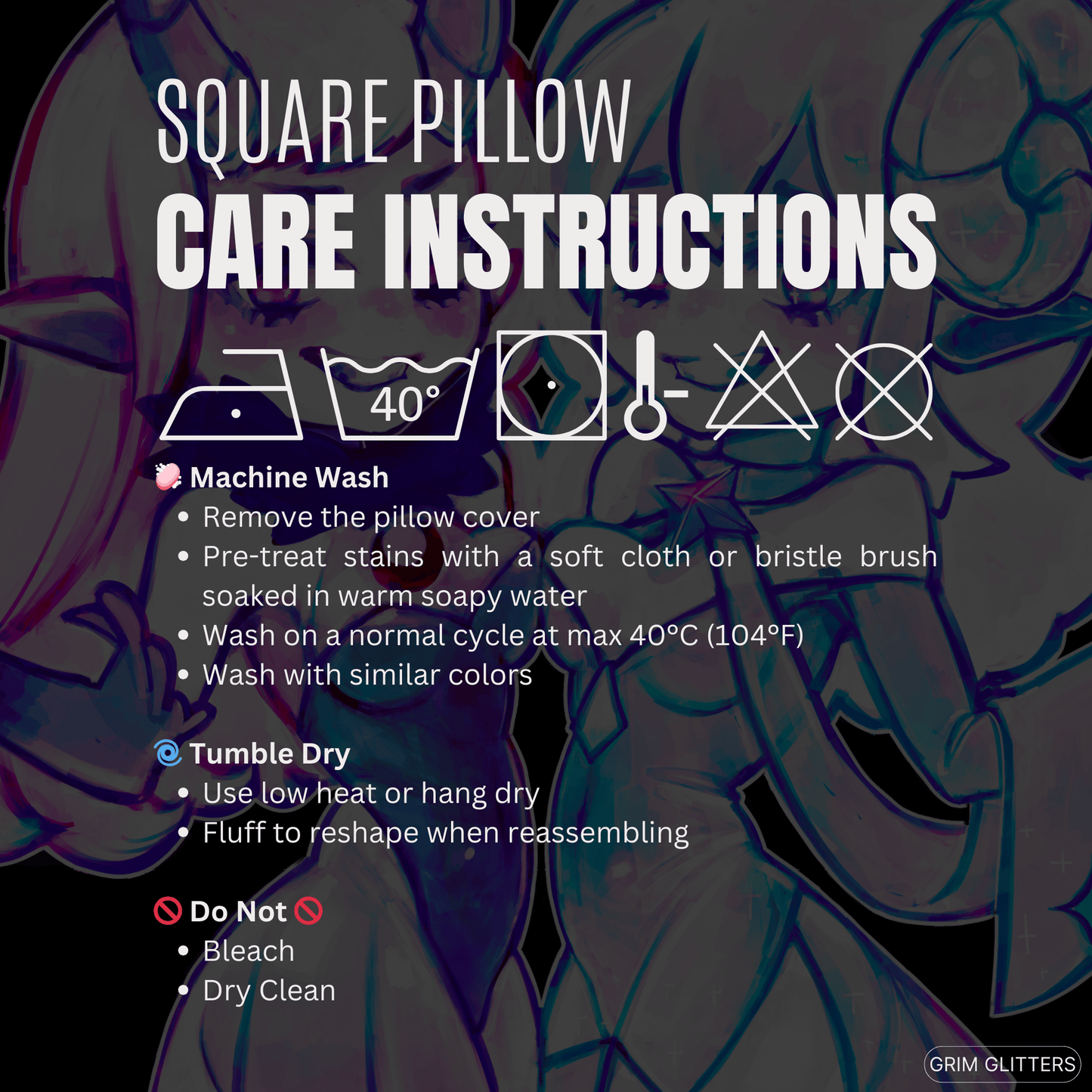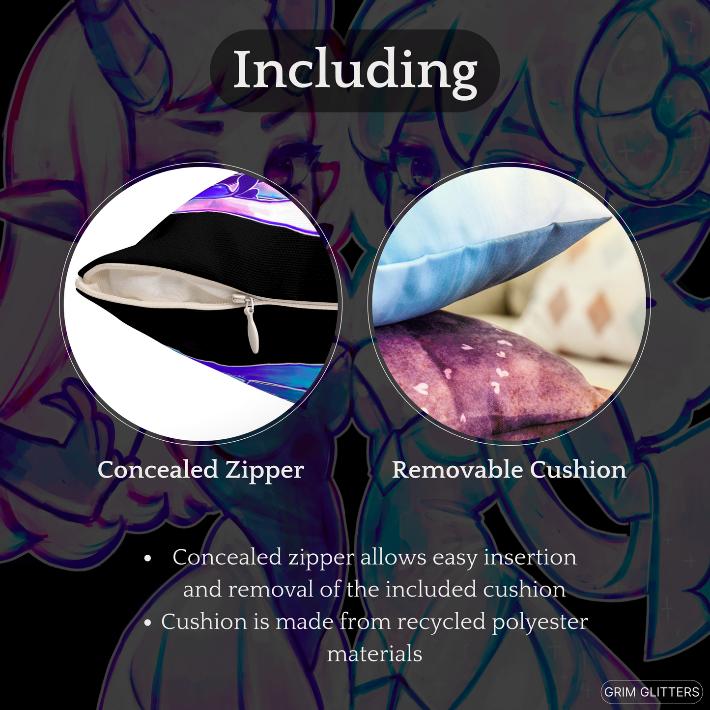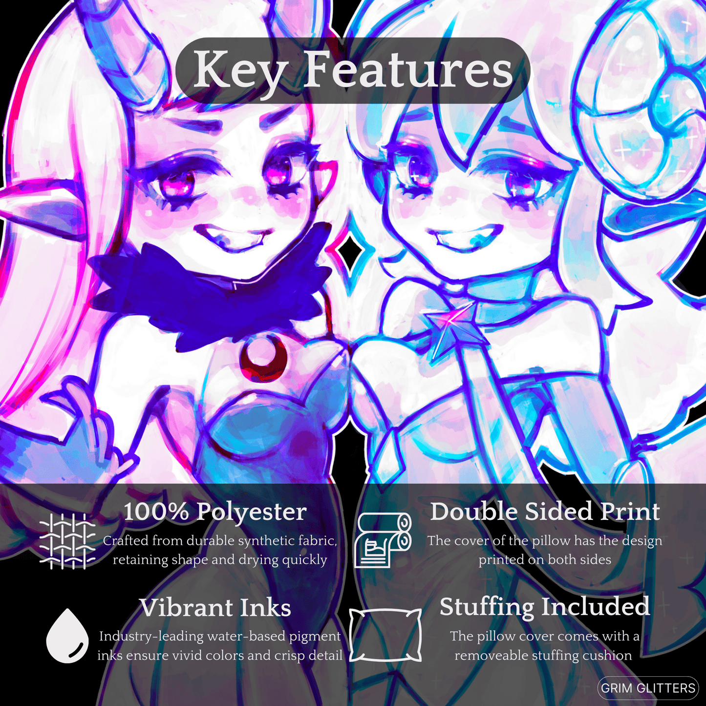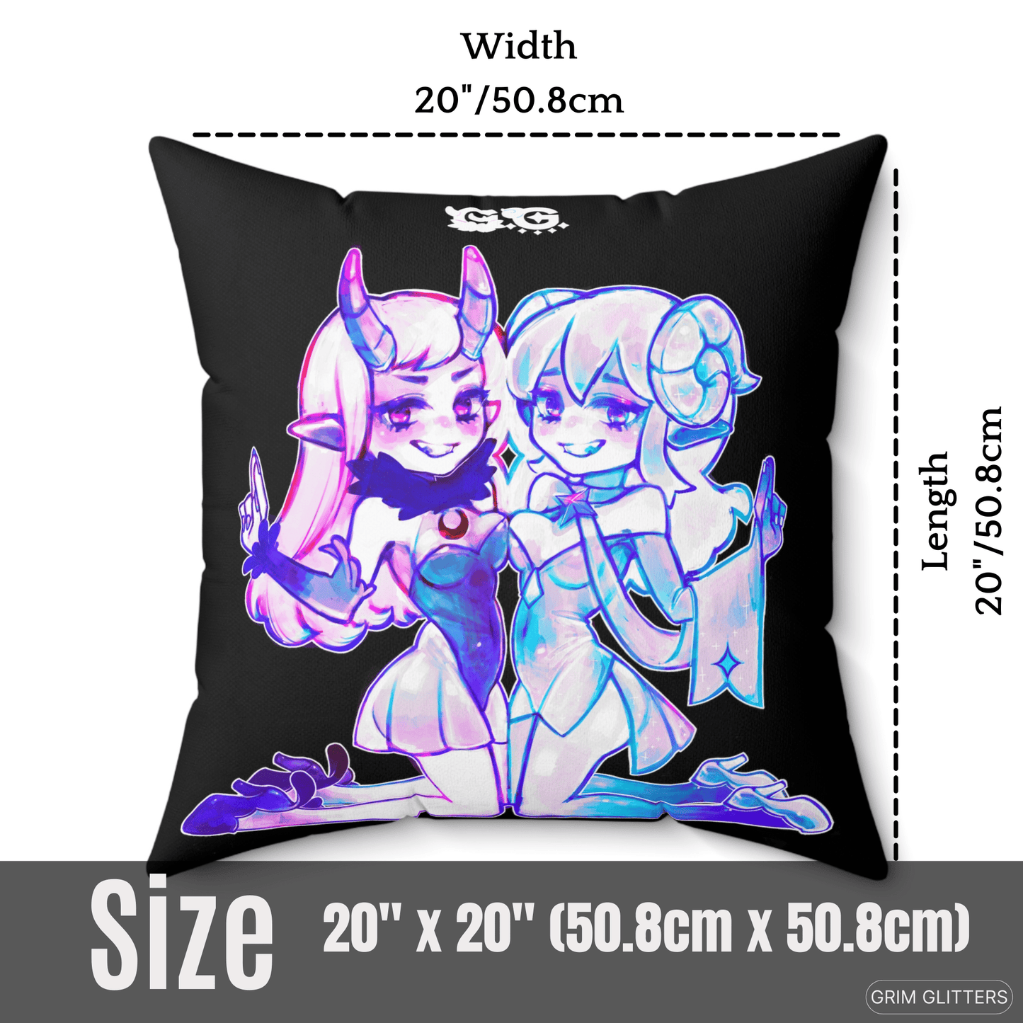 Immerse yourself in the enchanting world of Grim Glitters with our GG originals Square Pillow. Featuring captivating artwork of Lunar demon witch Grim and Astral dream caller Glitta, this pillow adds a touch of mystique and whimsy to any room.
