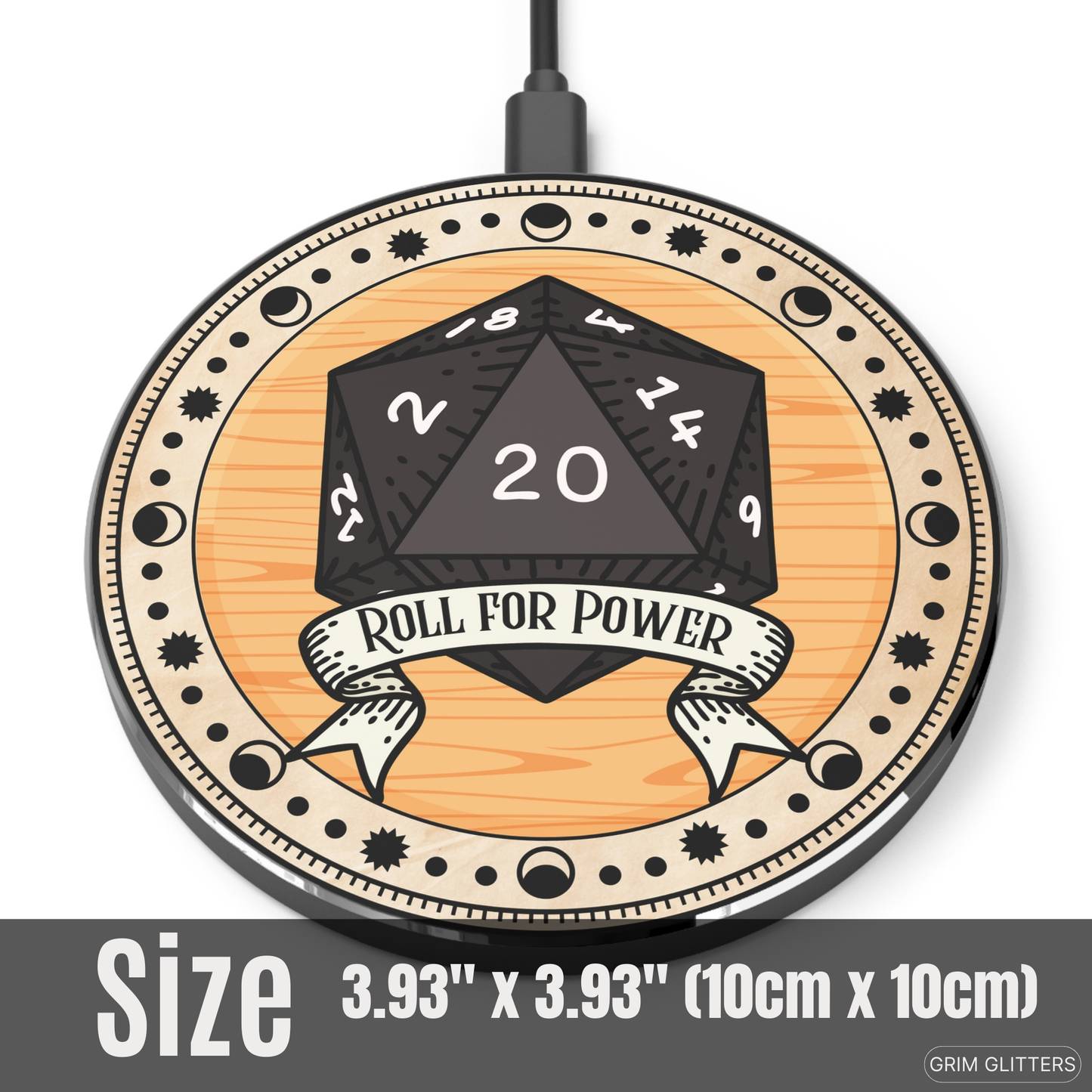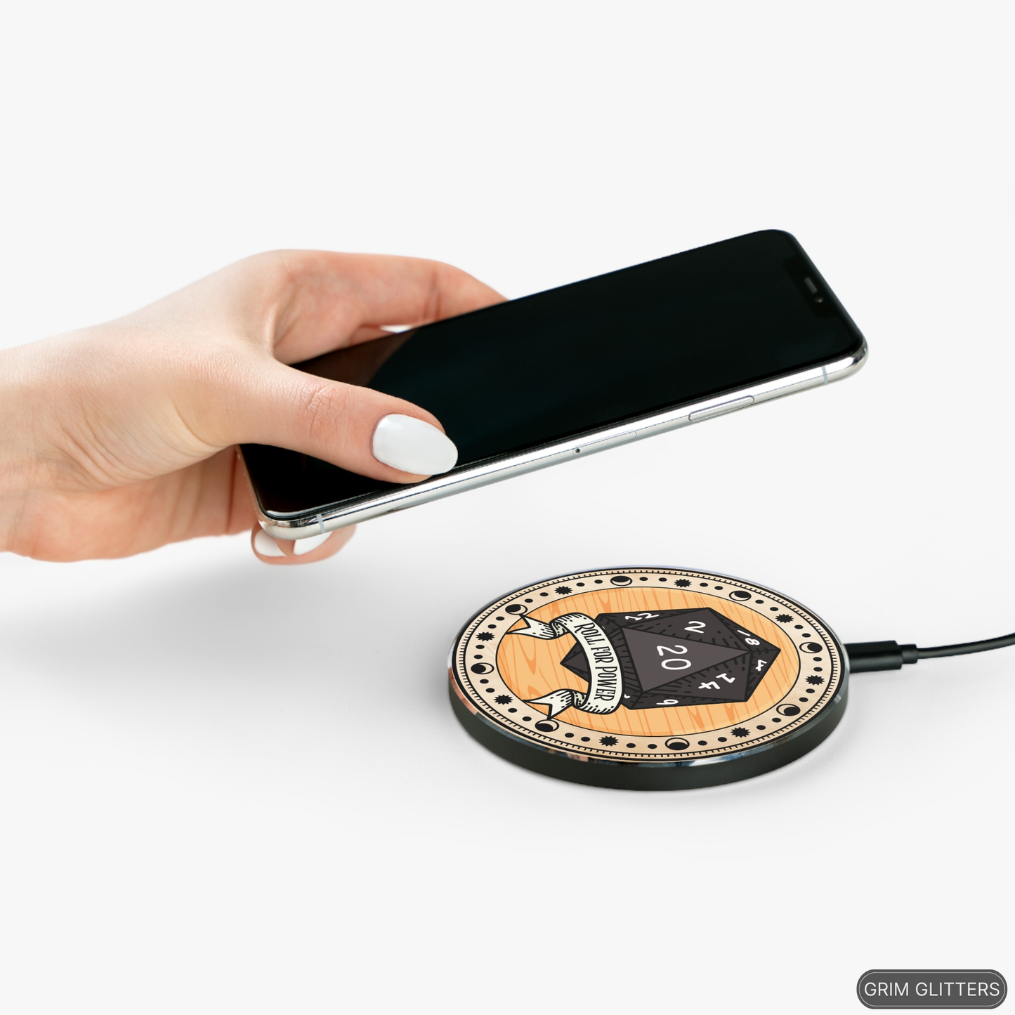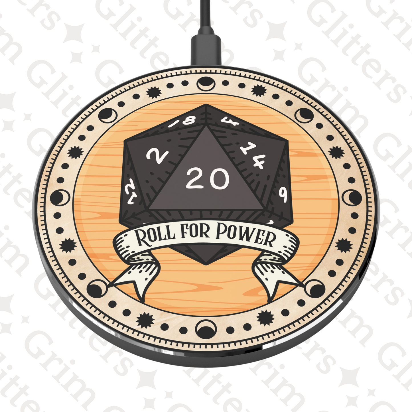 Elevate your gaming experience with the "Roll for Power" D20 Wireless Charger. This unique and functional accessory features a central D20 design, symbolizing the excitement of rolling for success. The wooden backdrop adds a touch of rustic charm, while the banner proudly proclaims "Roll for Power," encouraging you to seize the gaming moment.