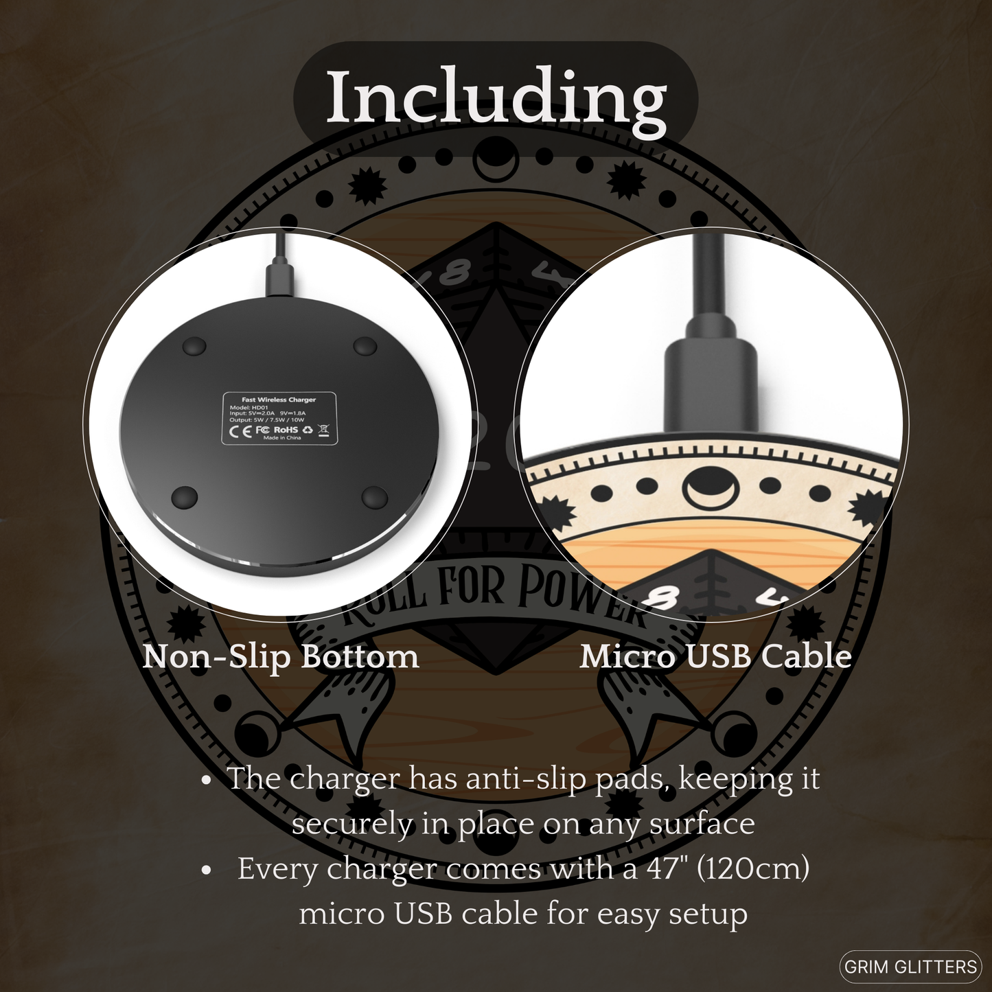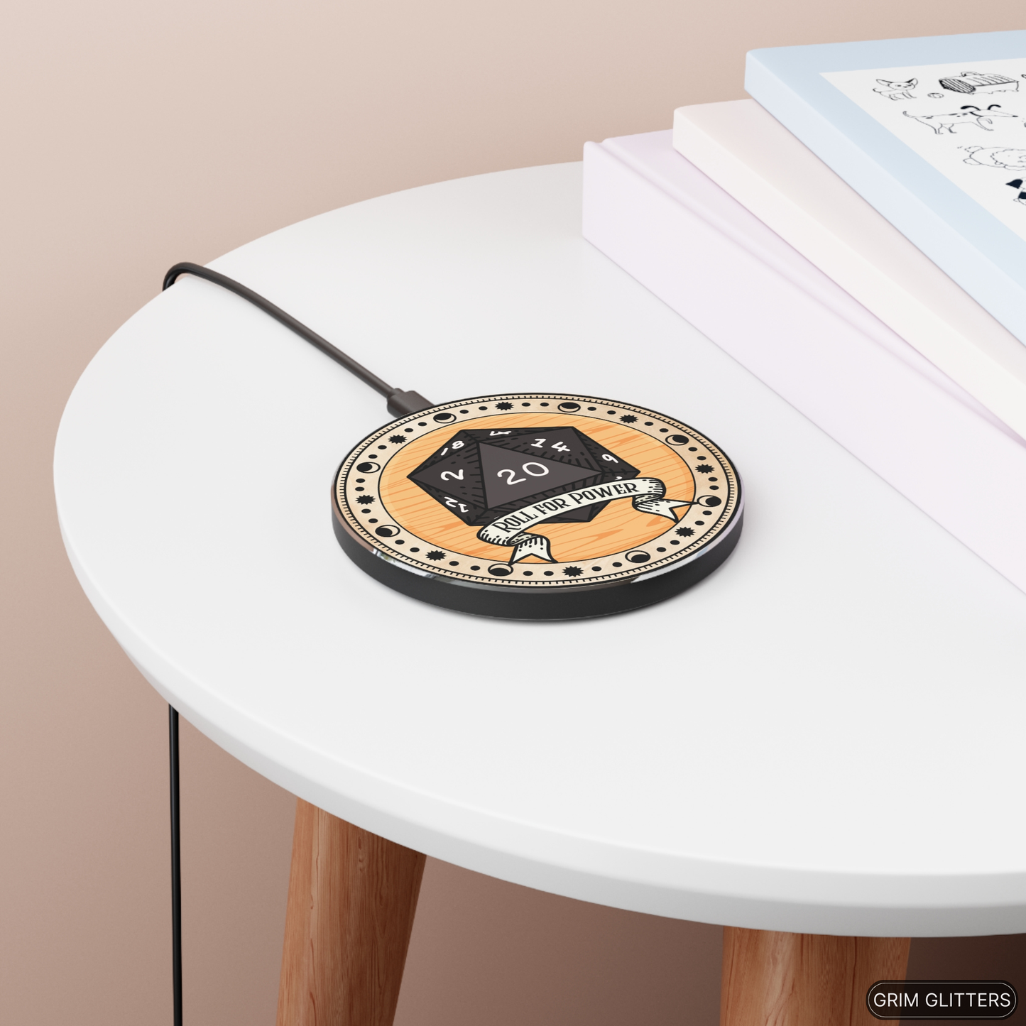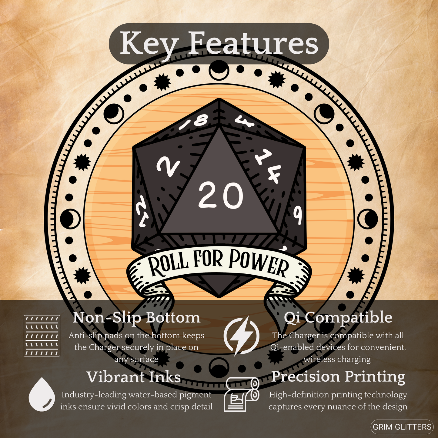 Elevate your gaming experience with the "Roll for Power" D20 Wireless Charger. This unique and functional accessory features a central D20 design, symbolizing the excitement of rolling for success. The wooden backdrop adds a touch of rustic charm, while the banner proudly proclaims "Roll for Power," encouraging you to seize the gaming moment.