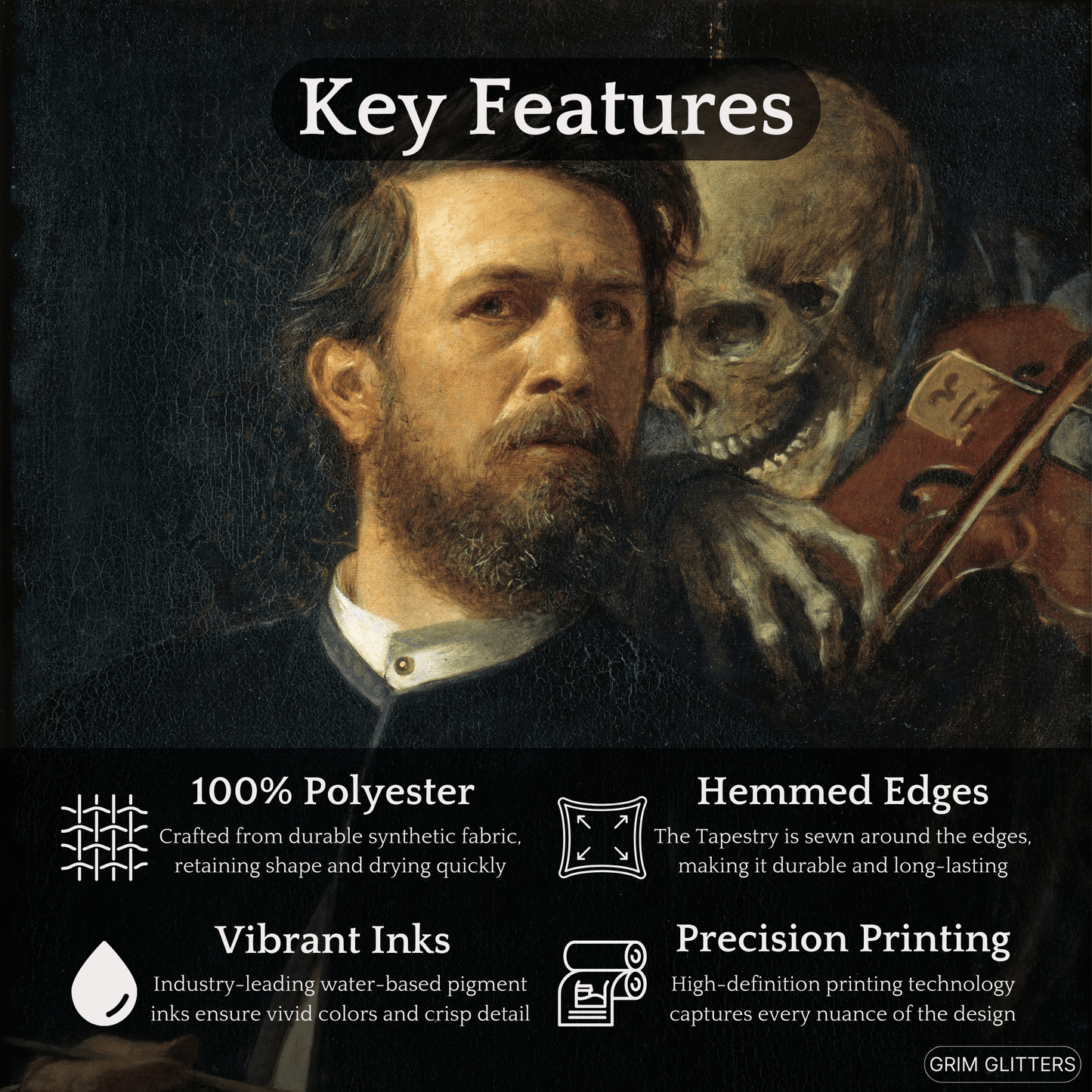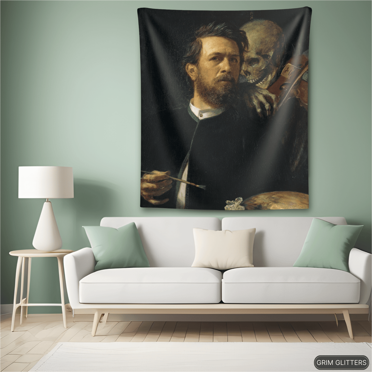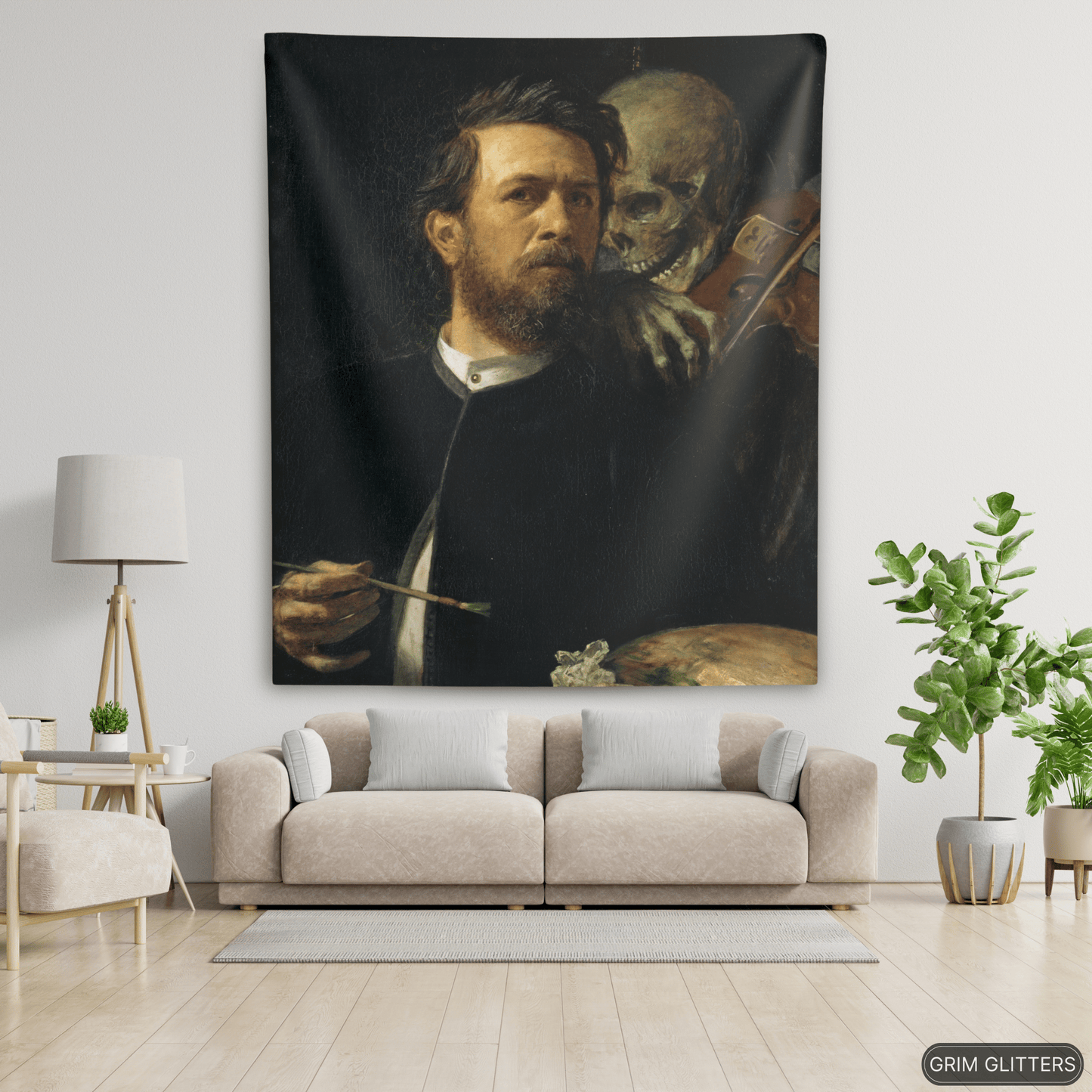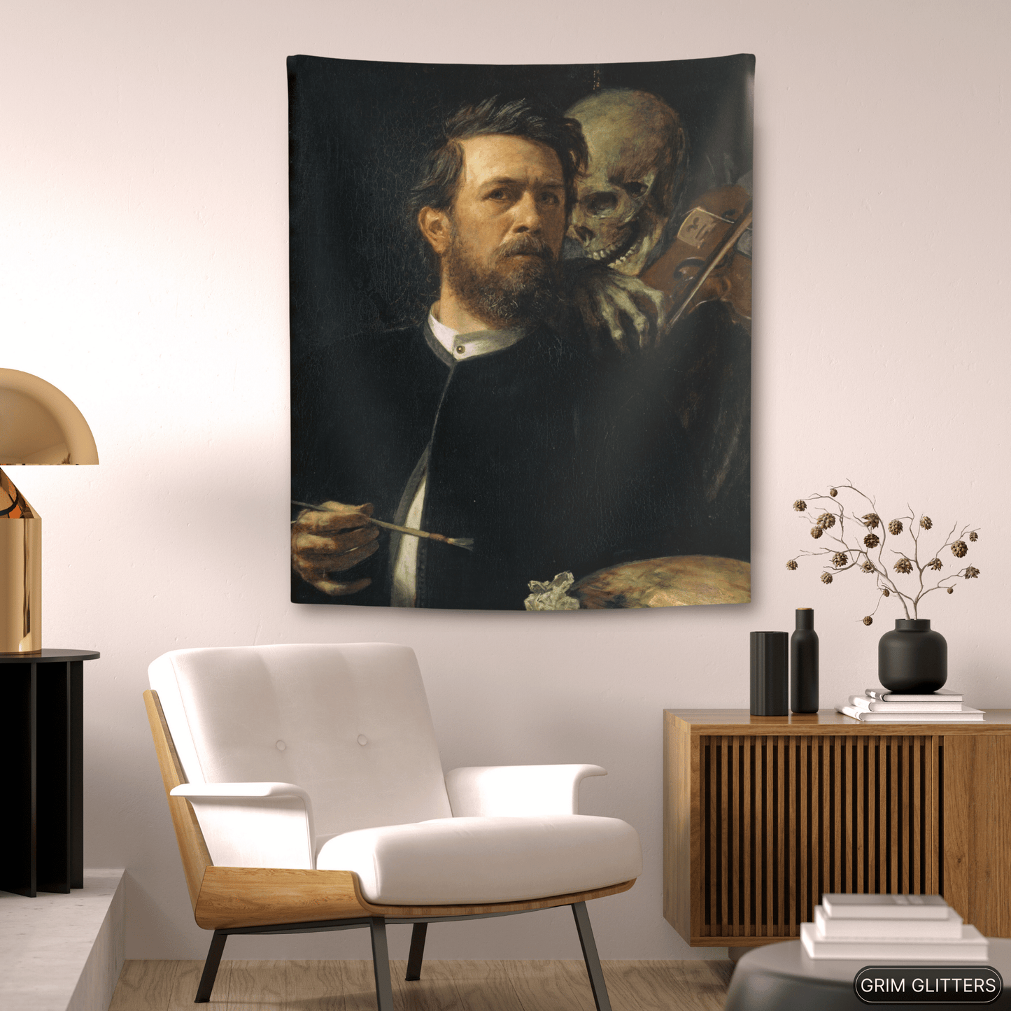 Invite a touch of dark elegance and historical significance into your home with the "Self-Portrait with Death Playing the Fiddle" tapestry, a timeless piece that resonates with the complexities of life and art.