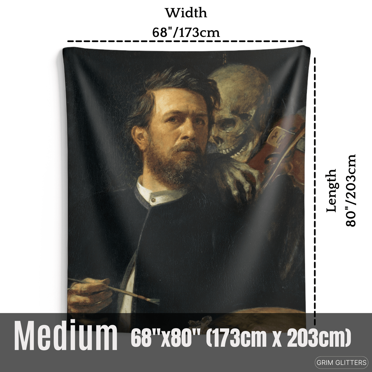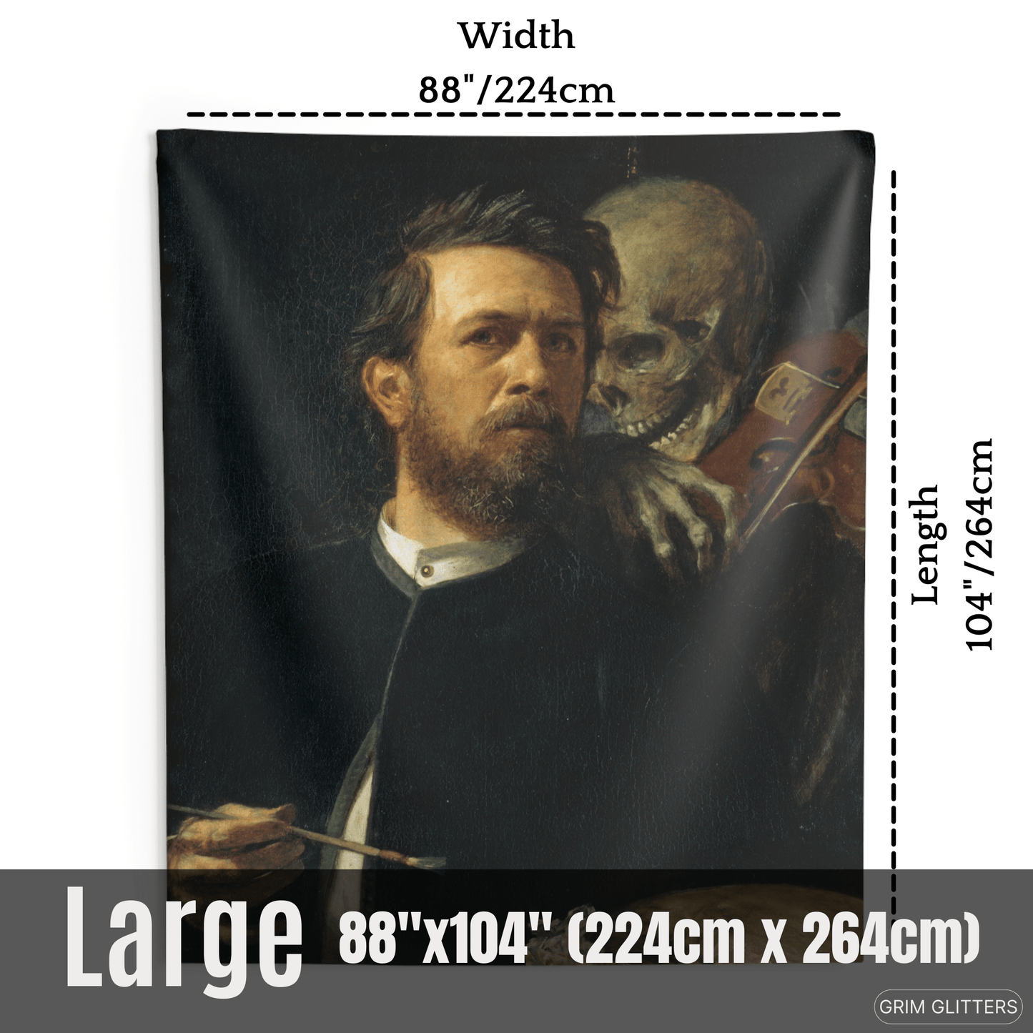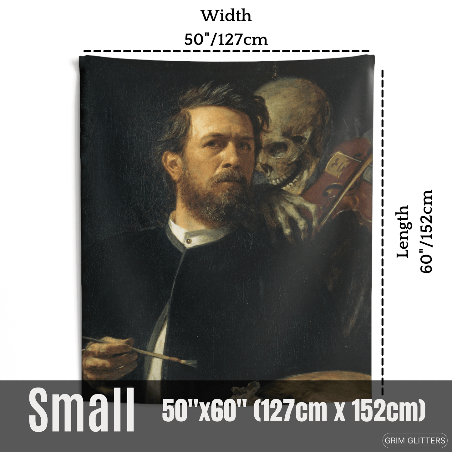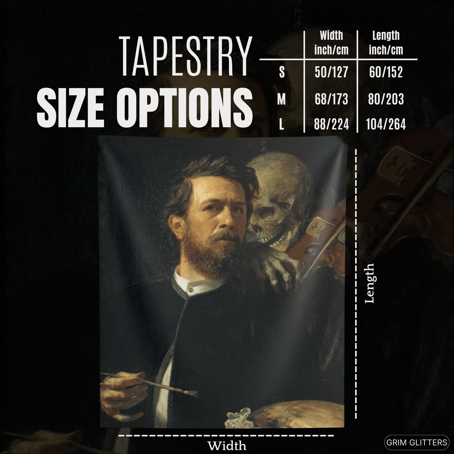 Invite a touch of dark elegance and historical significance into your home with the "Self-Portrait with Death Playing the Fiddle" tapestry, a timeless piece that resonates with the complexities of life and art.