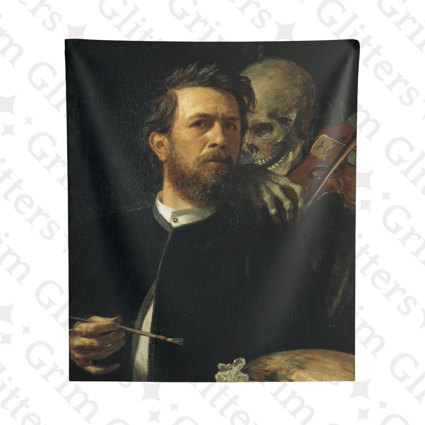 Immerse your home in the haunting beauty of Arnold Böcklin's "Self-Portrait with Death Playing the Fiddle" tapestry. This evocative piece of Gothic wall art captures the unsettling presence of Death, depicted as a skeletal figure playing a melancholy tune over Böcklin's shoulder. A masterpiece of Dark Romanticism, this tapestry brings an air of mystery and profound emotion to any space, making it perfect for those who appreciate the darker side of art.