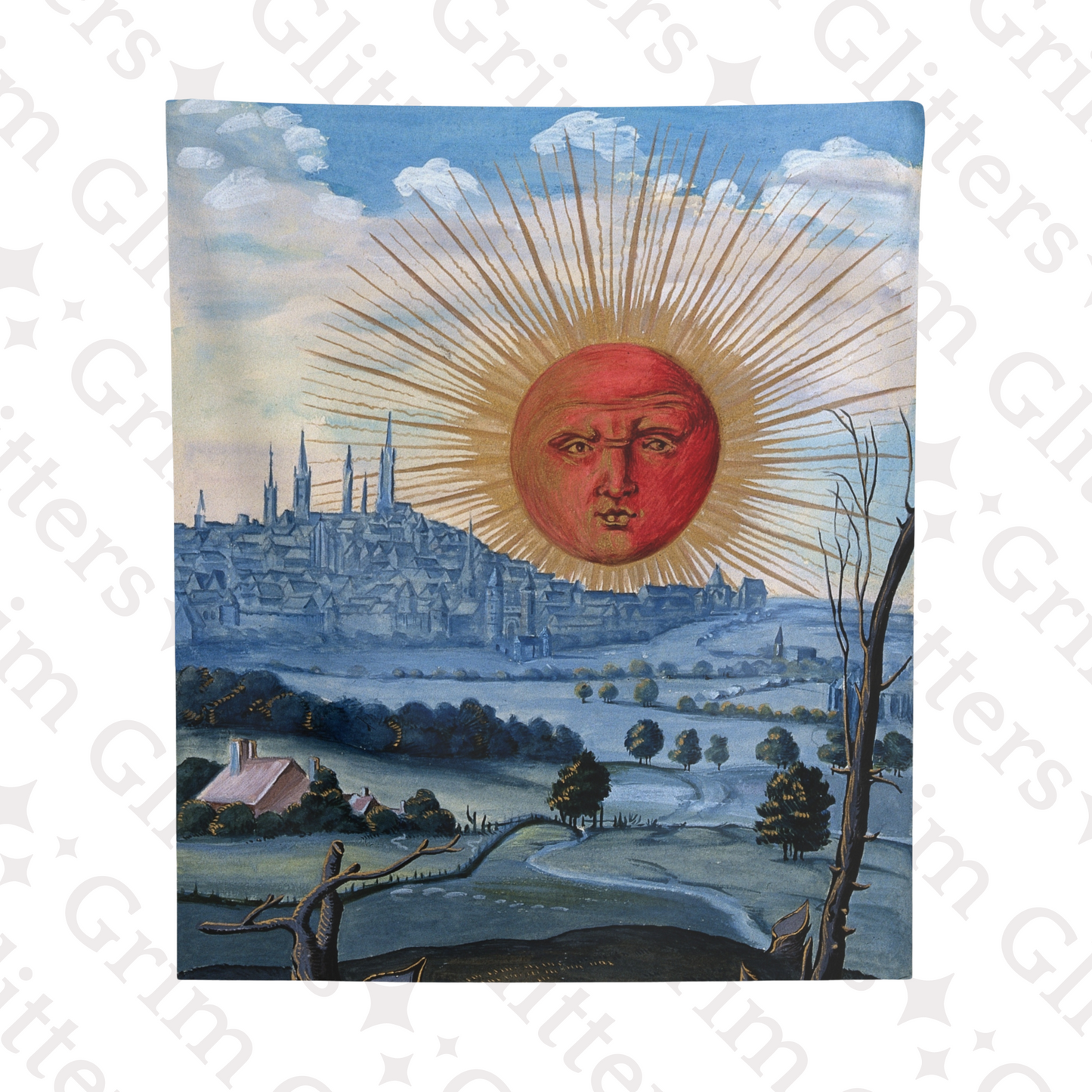 Dive into the intricate details of alchemical art with our faithful reproduction. The vibrant red sun, symbolizing transformation and enlightenment, rises above a mystical cityscape, rendered with precision and clarity.