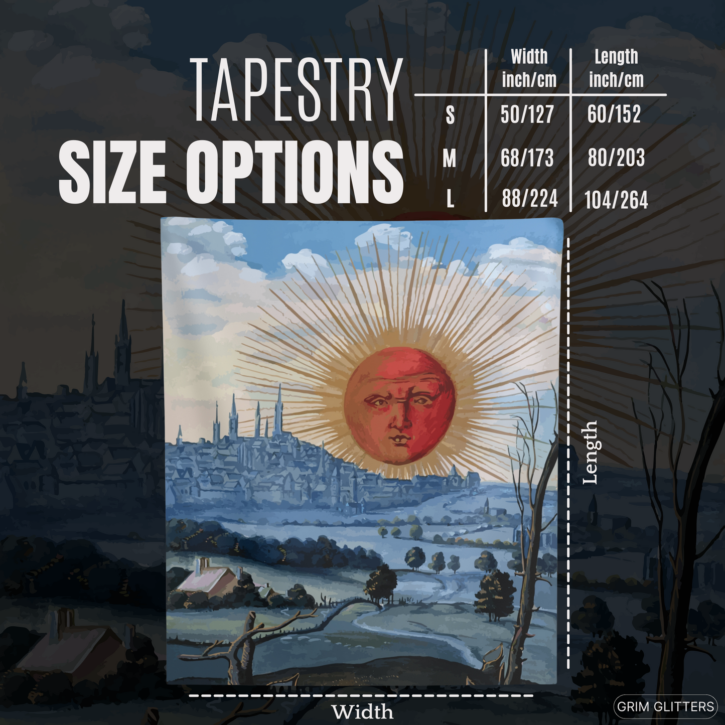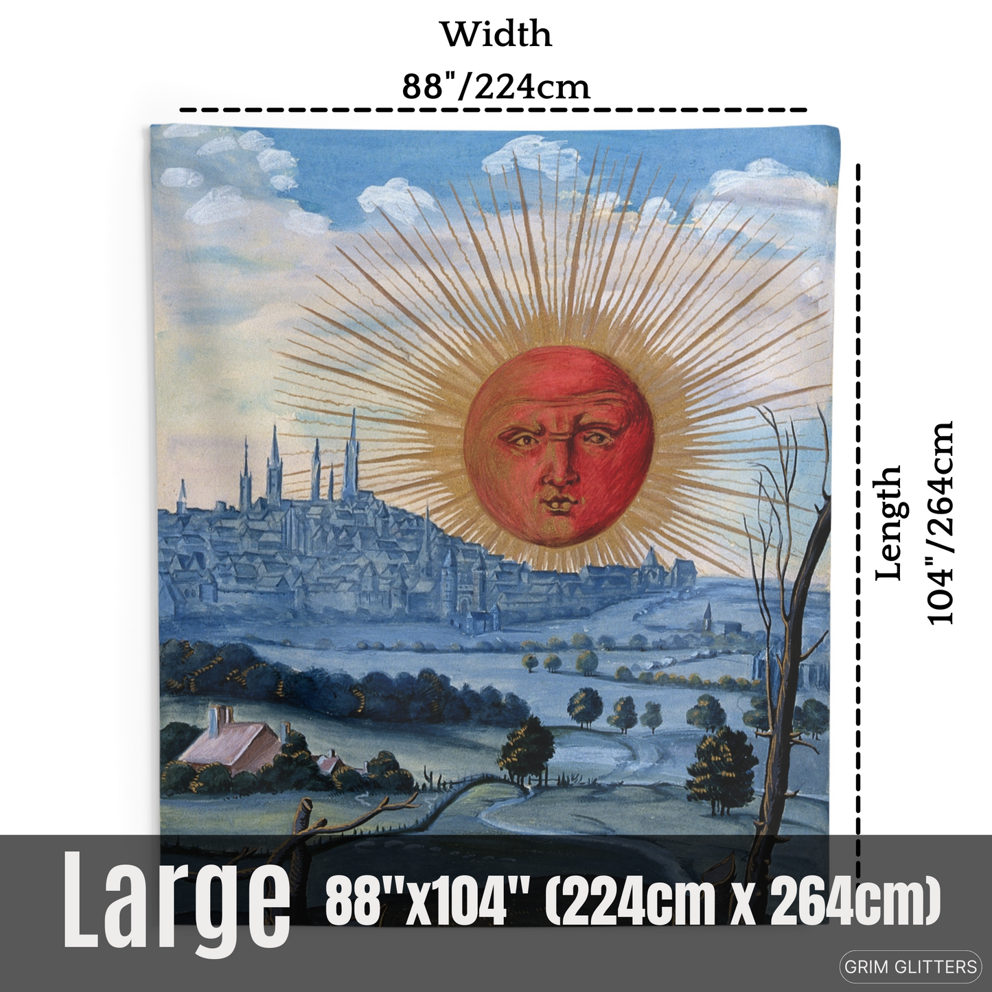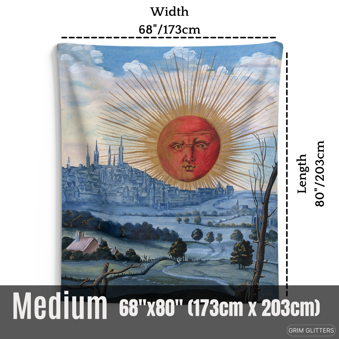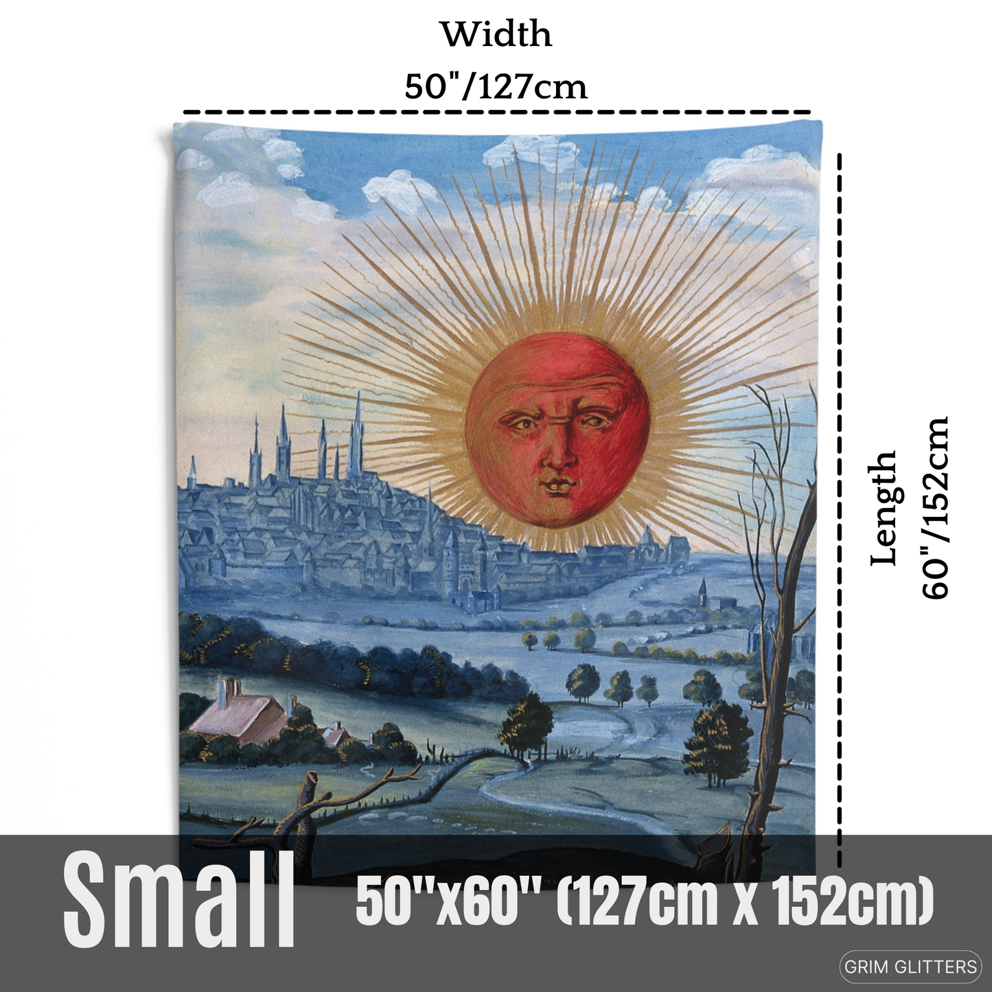 Available in multiple sizes, including 50" x 60'' (127cm x 152cm), 68'' x 80'' (173cm x 203cm), and 88'' x 104'' (224cm x 264cm), our 'Splendor Solis Tapestry - A Red Sun Rises' is a captivating addition to your mystical decor.