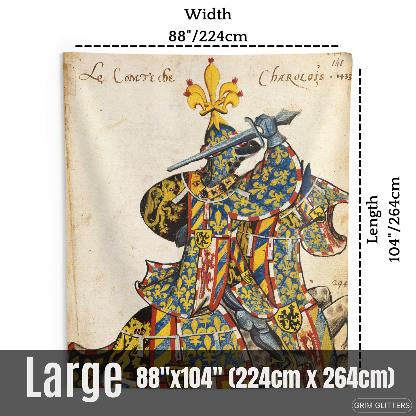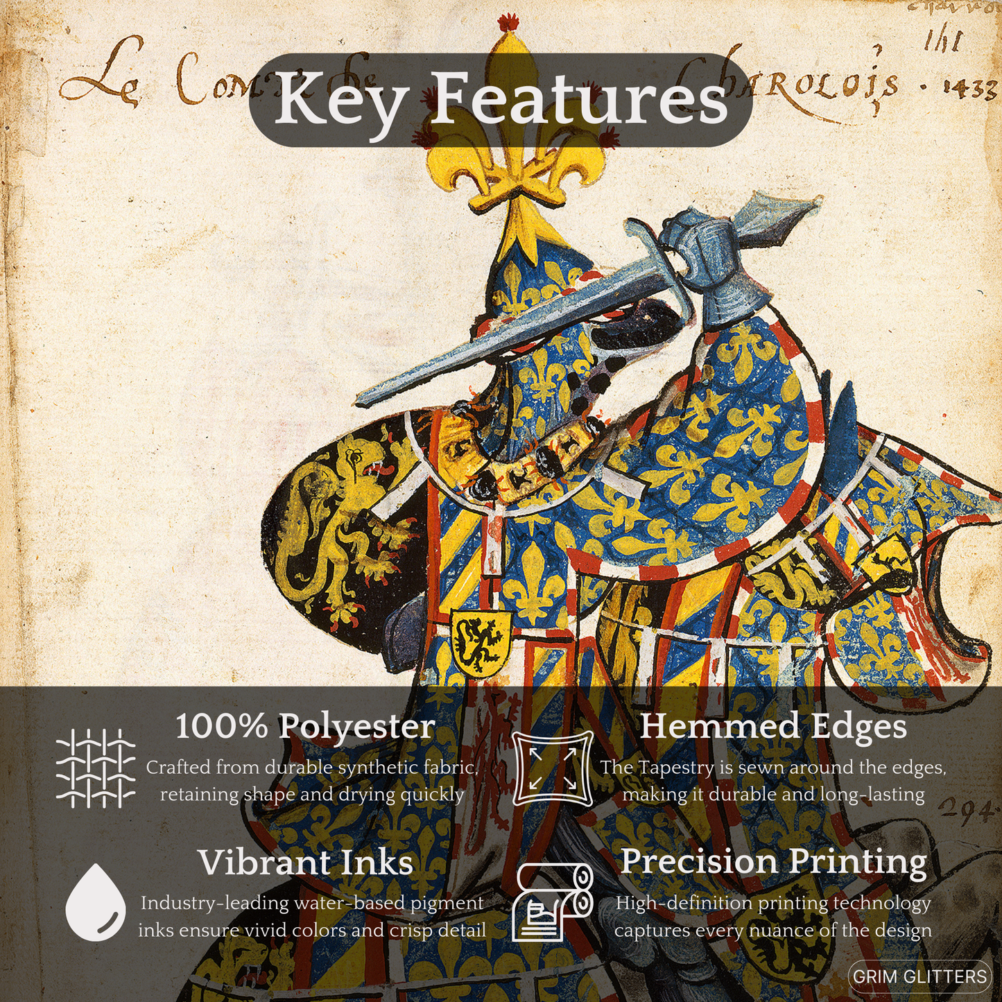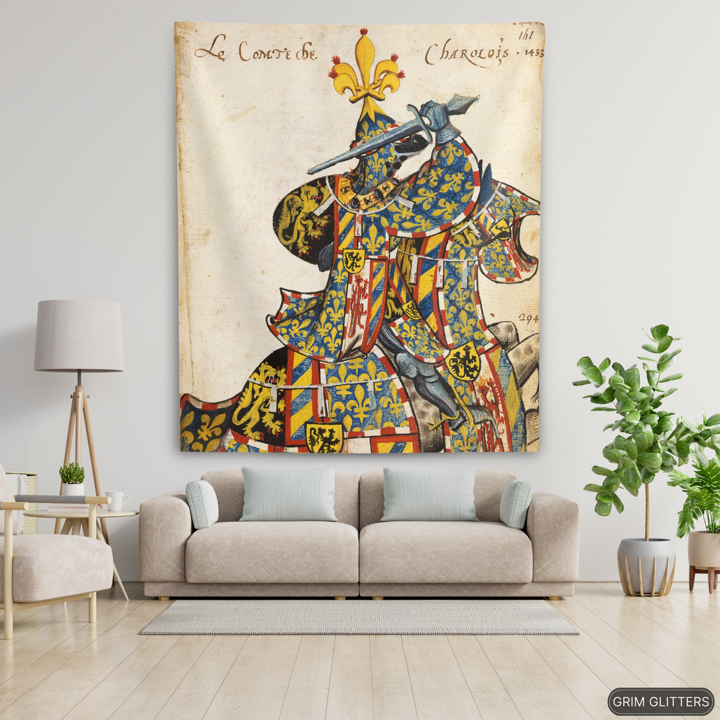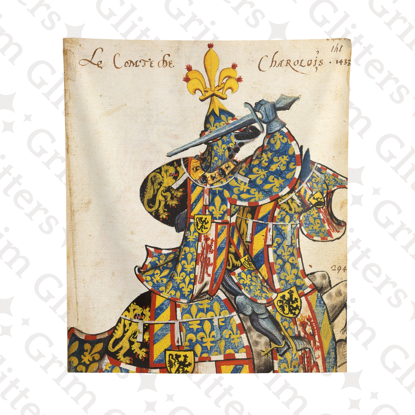 Honor the pageantry and power of medieval chivalry with The Count of Charolais Tapestry, inspired by the Great Equestrian Armorial of the Golden Fleece. This magnificent artwork depicts Charles of Burgundy, the Count of Charolais, resplendent in full jousting regalia. Draped in a lavish blue and gold fleur-de-lis surcoat, his armor and steed are further adorned with heraldic shields representing his noble lineage. This tapestry is a masterpiece of medieval heraldry, perfect for admirers of historic art, chivalric tradition, and medieval pageantry.