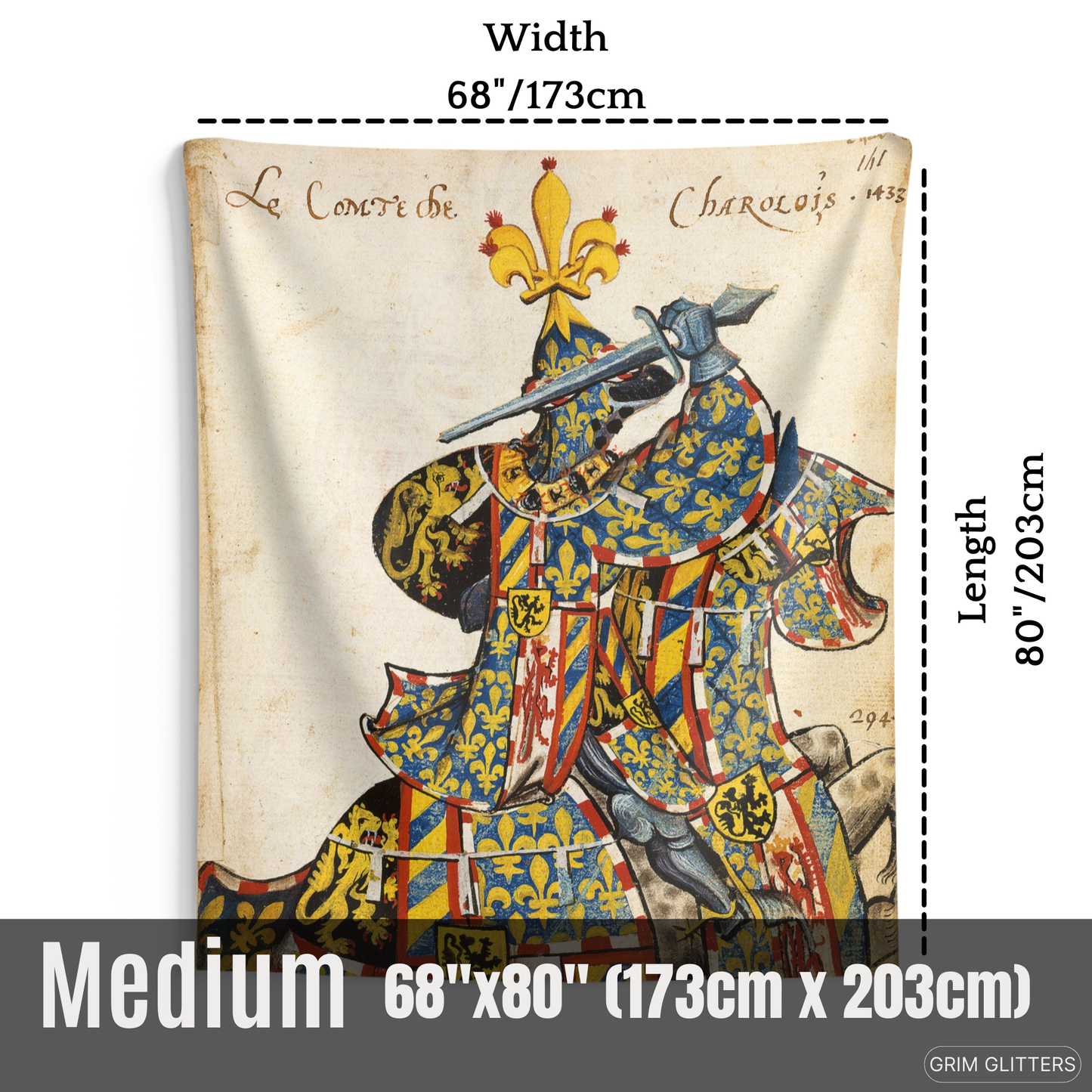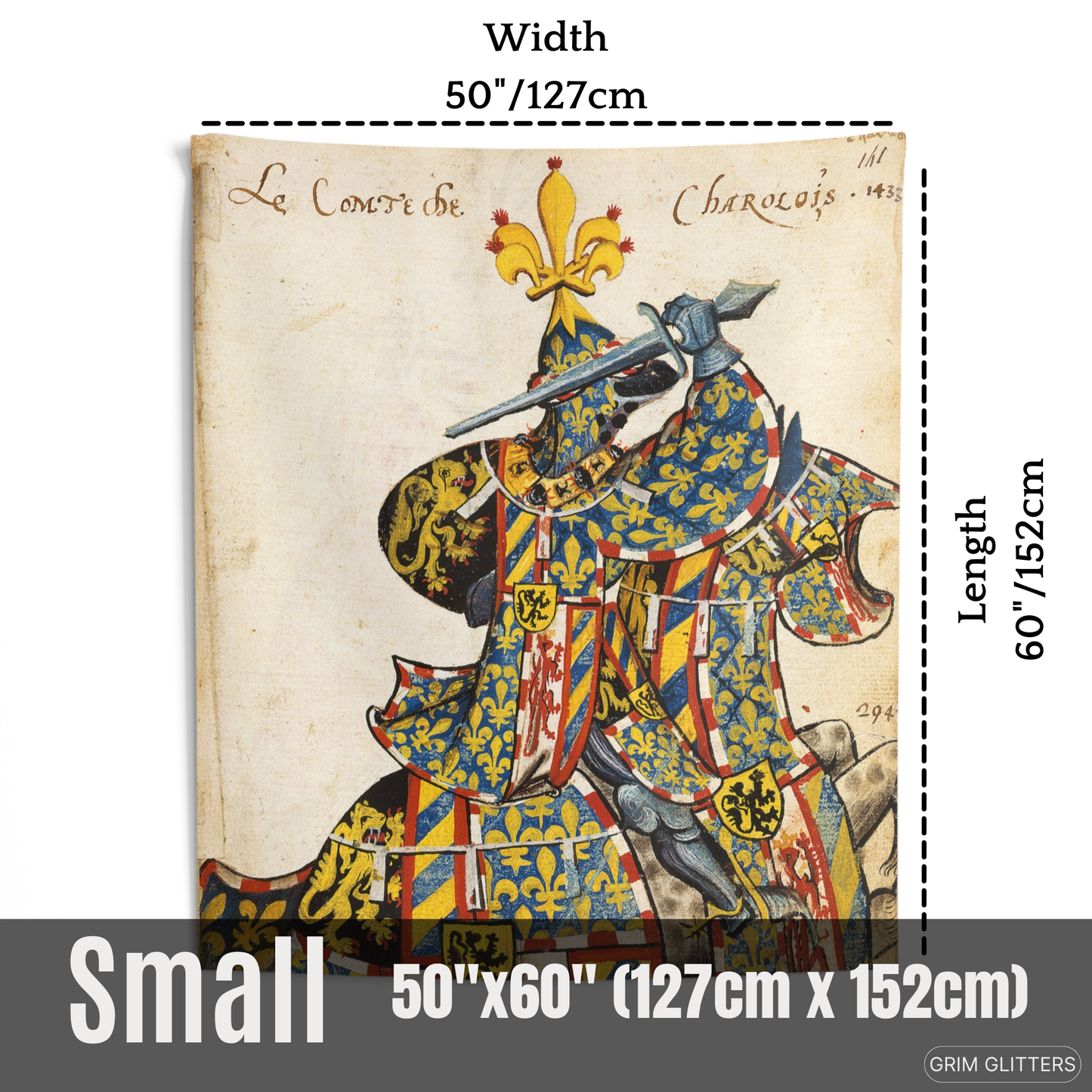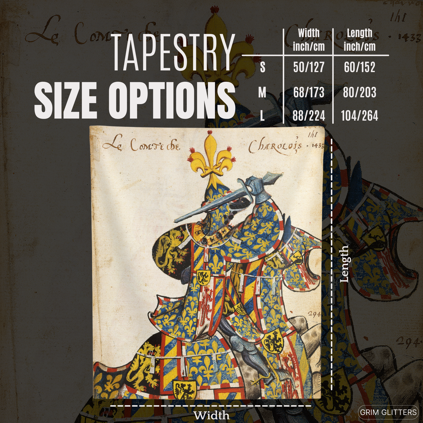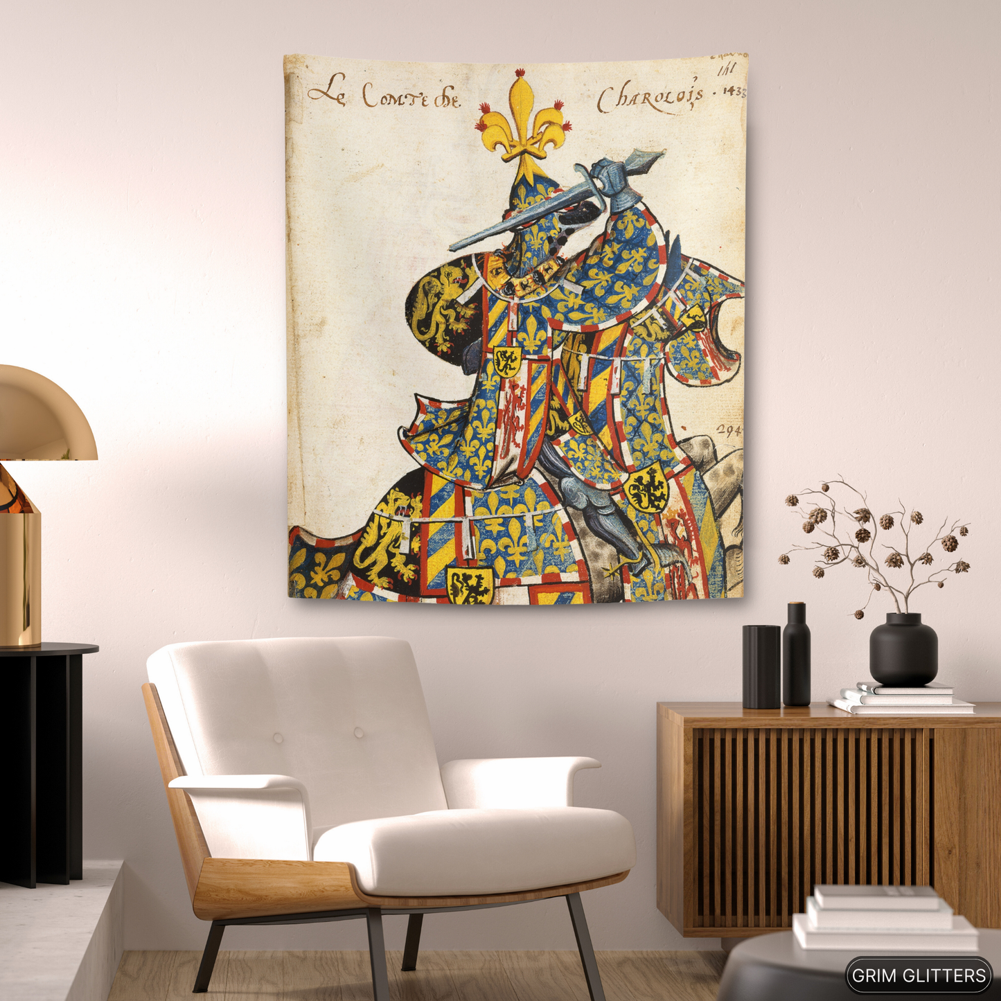 Honor the pageantry and power of medieval chivalry with The Count of Charolais Tapestry, inspired by the Great Equestrian Armorial of the Golden Fleece. This magnificent artwork depicts Charles of Burgundy, the Count of Charolais, resplendent in full jousting regalia. Draped in a lavish blue and gold fleur-de-lis surcoat, his armor and steed are further adorned with heraldic shields representing his noble lineage. This tapestry is a masterpiece of medieval heraldry, perfect for admirers of historic art, chivalric tradition, and medieval pageantry.