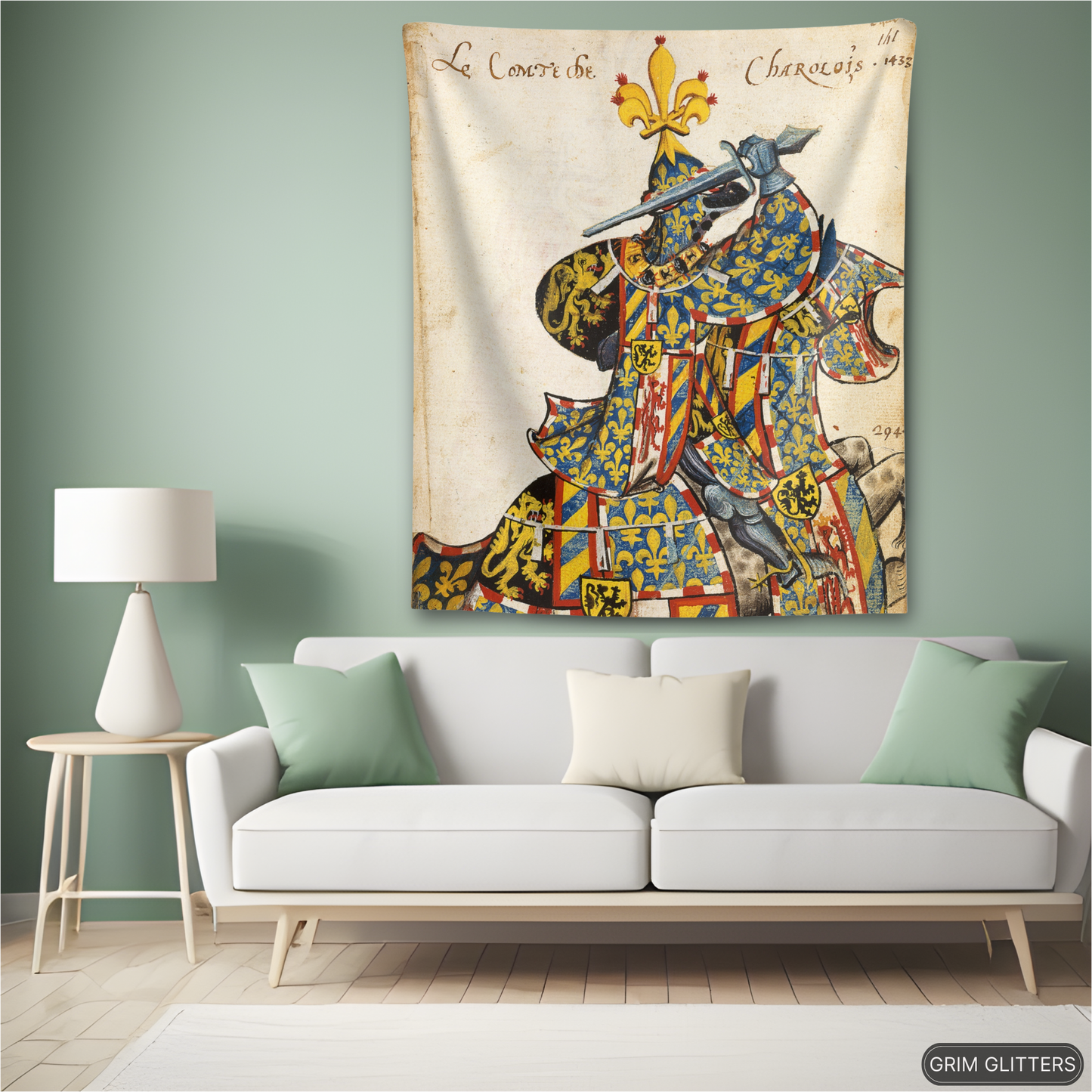 Bring the legacy of Charles of Burgundy into your home with The Count of Charolais Tapestry, a stunning tribute to medieval heraldry and the chivalric ideals of the Order of the Golden Fleece.