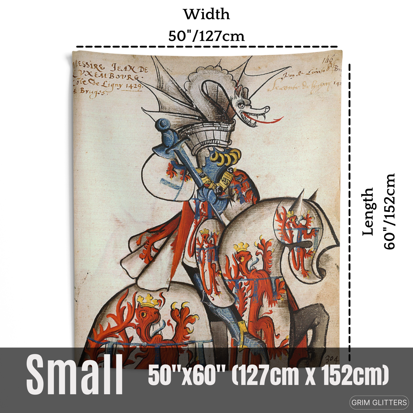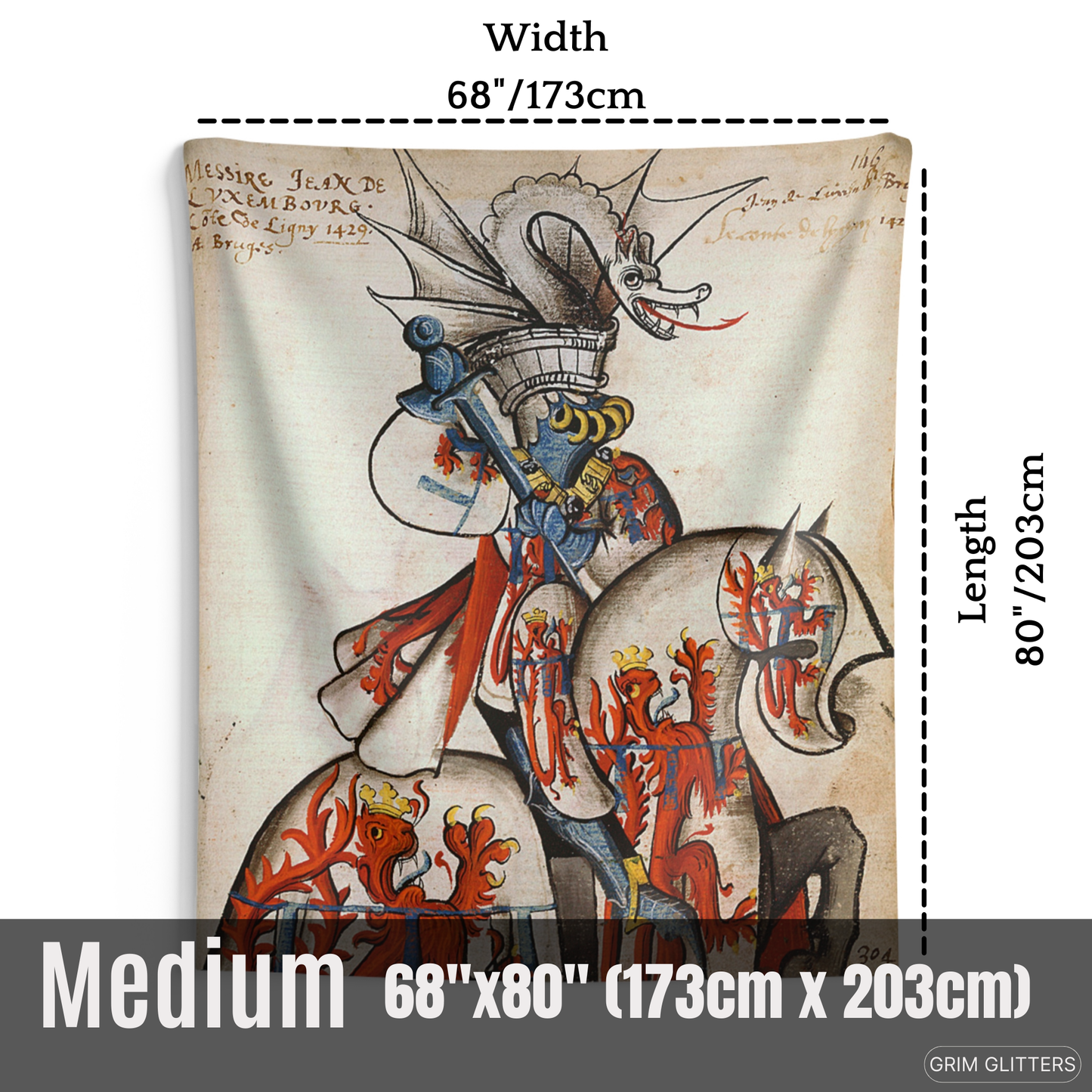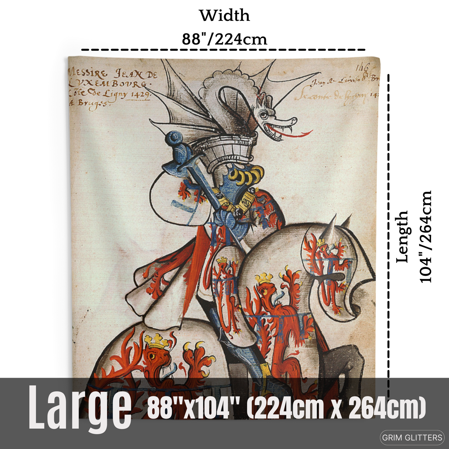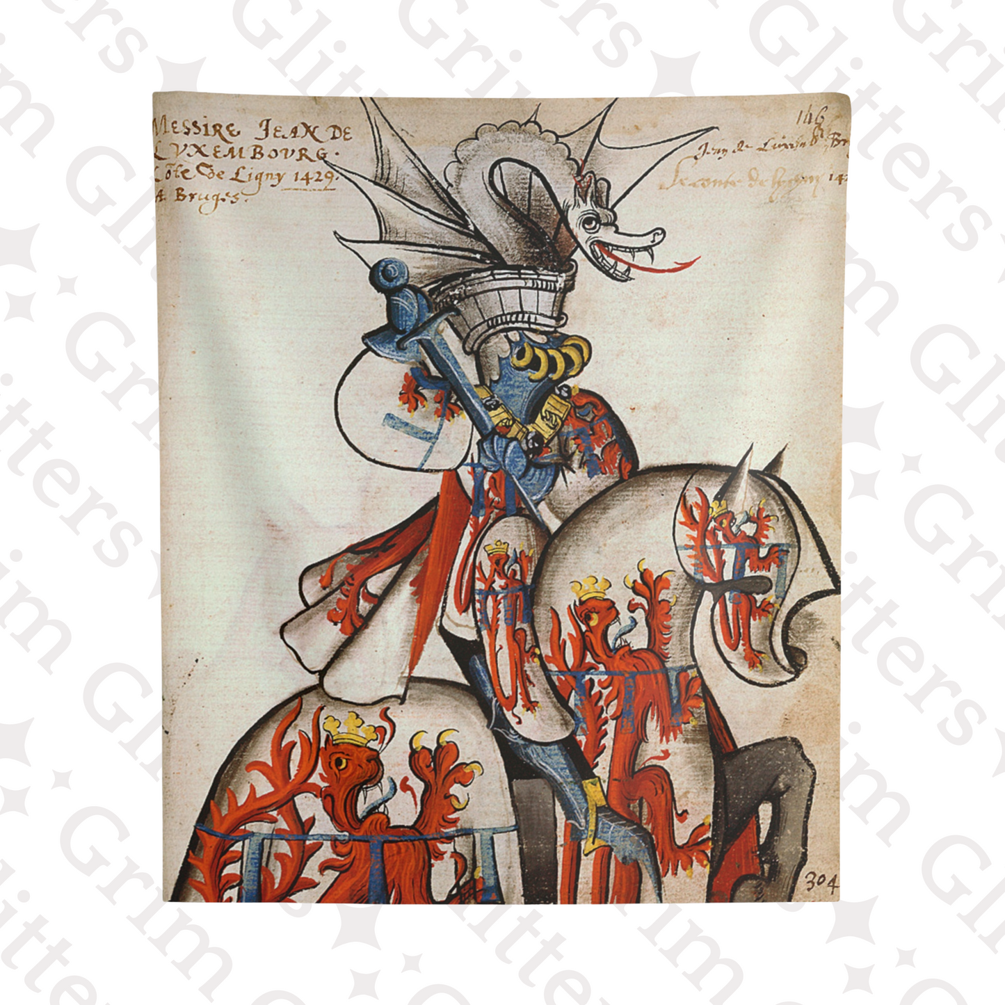 Adorn your space with the majestic elegance of medieval heraldry through The Count of Ligny Tapestry, inspired by the Great Equestrian Armorial of the Golden Fleece. This captivating artwork showcases Jean II de Luxembourg, Count of Ligny, in resplendent tournament armor, clad in silver jousting regalia adorned with crowned red lions, symbols of royal authority and strength. His ceremonial helm is surmounted by an elaborate silver dragon crest with outstretched wings and a fierce expression, adding an air of mythical power. His steed, draped in matching heraldic caparison, echoes the noble motifs, making this tapestry a powerful tribute to medieval chivalry and aristocratic tradition.