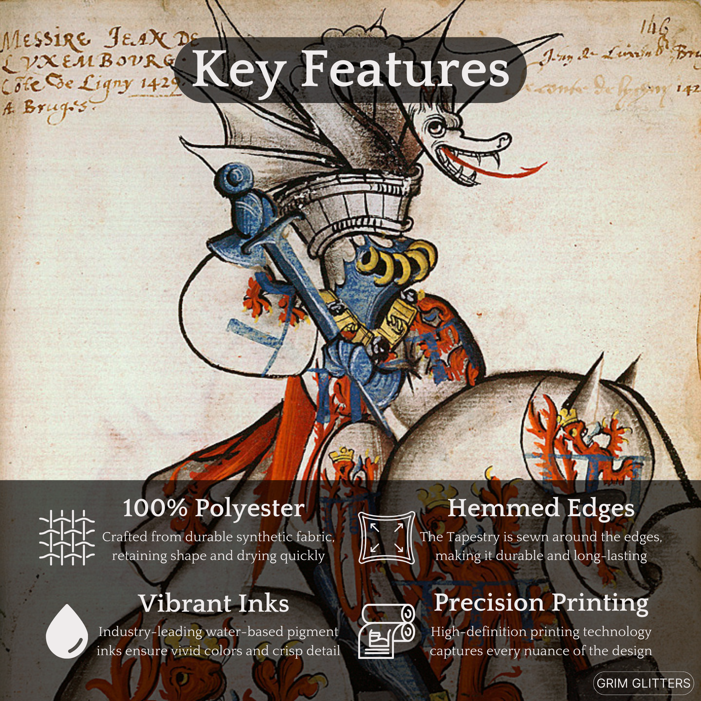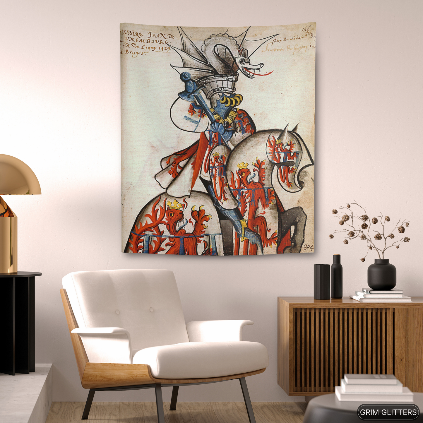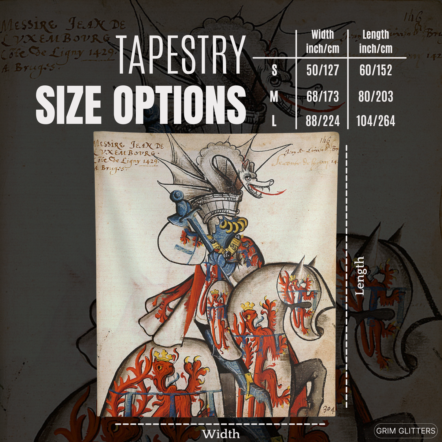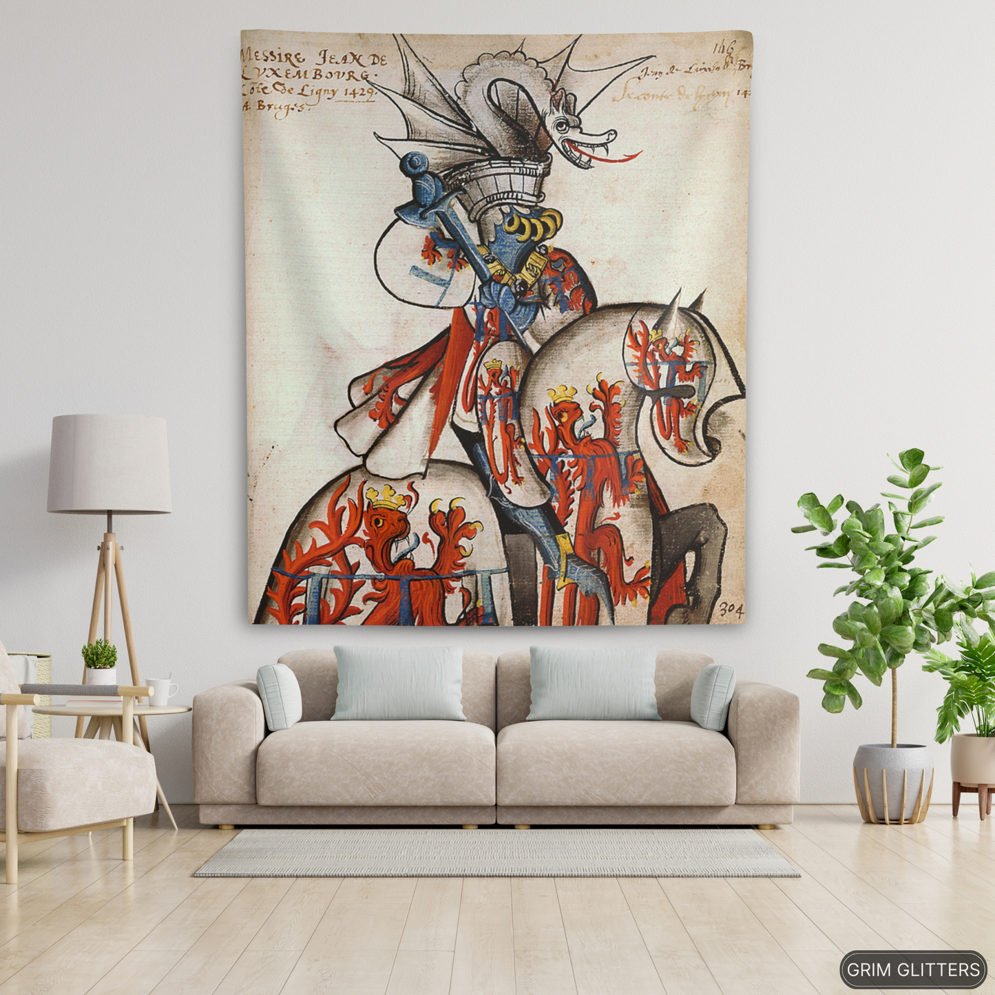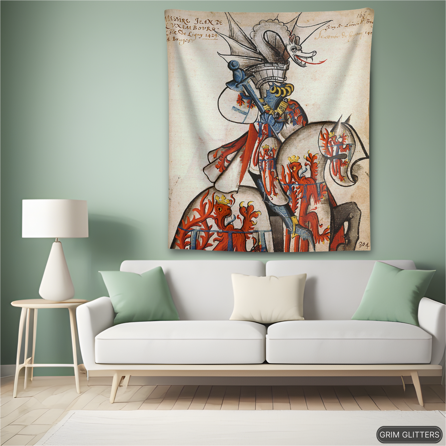 Adorn your space with the majestic elegance of medieval heraldry through The Count of Ligny Tapestry, inspired by the Great Equestrian Armorial of the Golden Fleece. This captivating artwork showcases Jean II de Luxembourg, Count of Ligny, in resplendent tournament armor, clad in silver jousting regalia adorned with crowned red lions, symbols of royal authority and strength. His ceremonial helm is surmounted by an elaborate silver dragon crest with outstretched wings and a fierce expression, adding an air of mythical power. His steed, draped in matching heraldic caparison, echoes the noble motifs, making this tapestry a powerful tribute to medieval chivalry and aristocratic tradition.
