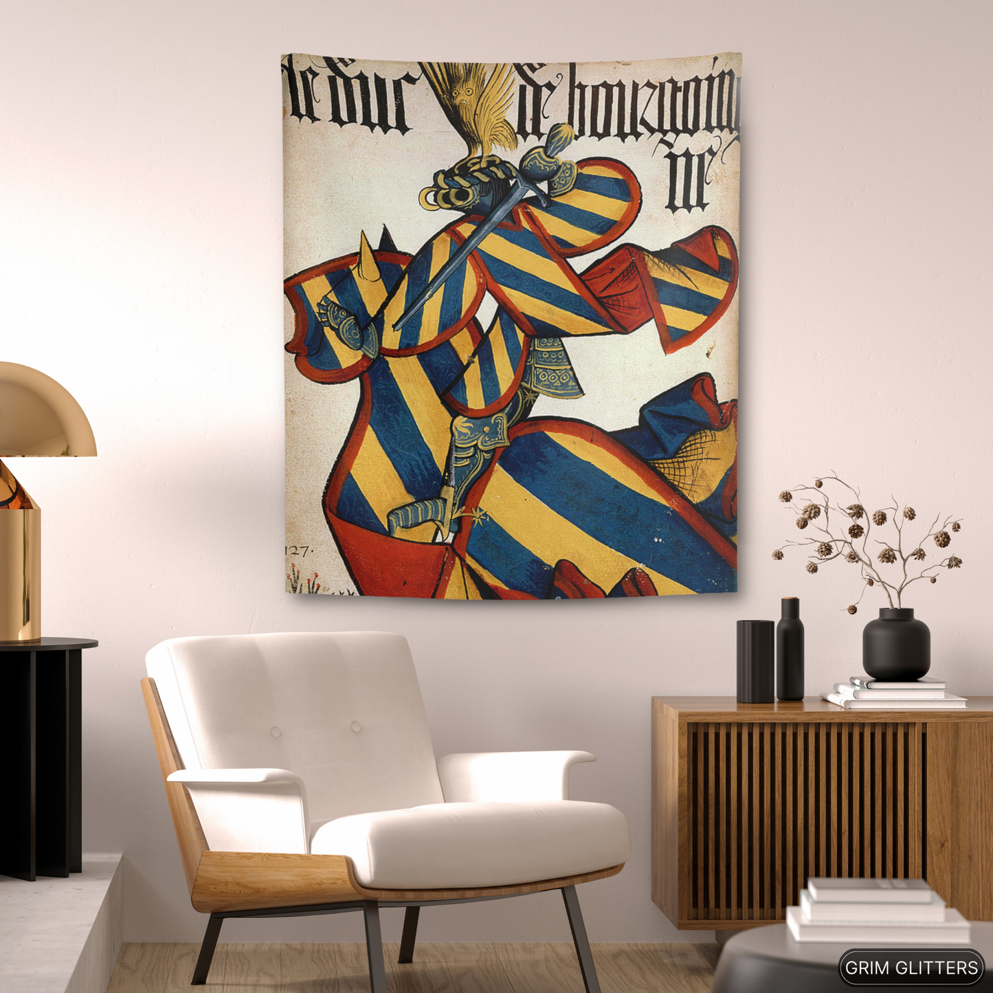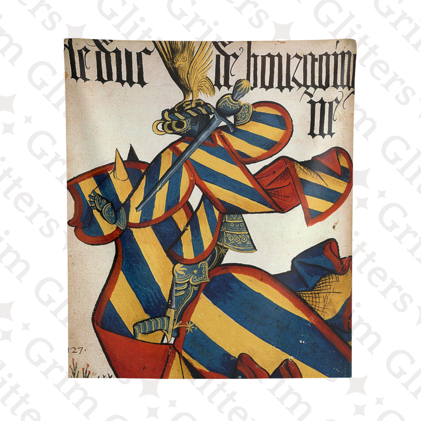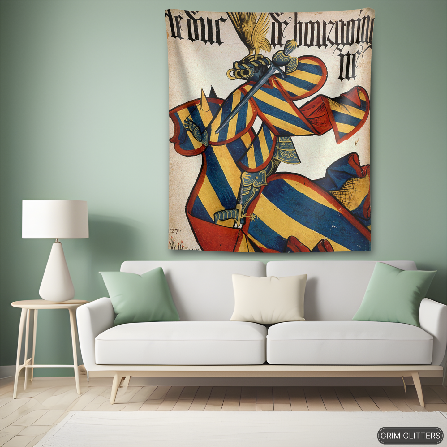 Bring the majesty of medieval heraldry into your space with The Duke of Burgundy Tapestry, inspired by the Great Equestrian Armorial of the Golden Fleece. This striking artwork showcases the Duke of Burgundy clad in magnificent blue and gold striped jousting regalia, with his horse in matching caparison. His ceremonial helm is crowned with an imposing large bird, adding to the grandeur of his noble status. A true masterpiece of medieval pageantry, this tapestry is perfect for history enthusiasts, heraldic art lovers, and those drawn to the splendor of medieval Europe.