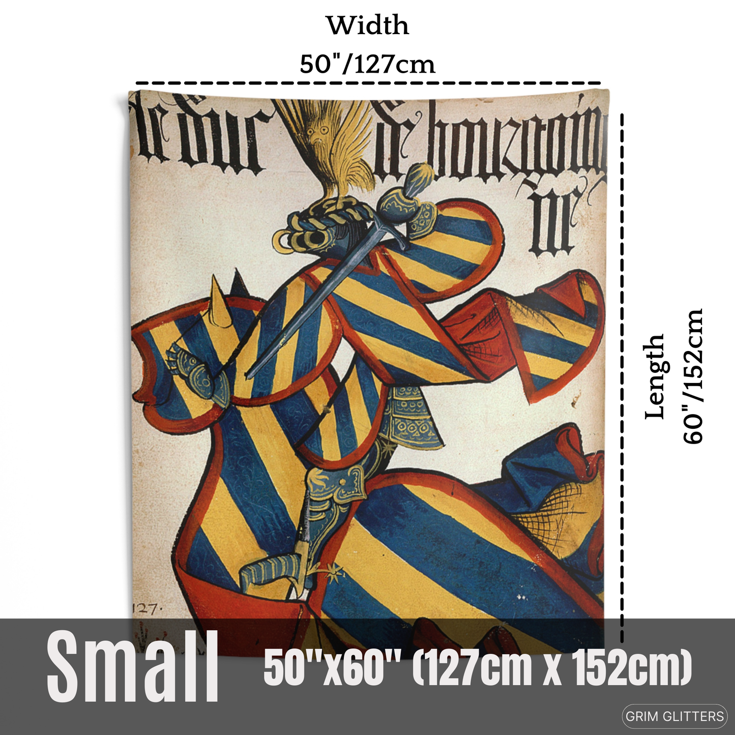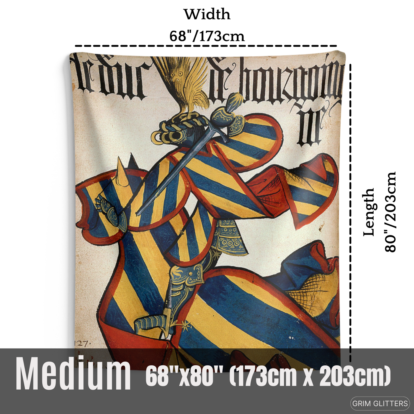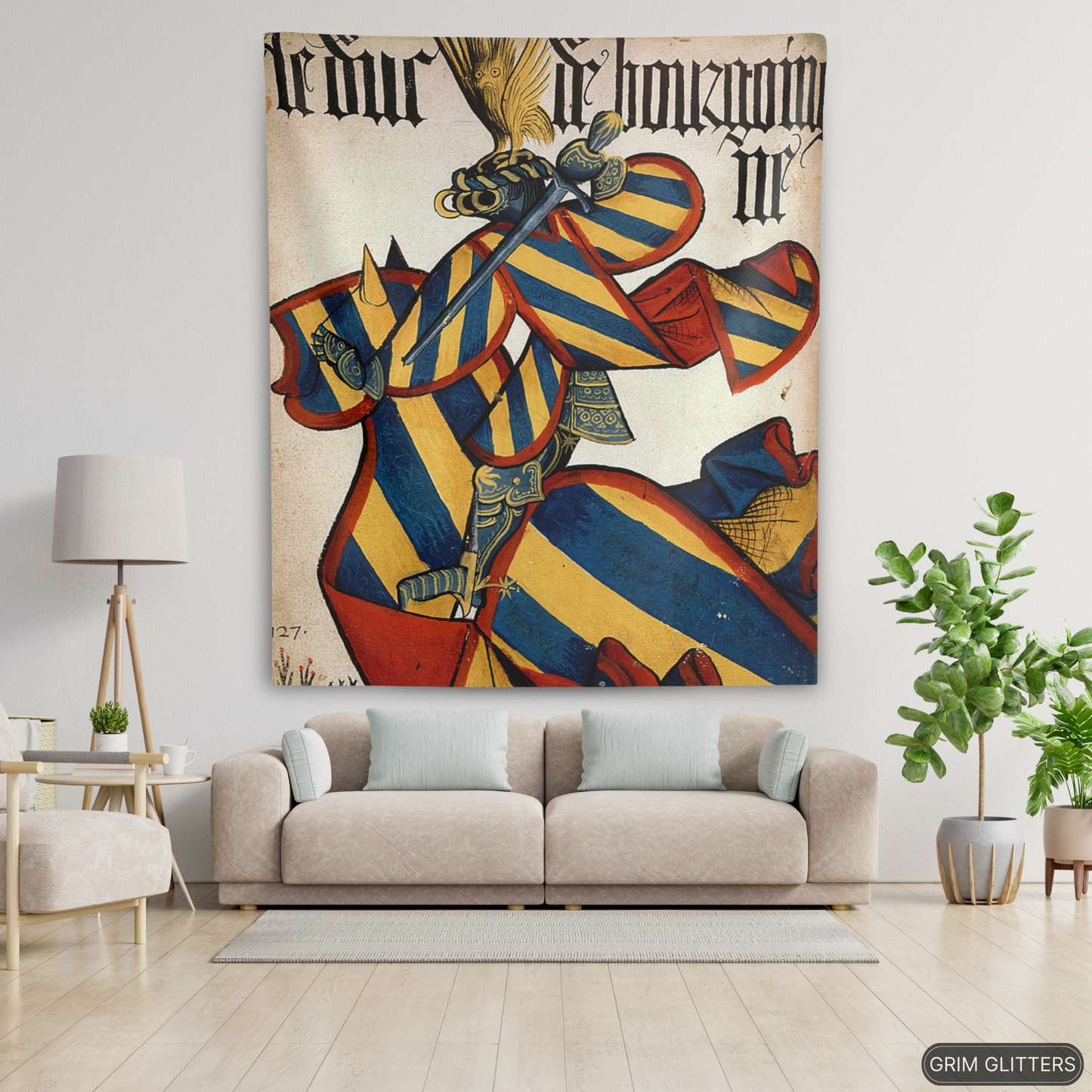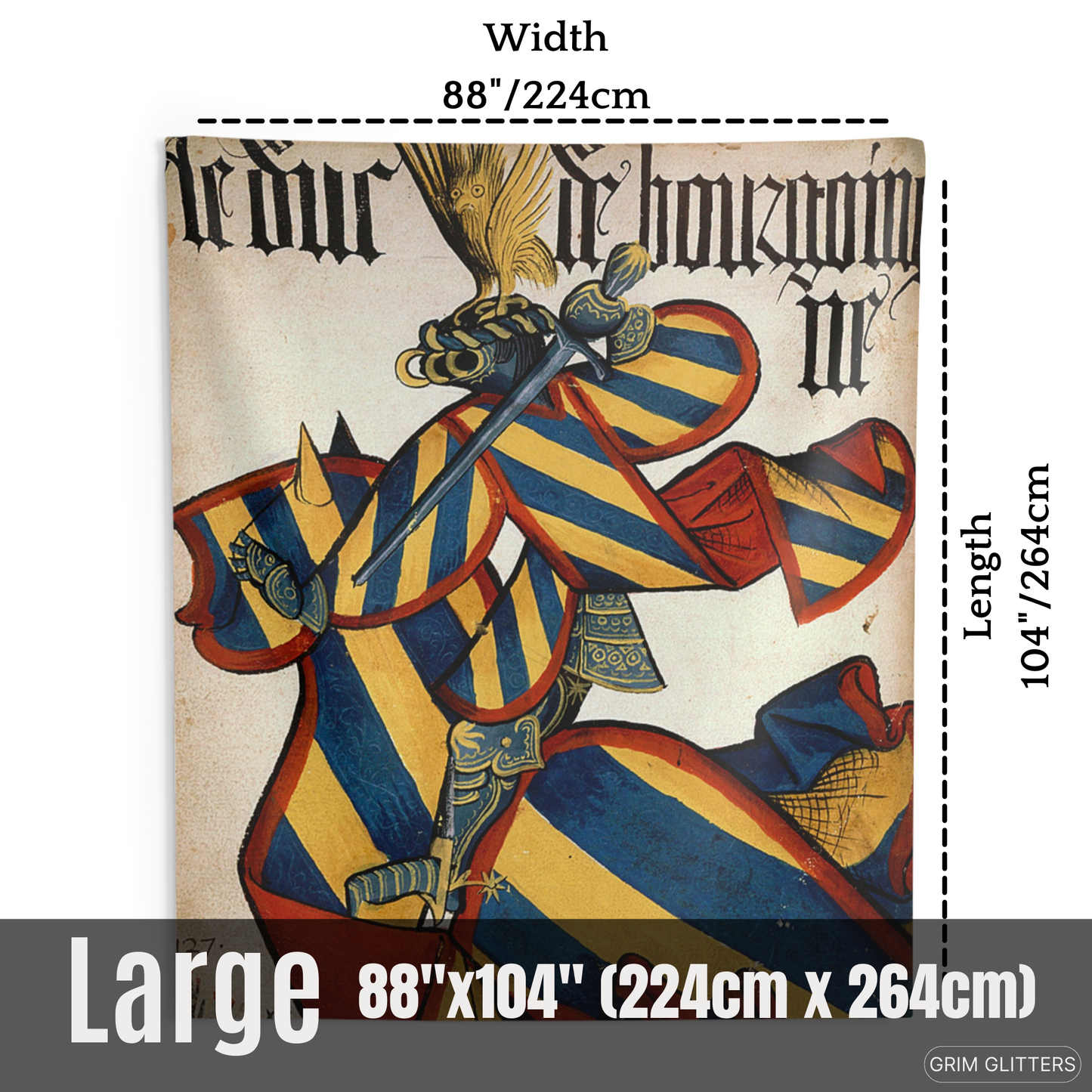 Bring the majesty of medieval heraldry into your space with The Duke of Burgundy Tapestry, inspired by the Great Equestrian Armorial of the Golden Fleece. This striking artwork showcases the Duke of Burgundy clad in magnificent blue and gold striped jousting regalia, with his horse in matching caparison. His ceremonial helm is crowned with an imposing large bird, adding to the grandeur of his noble status. A true masterpiece of medieval pageantry, this tapestry is perfect for history enthusiasts, heraldic art lovers, and those drawn to the splendor of medieval Europe.
