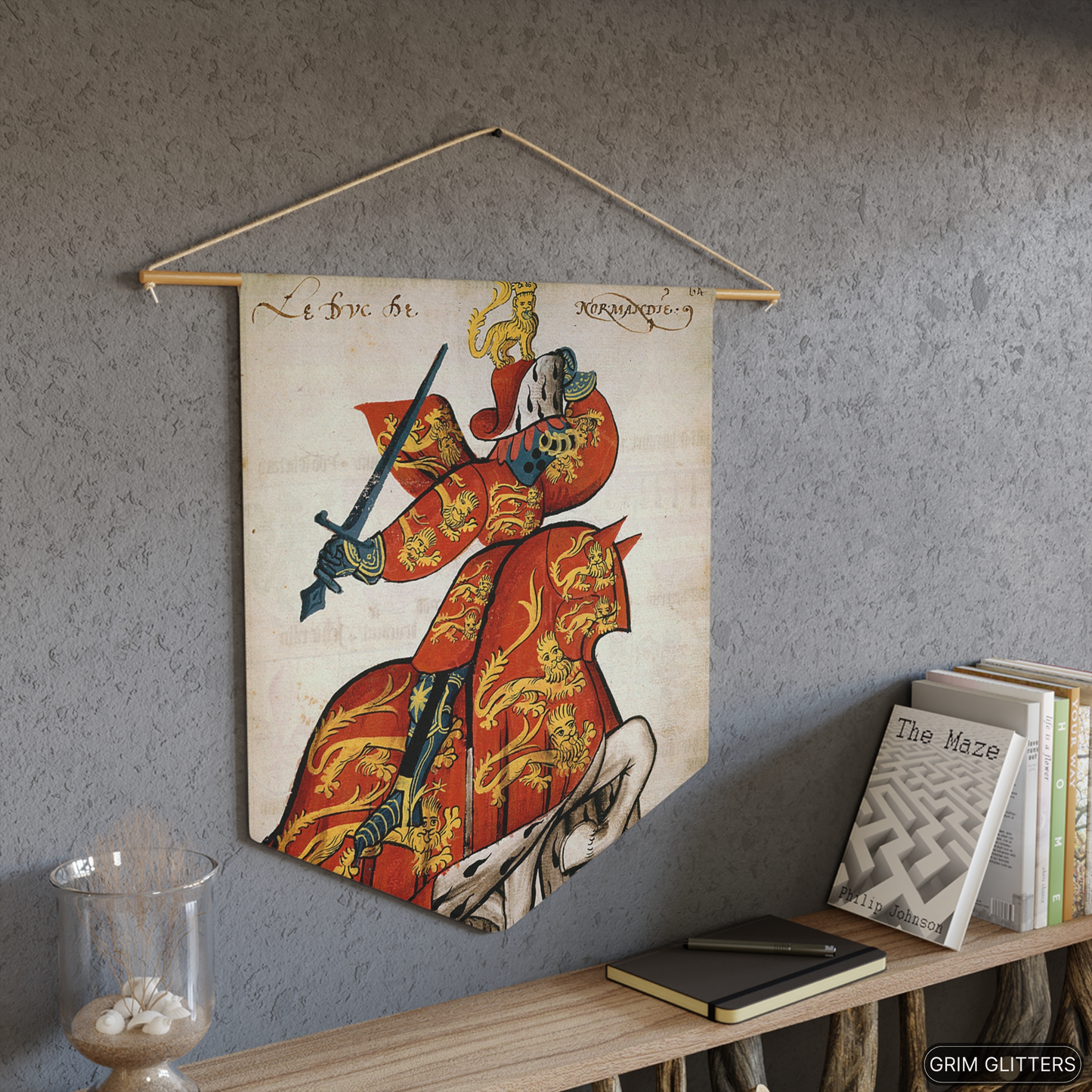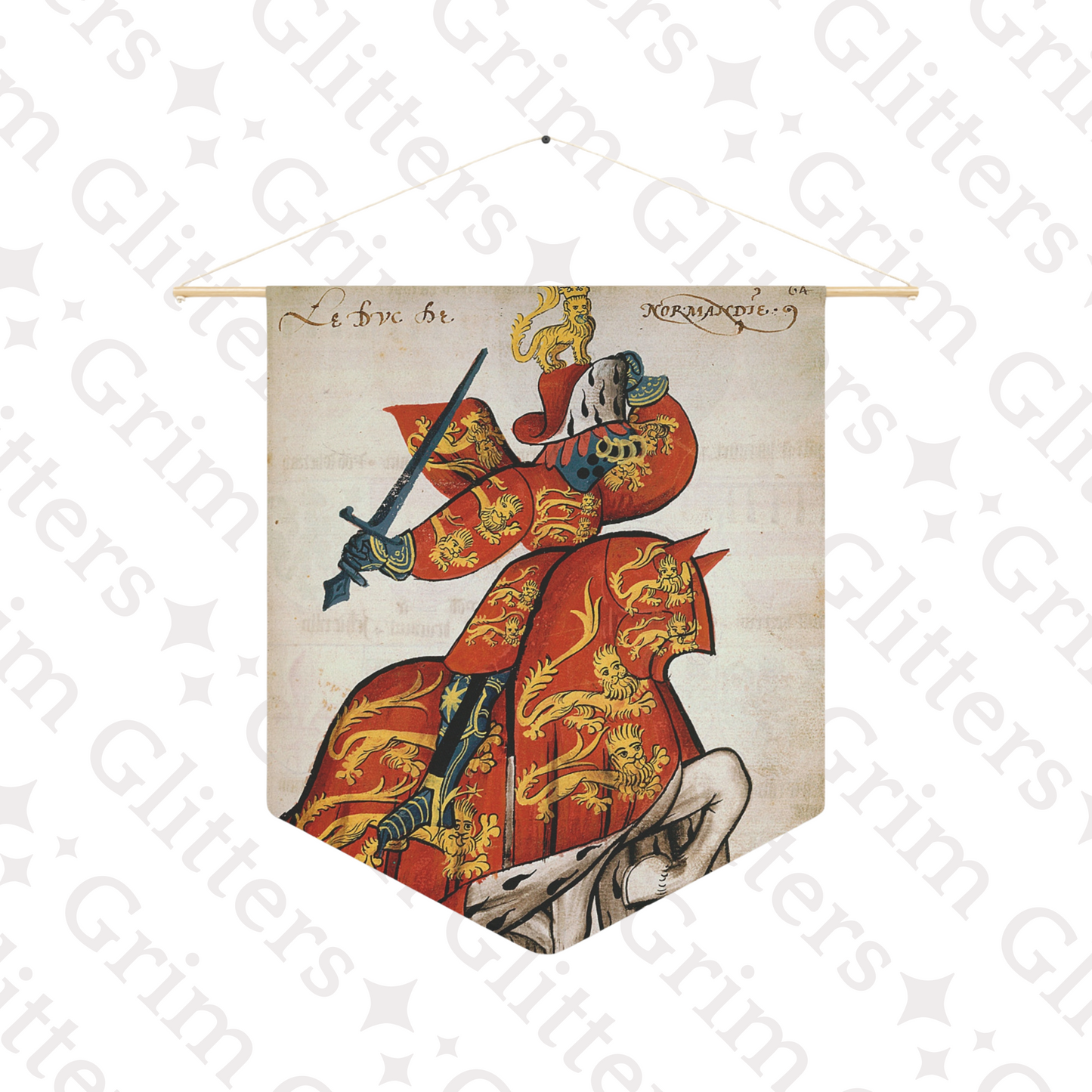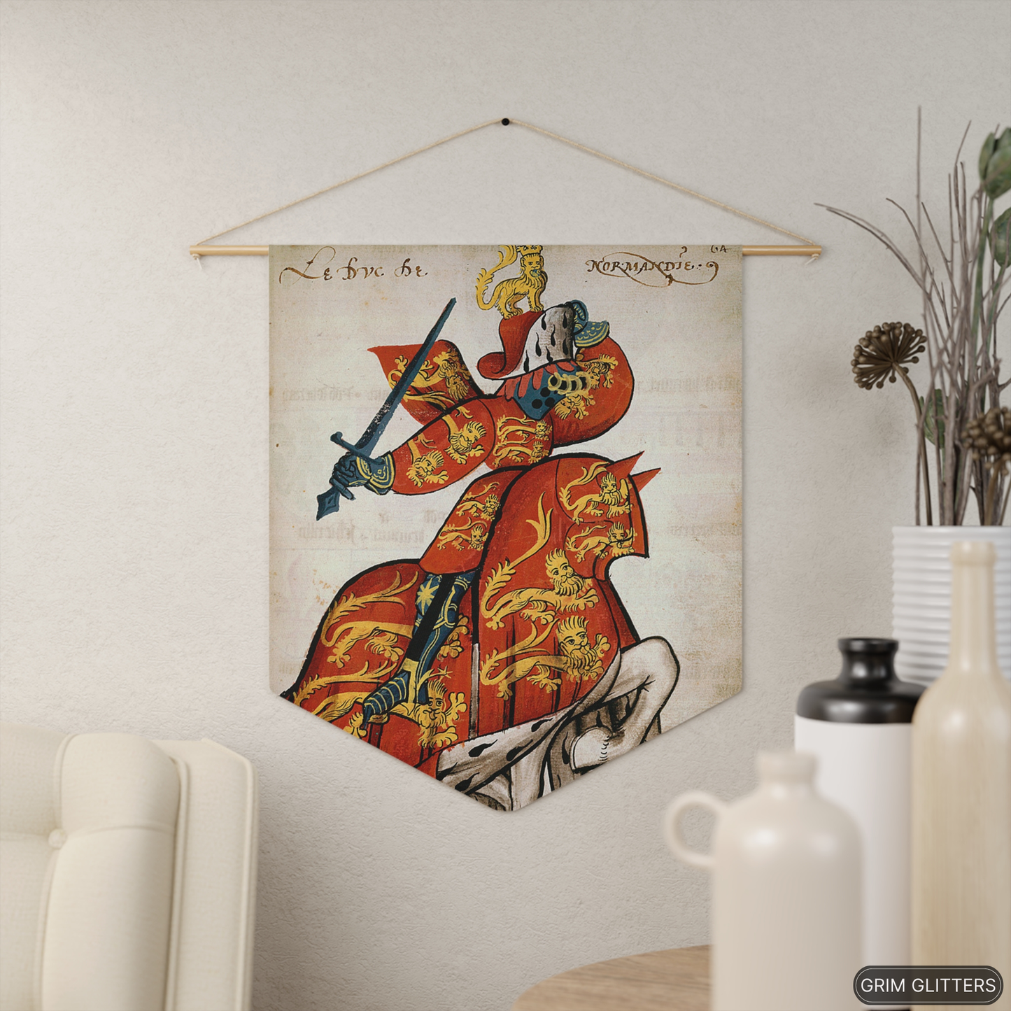 Bring the power and prestige of medieval France into your space with The Duke of Normandy Pennant Banner, inspired by the Great Equestrian Armorial of the Golden Fleece. This striking banner features the Duke adorned in scarlet and gold, his regalia displaying golden lions representing the Norman heraldic symbols of strength and royal lineage. A magnificent piece perfect for history lovers, medieval decor enthusiasts, and those drawn to the elegance of chivalric art.