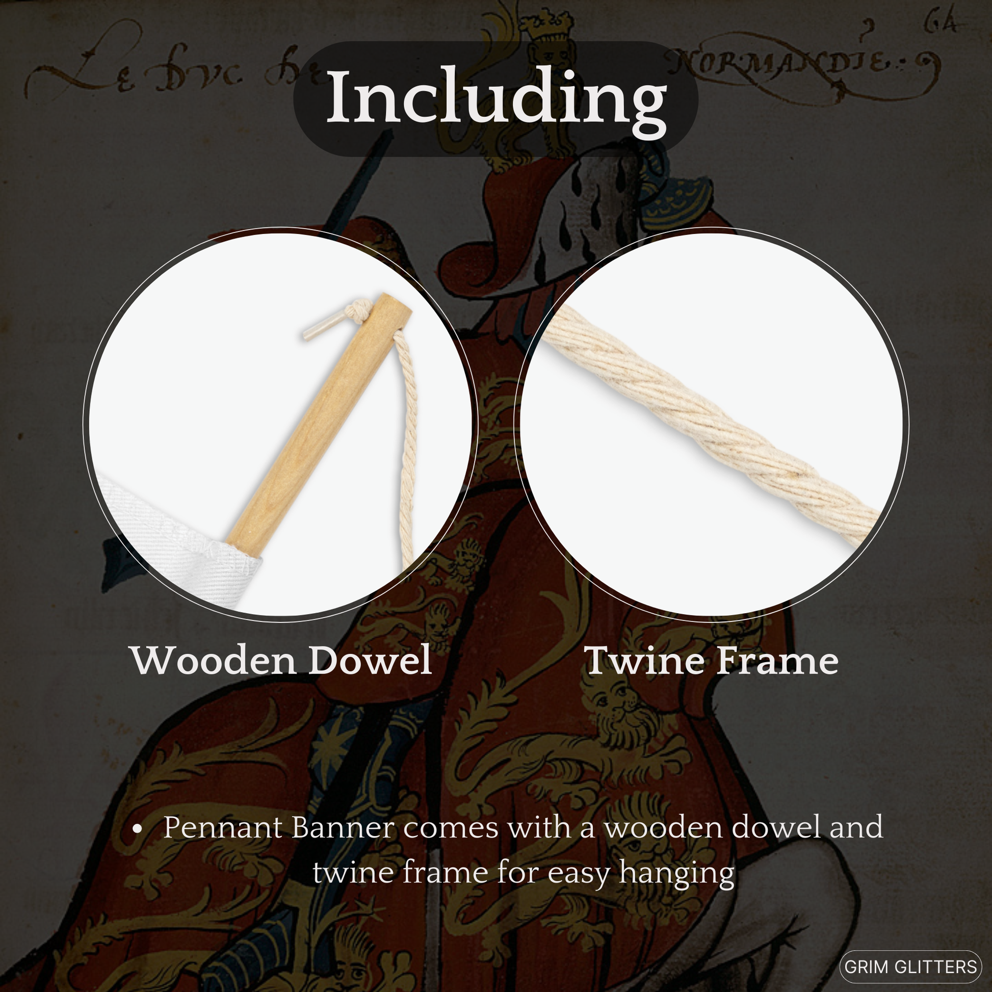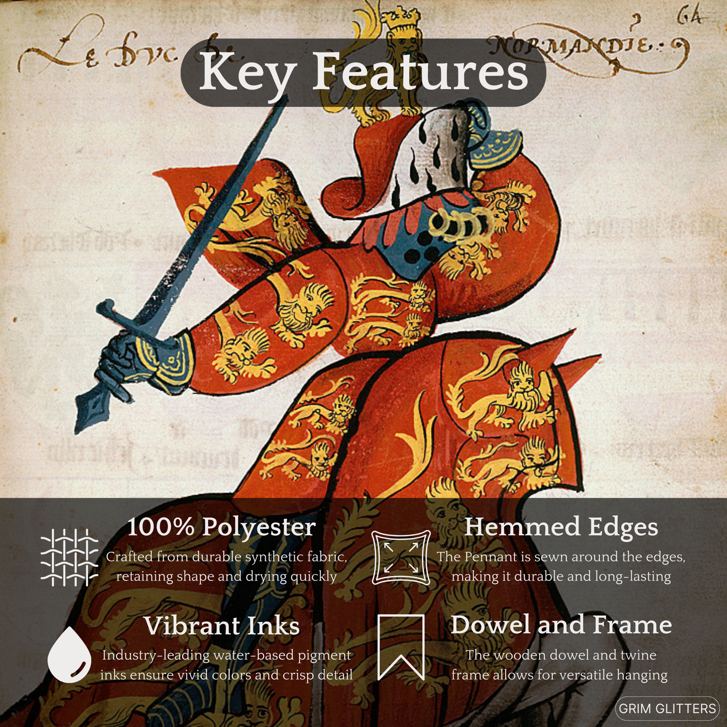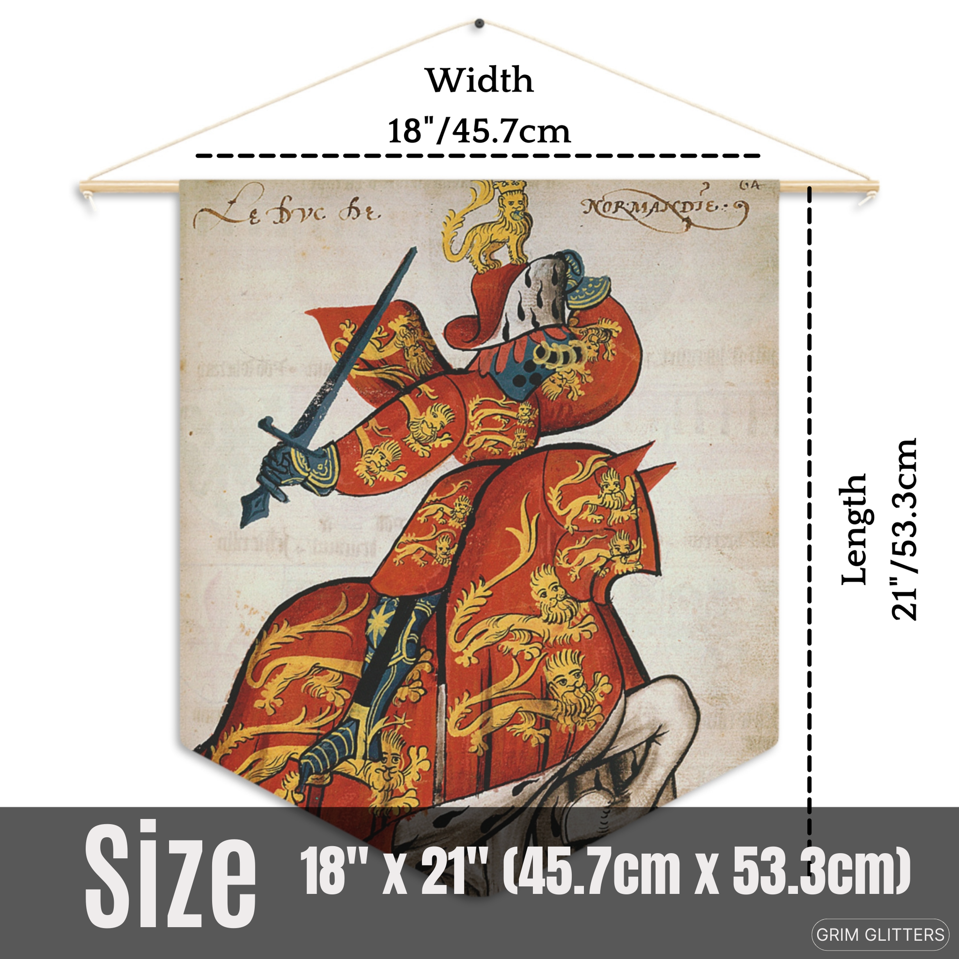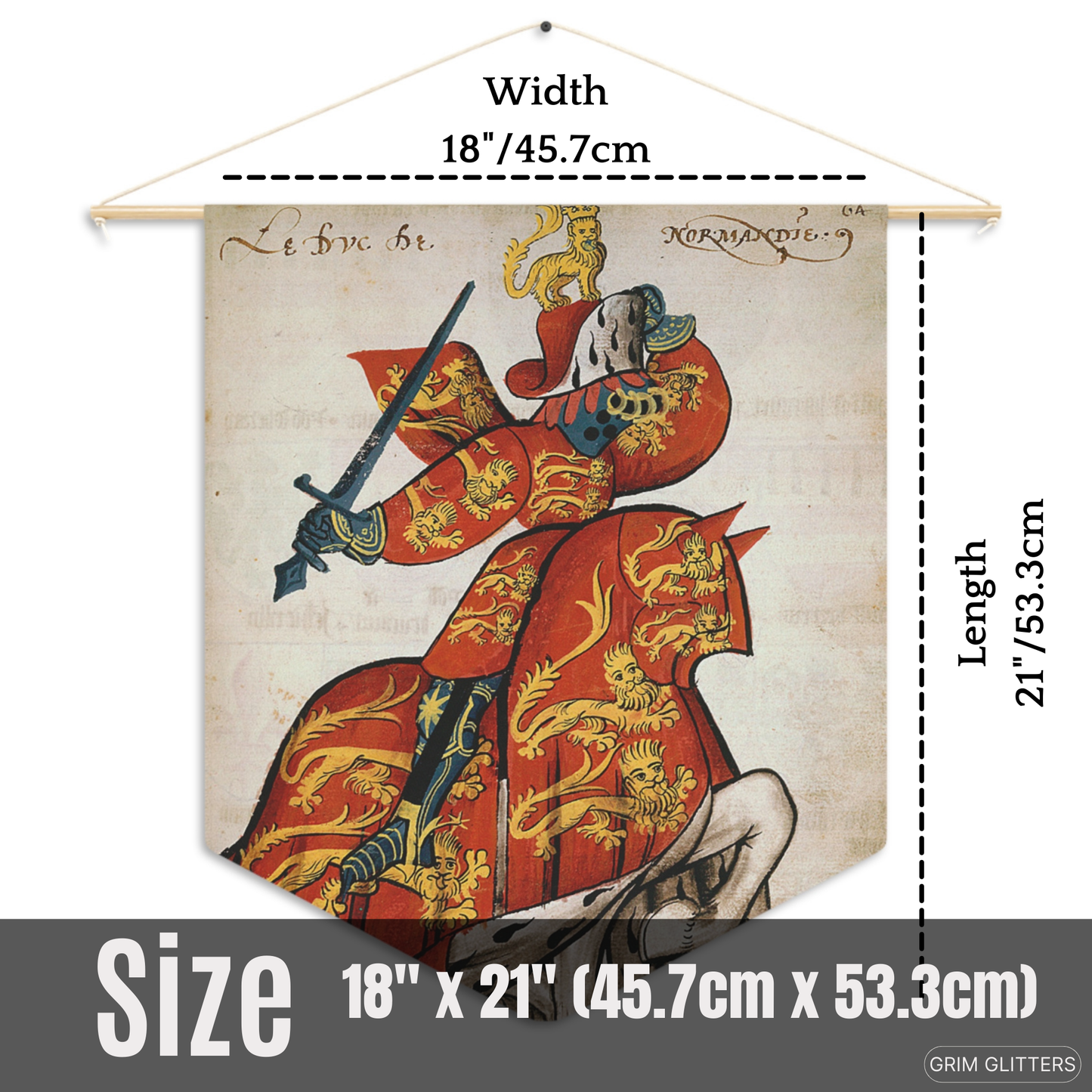 Bring the power and prestige of medieval France into your space with The Duke of Normandy Pennant Banner, inspired by the Great Equestrian Armorial of the Golden Fleece. This striking banner features the Duke adorned in scarlet and gold, his regalia displaying golden lions representing the Norman heraldic symbols of strength and royal lineage. A magnificent piece perfect for history lovers, medieval decor enthusiasts, and those drawn to the elegance of chivalric art.
