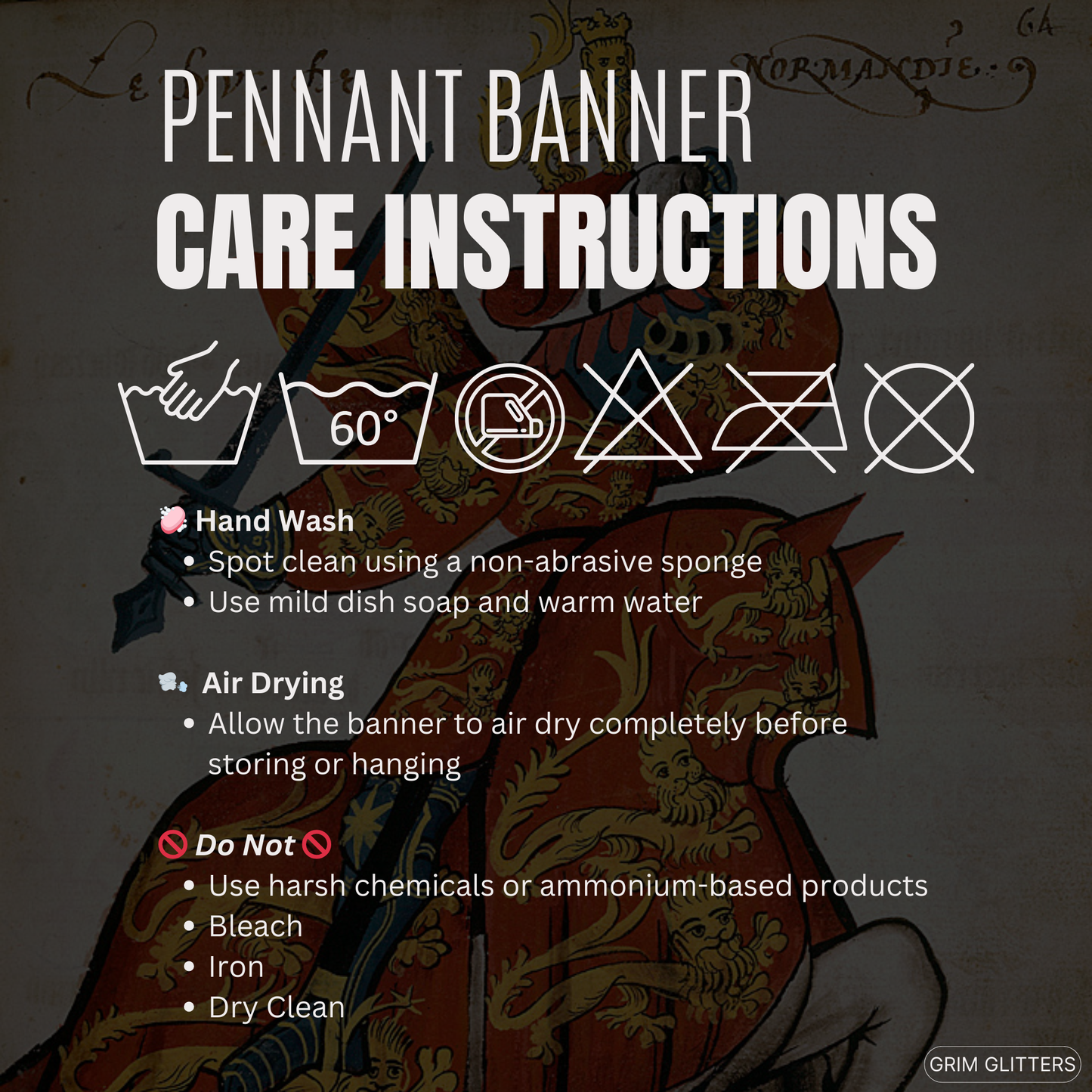 Crafted from lightweight yet durable polyester twill, this 18" × 21" (45.7cm × 53.3cm) pennant banner features carefully hemmed edges for a finished, professional appearance. The vivid red and gold design brings the medieval artistry to life.