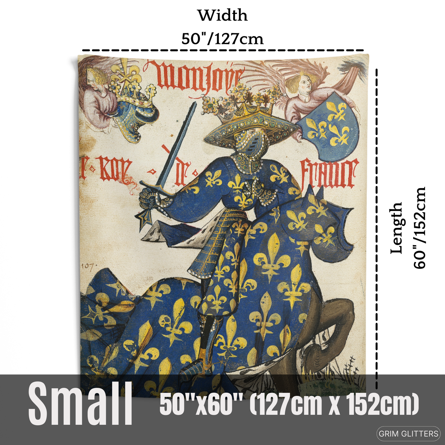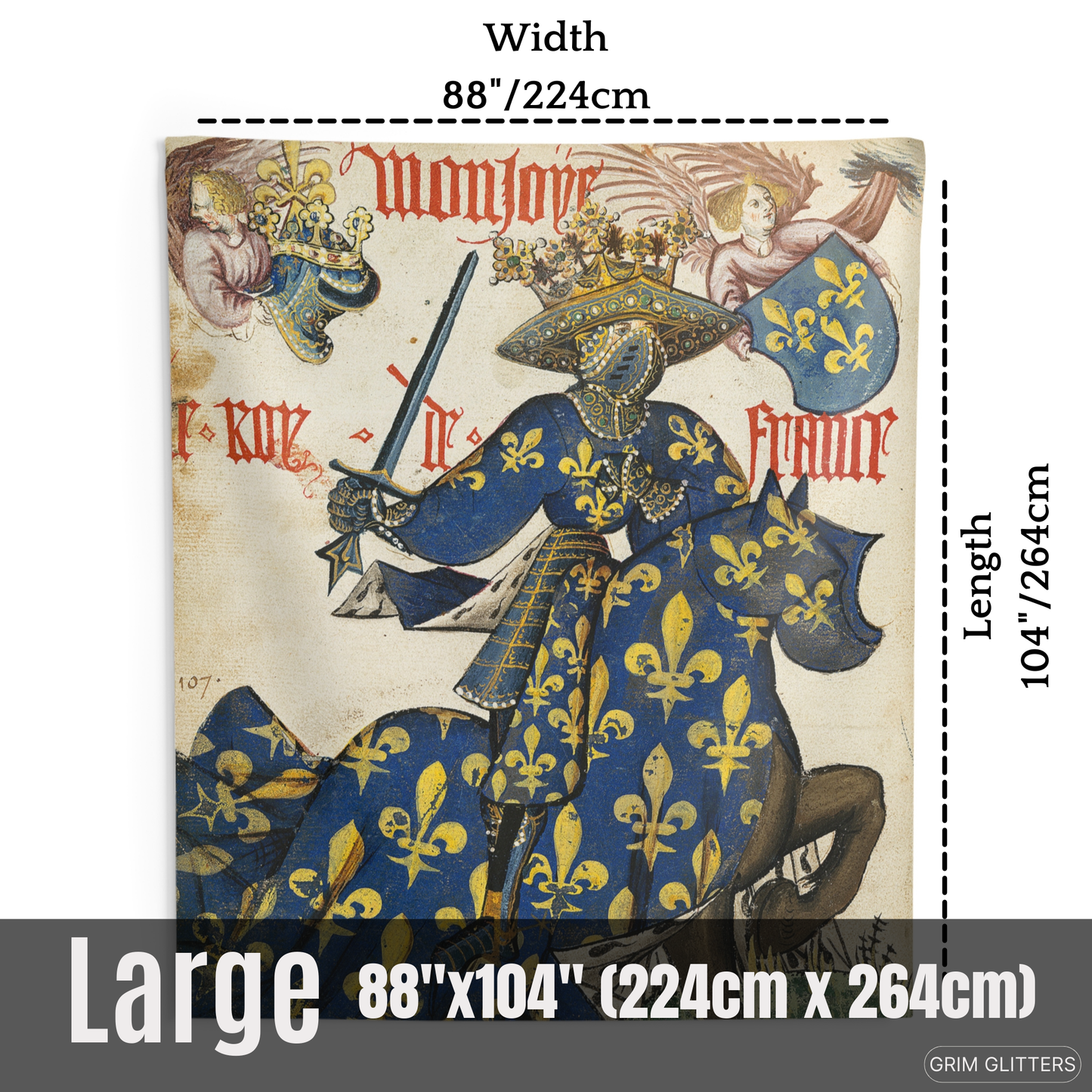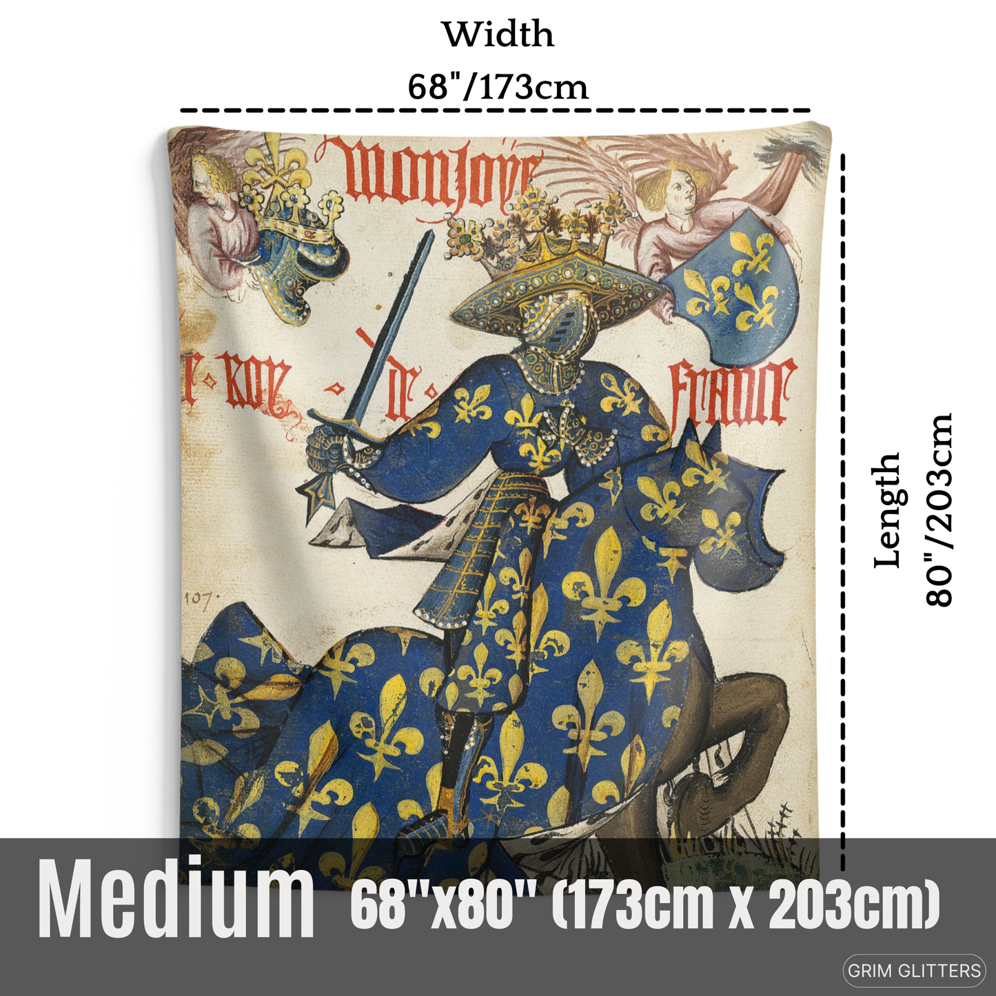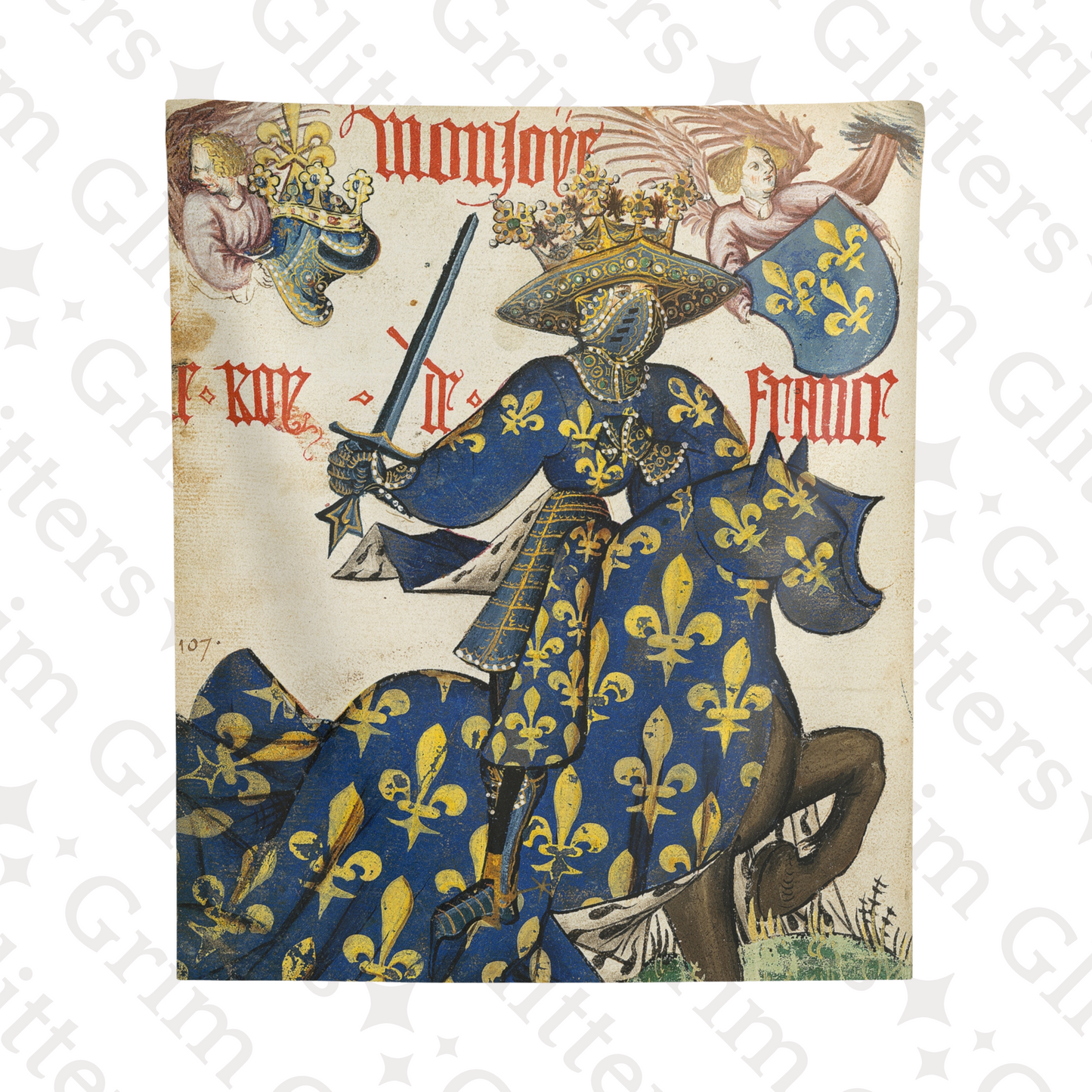 Celebrate the regal splendor of medieval France with The King of France Tapestry, inspired by the Great Equestrian Armorial of the Golden Fleece. This magnificent artwork showcases the King of France in full jousting regalia, draped in a resplendent blue and gold surcoat and caparison, both adorned with the iconic fleur-de-lis. His elaborately crowned helm and poised sword embody the grandeur, authority, and pageantry of medieval European royalty, making this tapestry a captivating addition to any historic art collection.