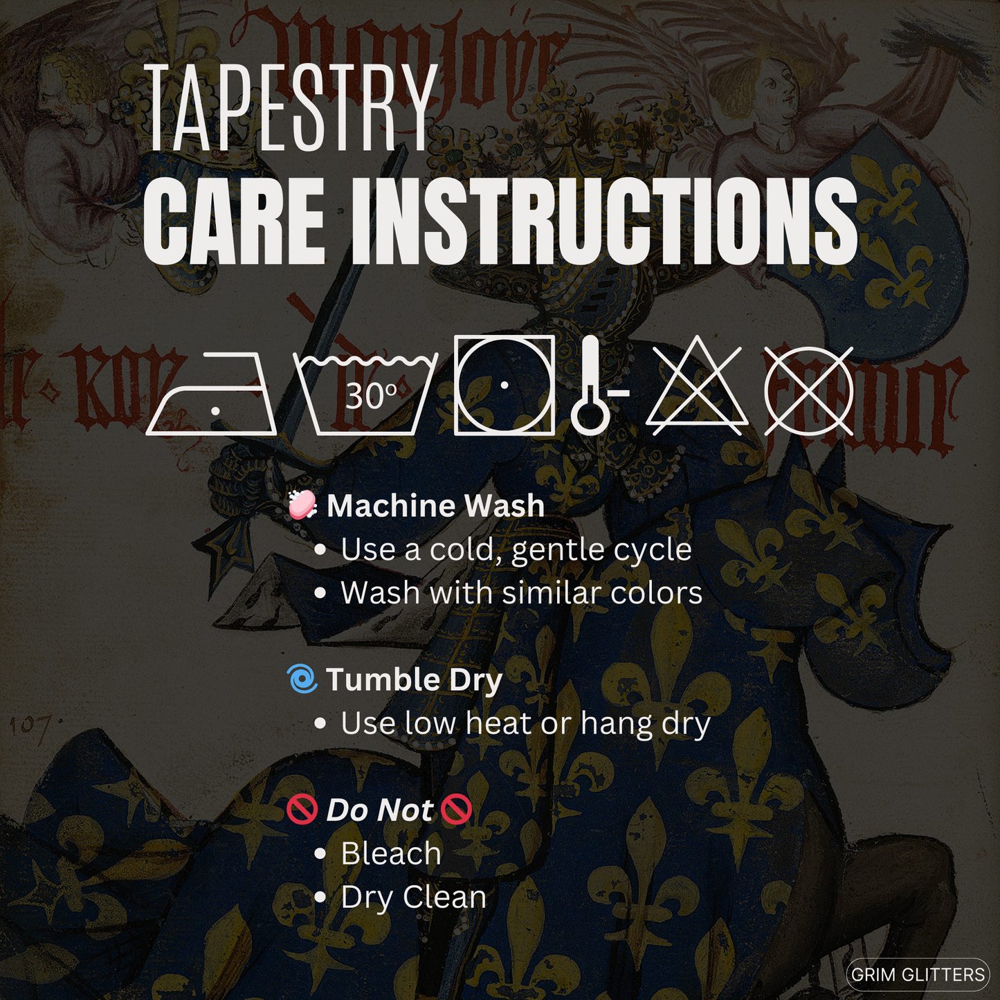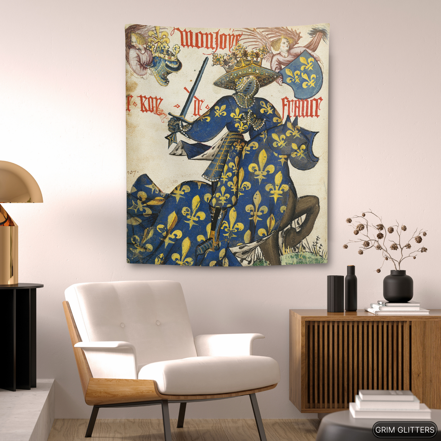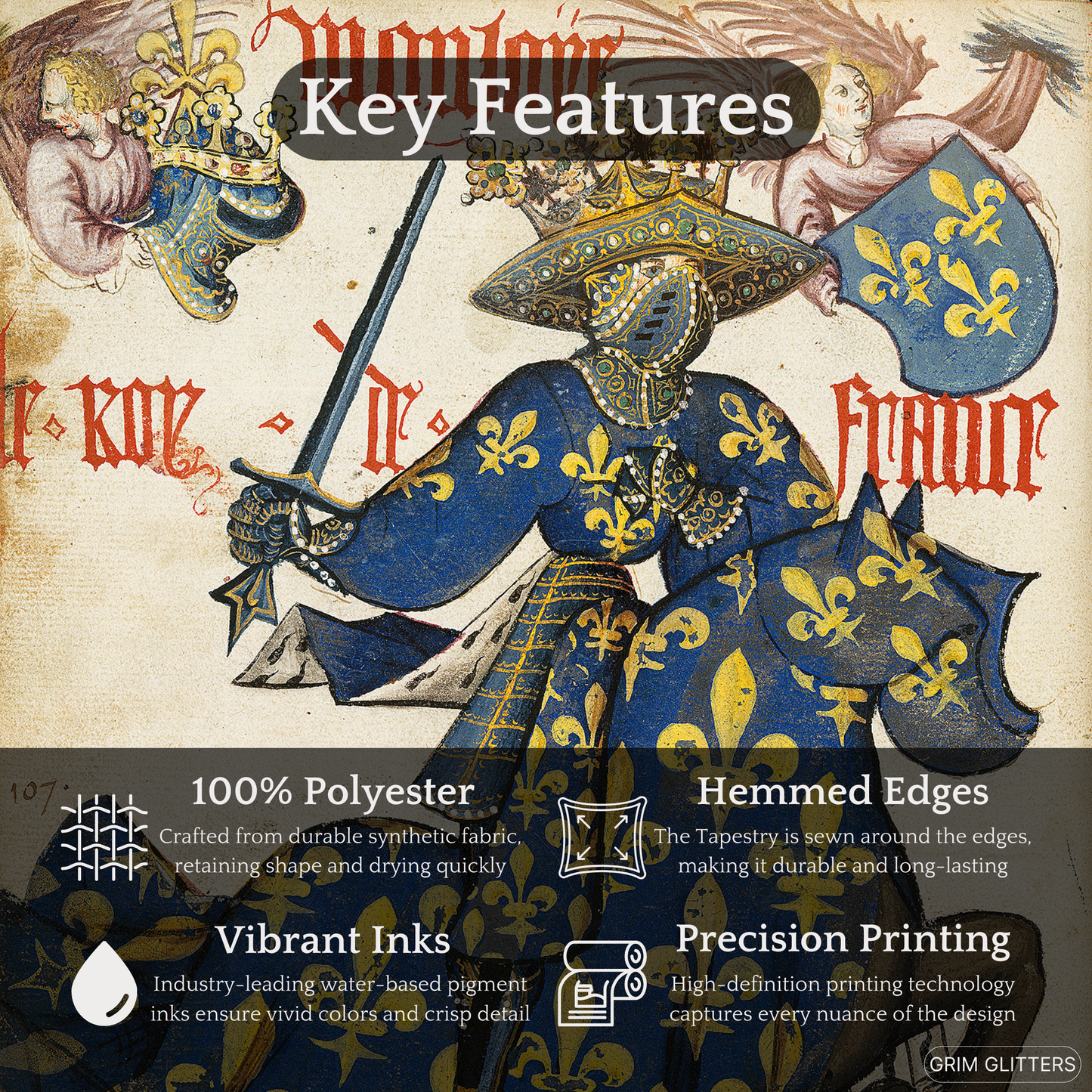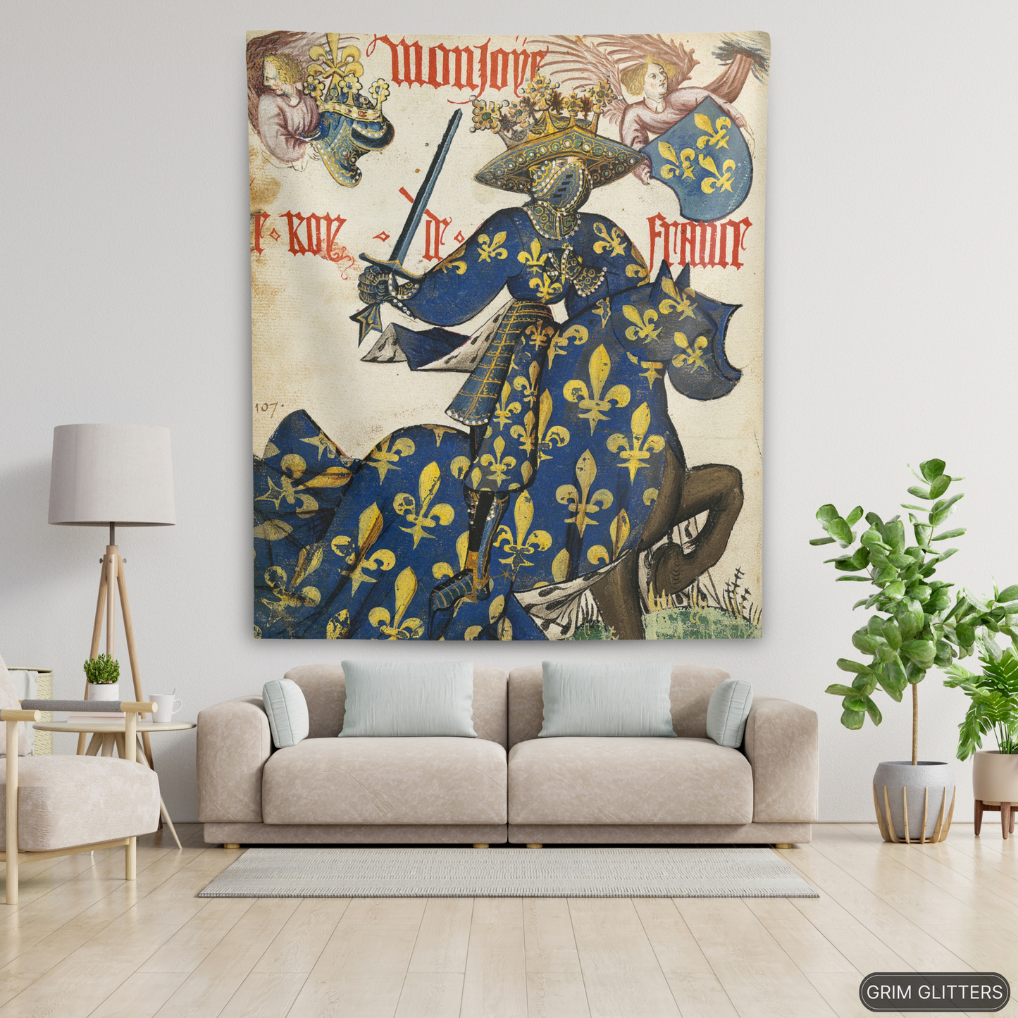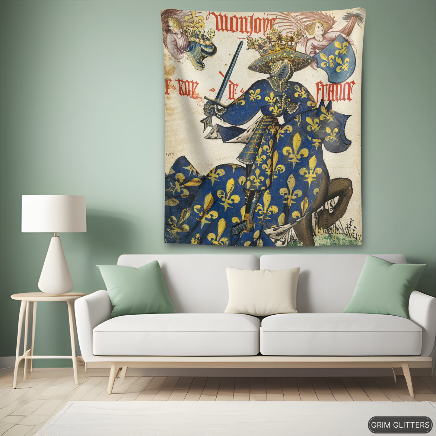 Celebrate the regal splendor of medieval France with The King of France Tapestry, inspired by the Great Equestrian Armorial of the Golden Fleece. This magnificent artwork showcases the King of France in full jousting regalia, draped in a resplendent blue and gold surcoat and caparison, both adorned with the iconic fleur-de-lis. His elaborately crowned helm and poised sword embody the grandeur, authority, and pageantry of medieval European royalty, making this tapestry a captivating addition to any historic art collection.