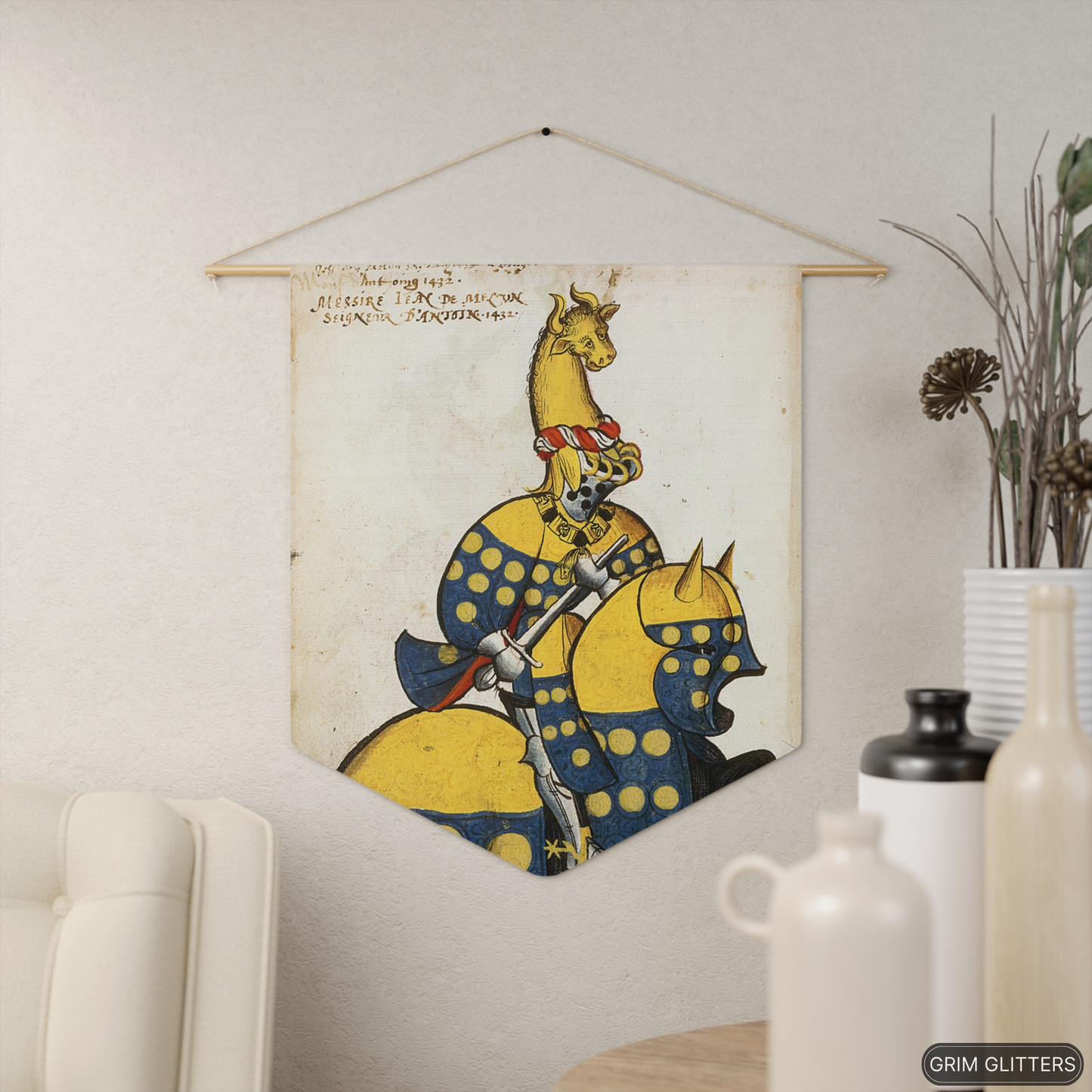 Immerse yourself in the chivalric grandeur of the Lord of Antoing with this striking pennant banner, featuring the bold blue and yellow heraldry of Jean de Melun. Inspired by the Great Equestrian Armorial of the Golden Fleece, this piece brings to life the elegance and prestige of medieval French nobility. Perfect for enthusiasts of history, medieval art, and heraldic decor.
