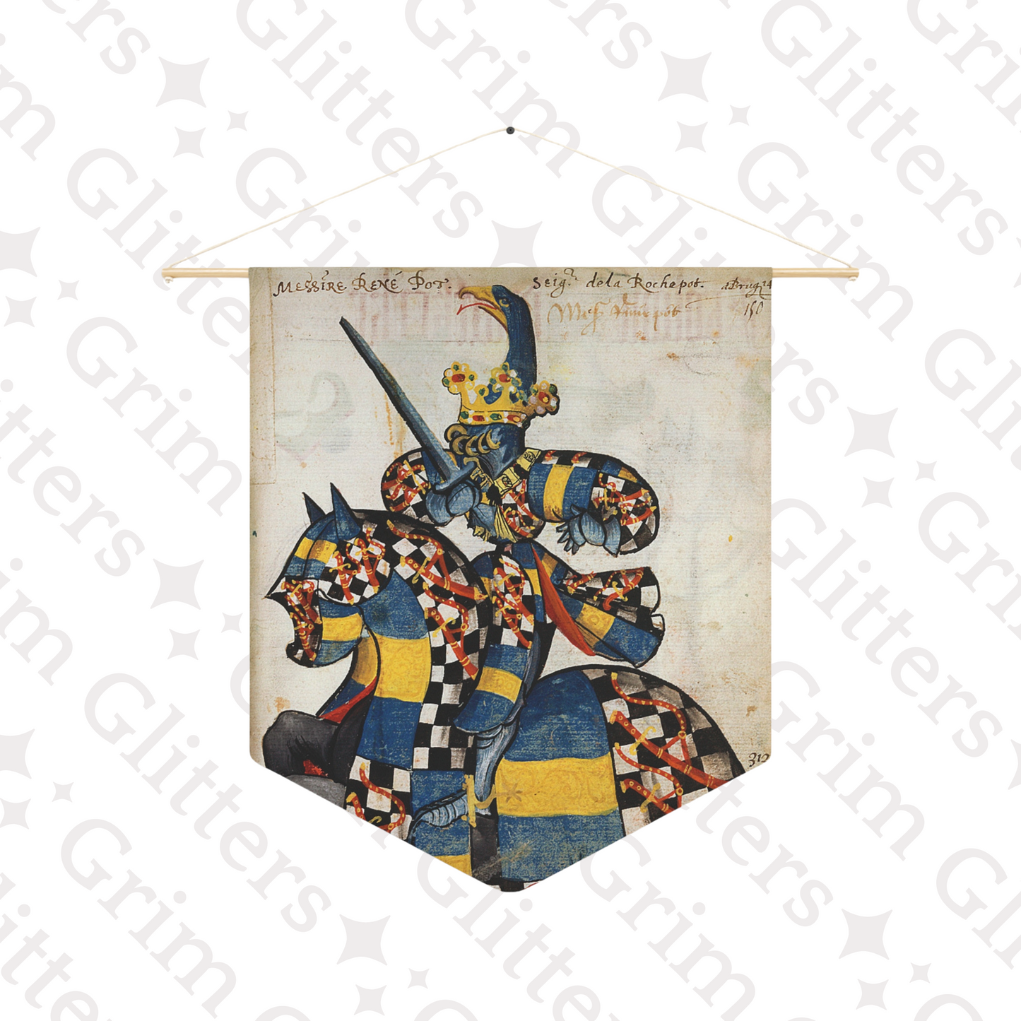 Celebrate the legacy of Régnier Pot, Lord of La Prugne, with this eye-catching pennant banner. Showcasing his vibrant tournament regalia, it features alternating stripes of blue and yellow paired with intricate checkered patterns, embodying the bold heraldic style of the medieval era. The helm is crowned with a striking eagle crest, symbolizing strength and noble lineage.