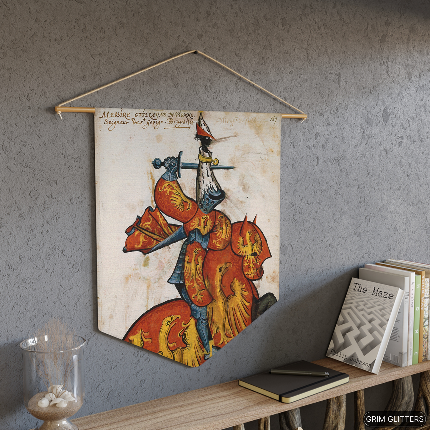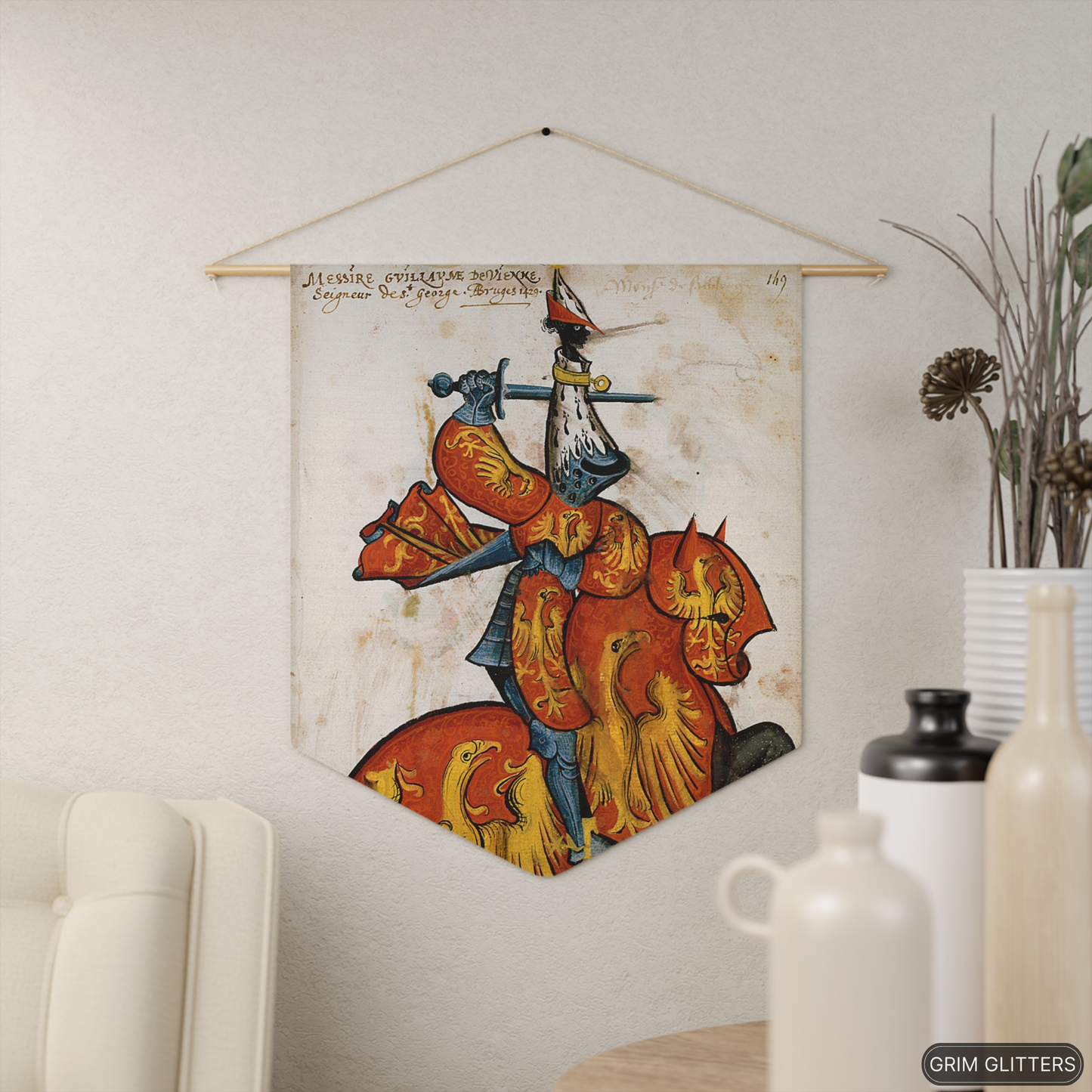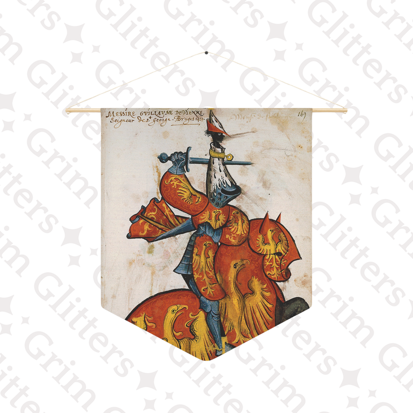 Celebrate the heraldic brilliance of Guillaume de Vienne, Lord of Saint-Georges, with this striking pennant banner. Featuring his vibrant tournament regalia, adorned with radiant gold eagles on a rich red field, this design embodies the grandeur of medieval chivalry. The noble helm crowned with an ermine-patterned crest further elevates this piece as a stunning tribute to the chivalric tradition.