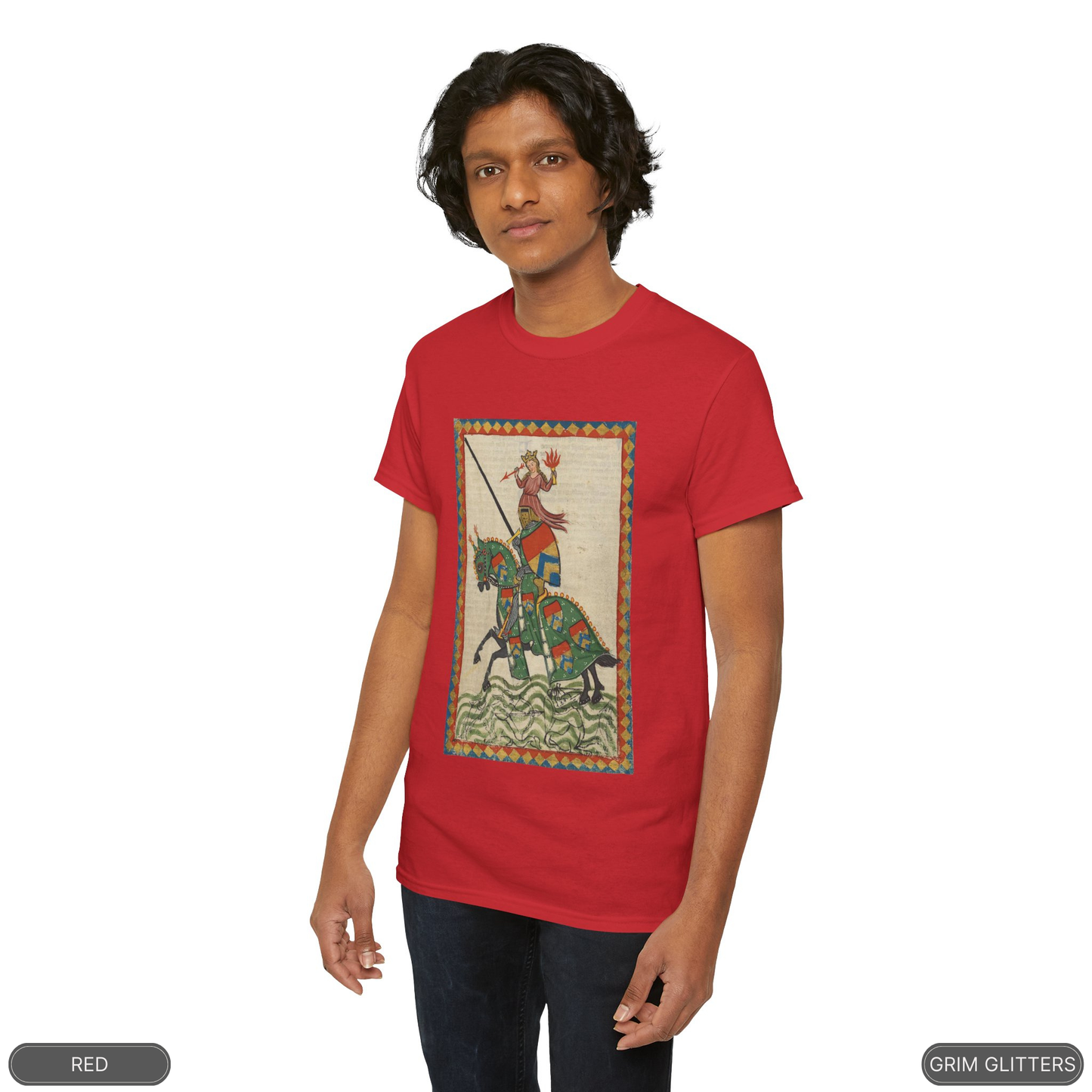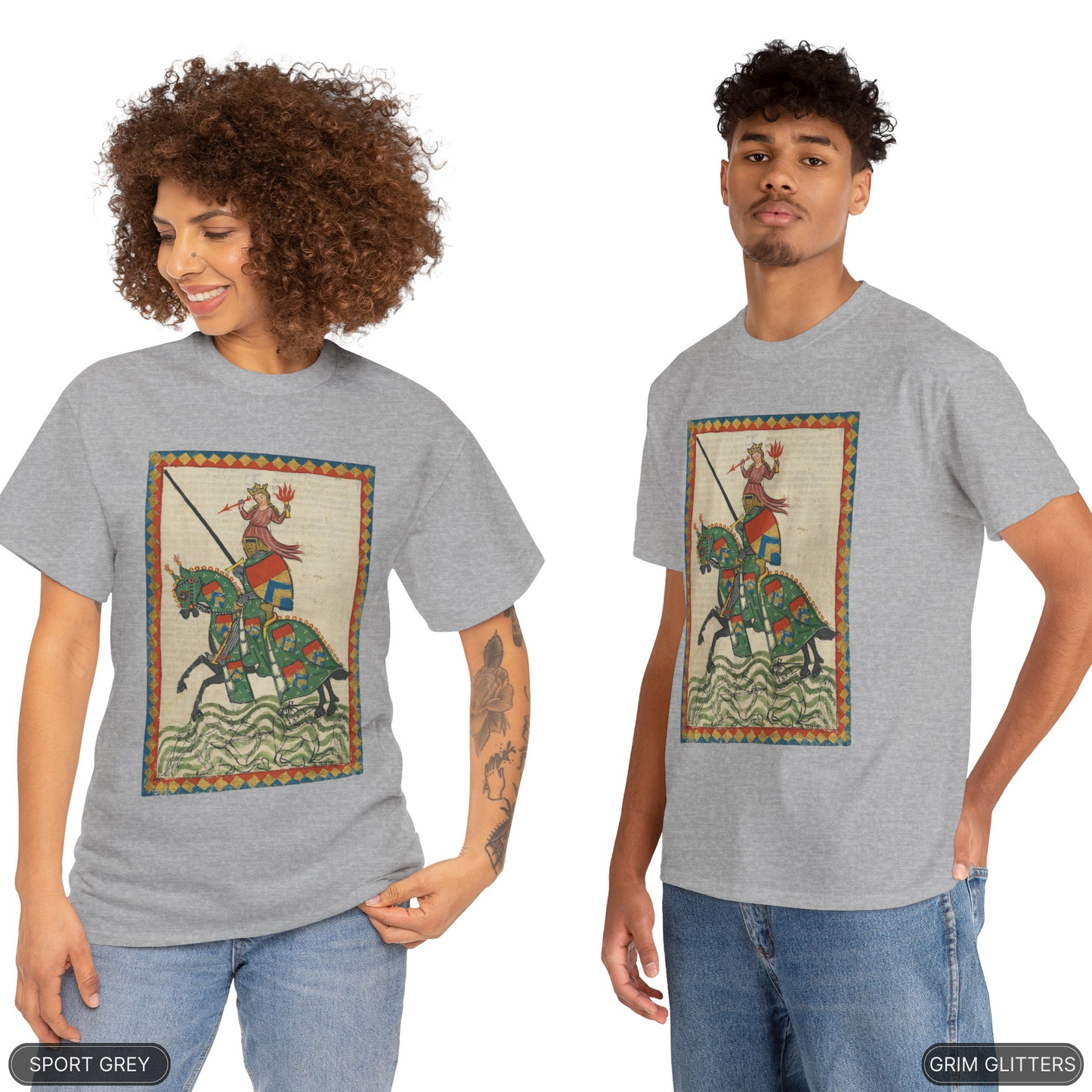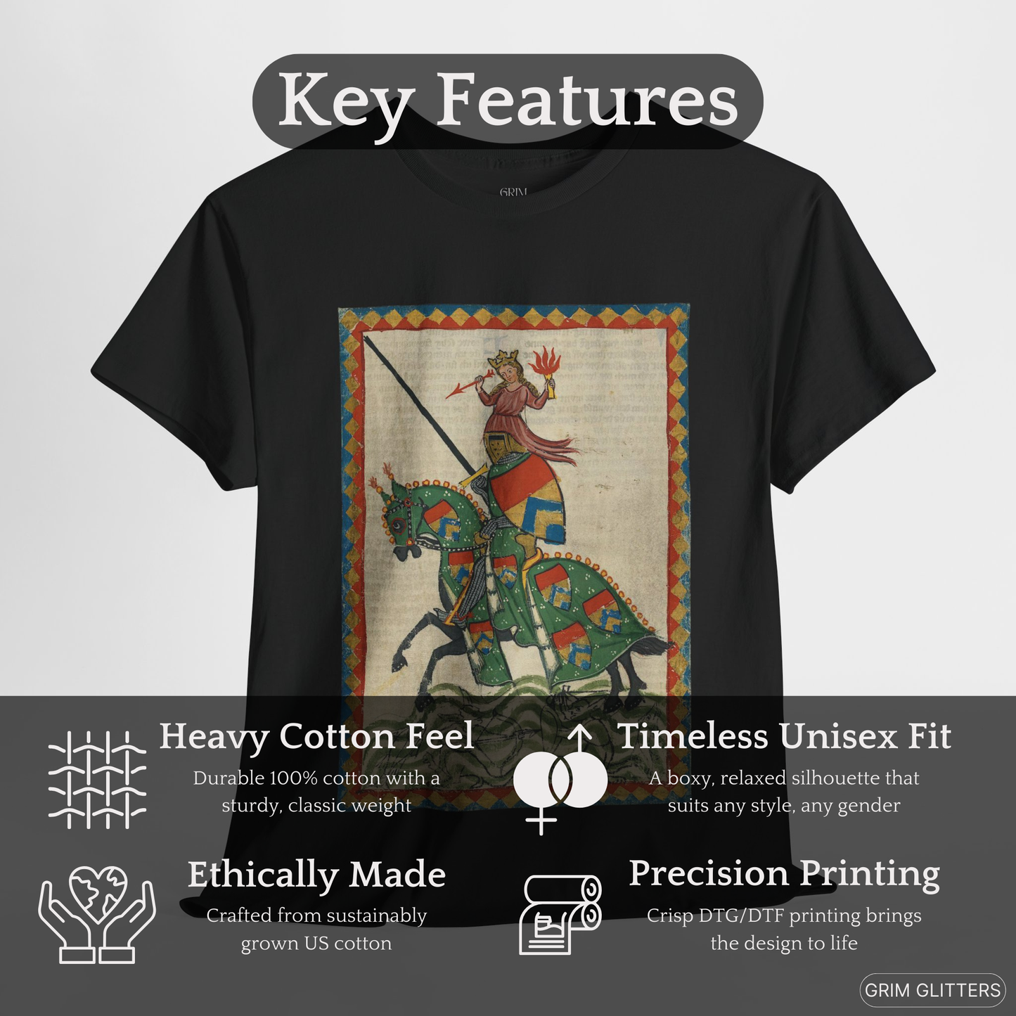 Printed on a sturdy Gildan 5000 heavy cotton tee, this design merges high-impact historical art with modern comfort—perfect for medievalists, romantics, or anyone who loves a bit of knightly flair.