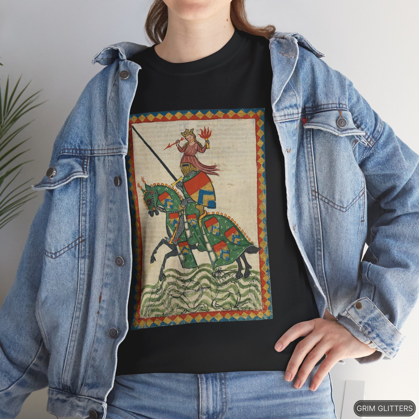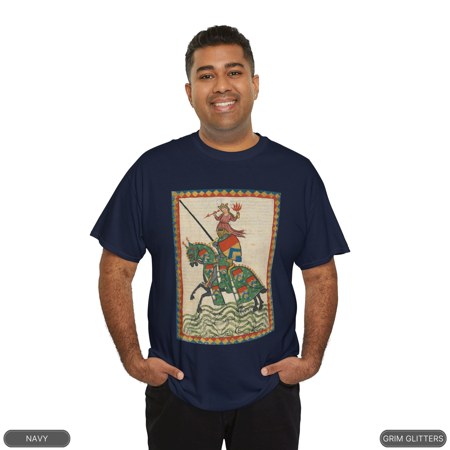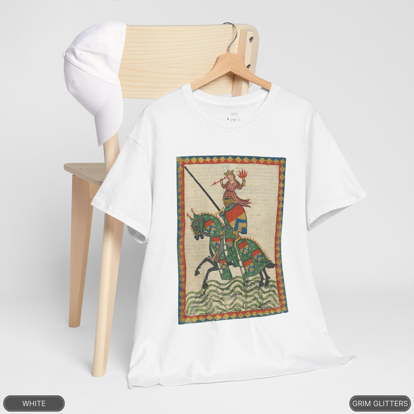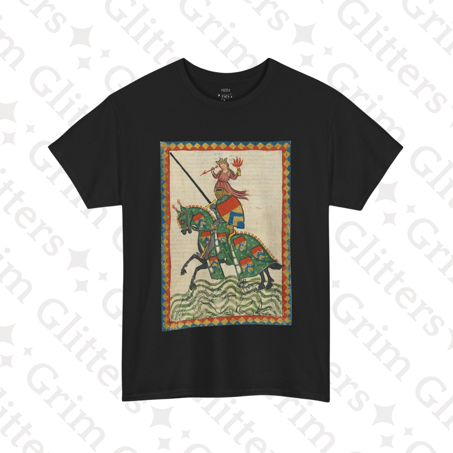 Ride the mythic tide of medieval legend with this vibrant tee featuring Ulrich von Liechtenstein—knight, poet, and courtly icon. Taken from the 14th-century Codex Manesse, this illustration shows Ulrich in dazzling armor with a lady’s head crest atop his helm, galloping across waves as part of his famous poetic journey in honor of idealized love.