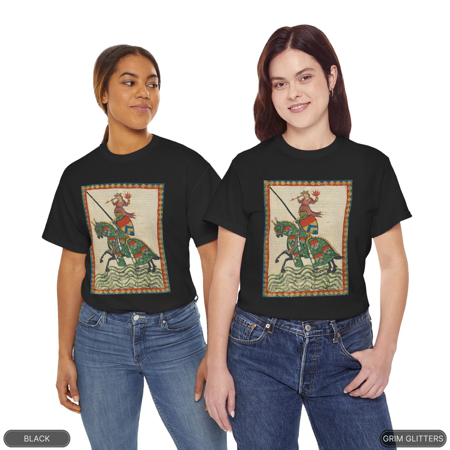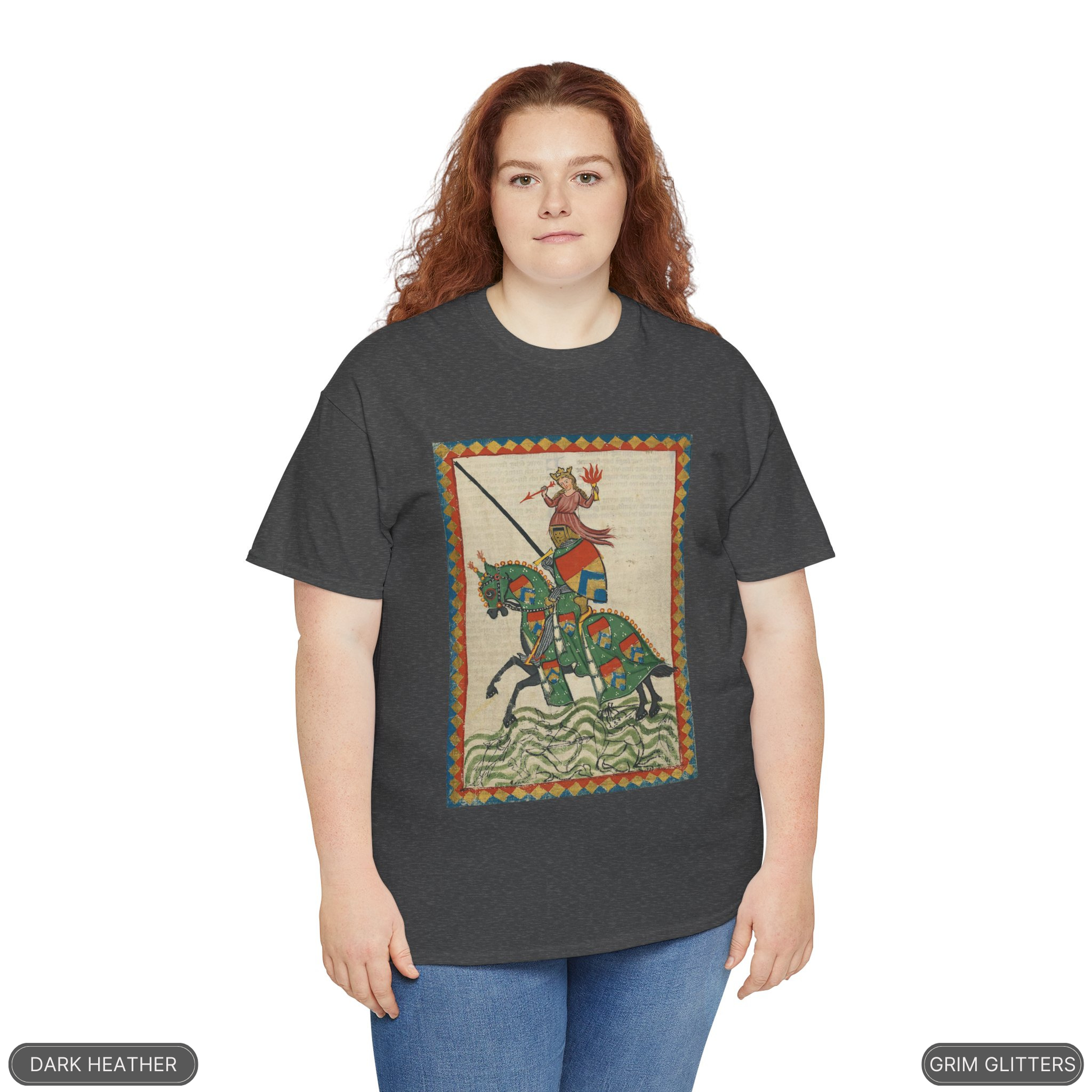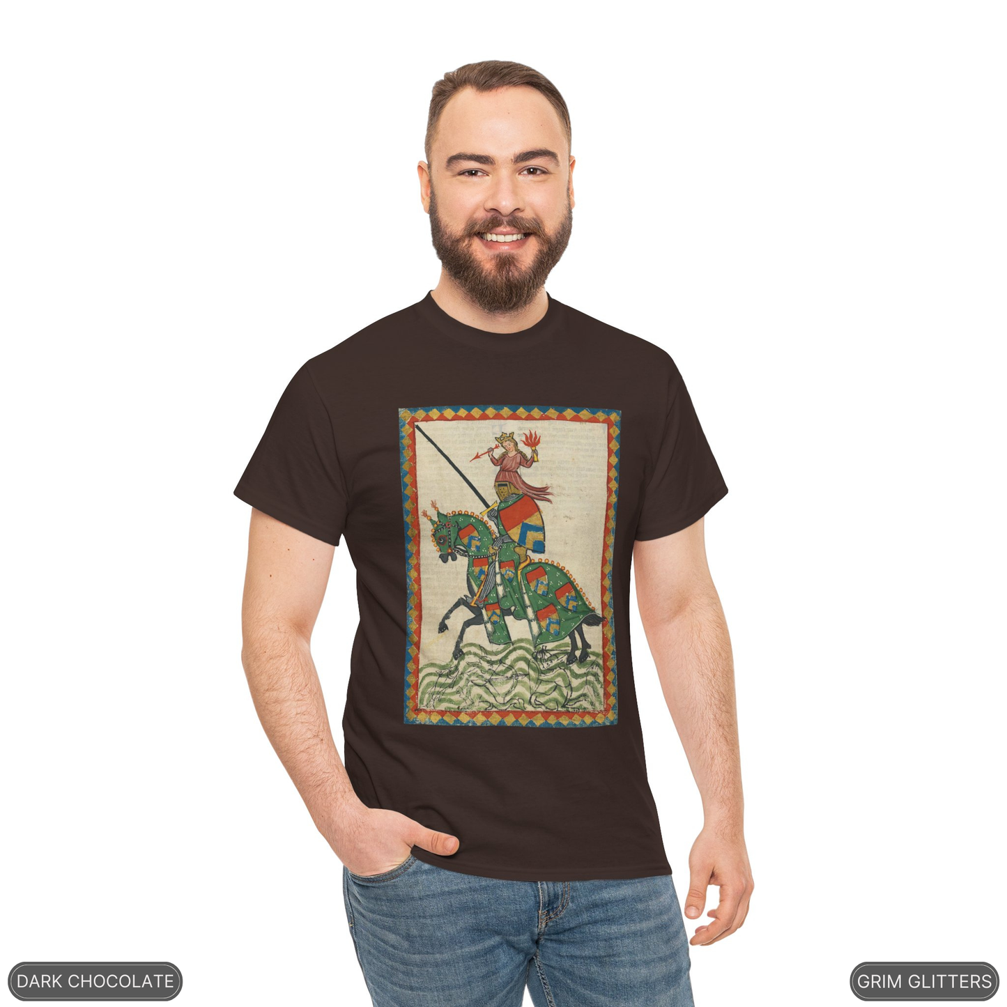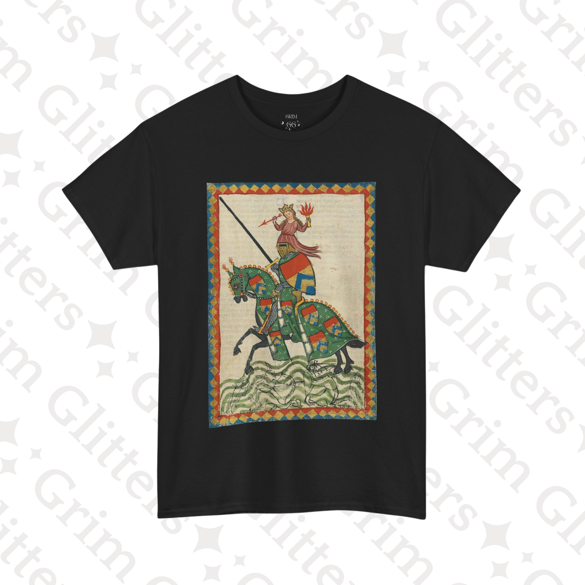 Ride the mythic tide of medieval legend with this vibrant tee featuring Ulrich von Liechtenstein—knight, poet, and courtly icon. Taken from the 14th-century Codex Manesse, this illustration shows Ulrich in dazzling armor with a lady’s head crest atop his helm, galloping across waves as part of his famous poetic journey in honor of idealized love.