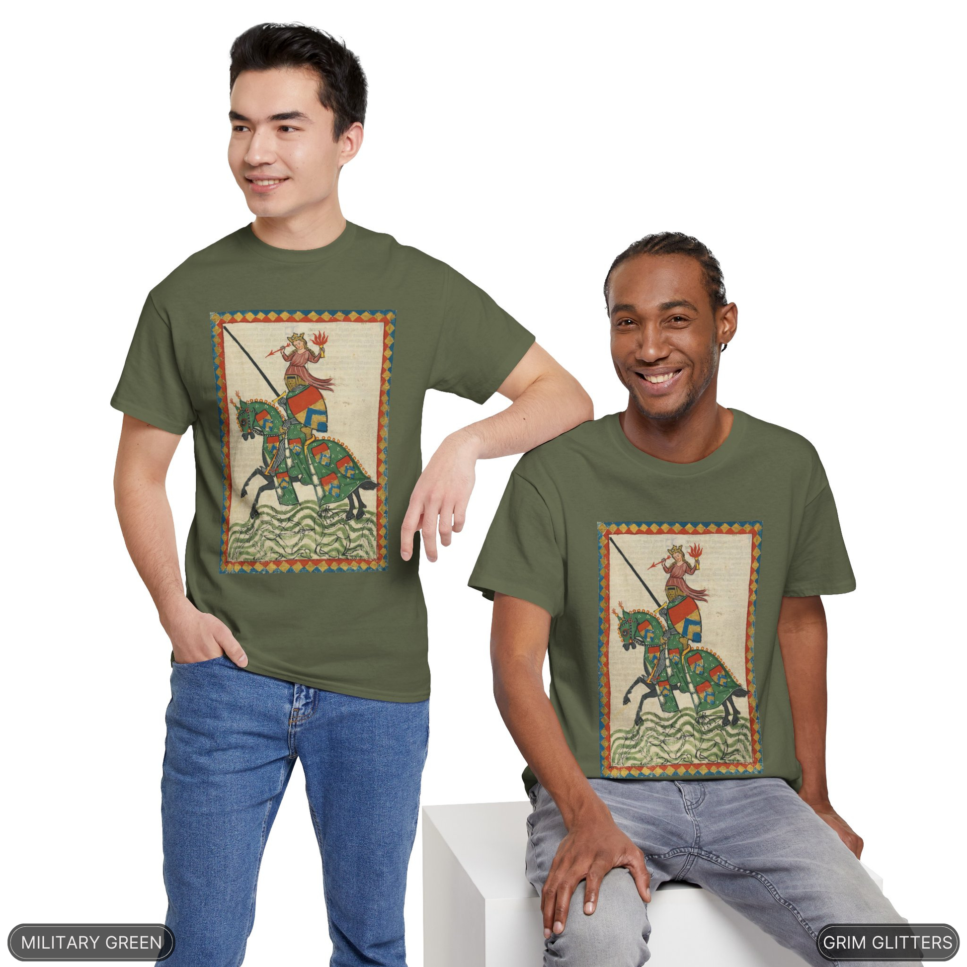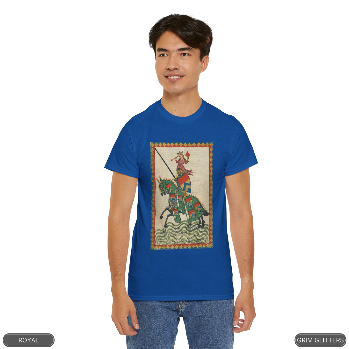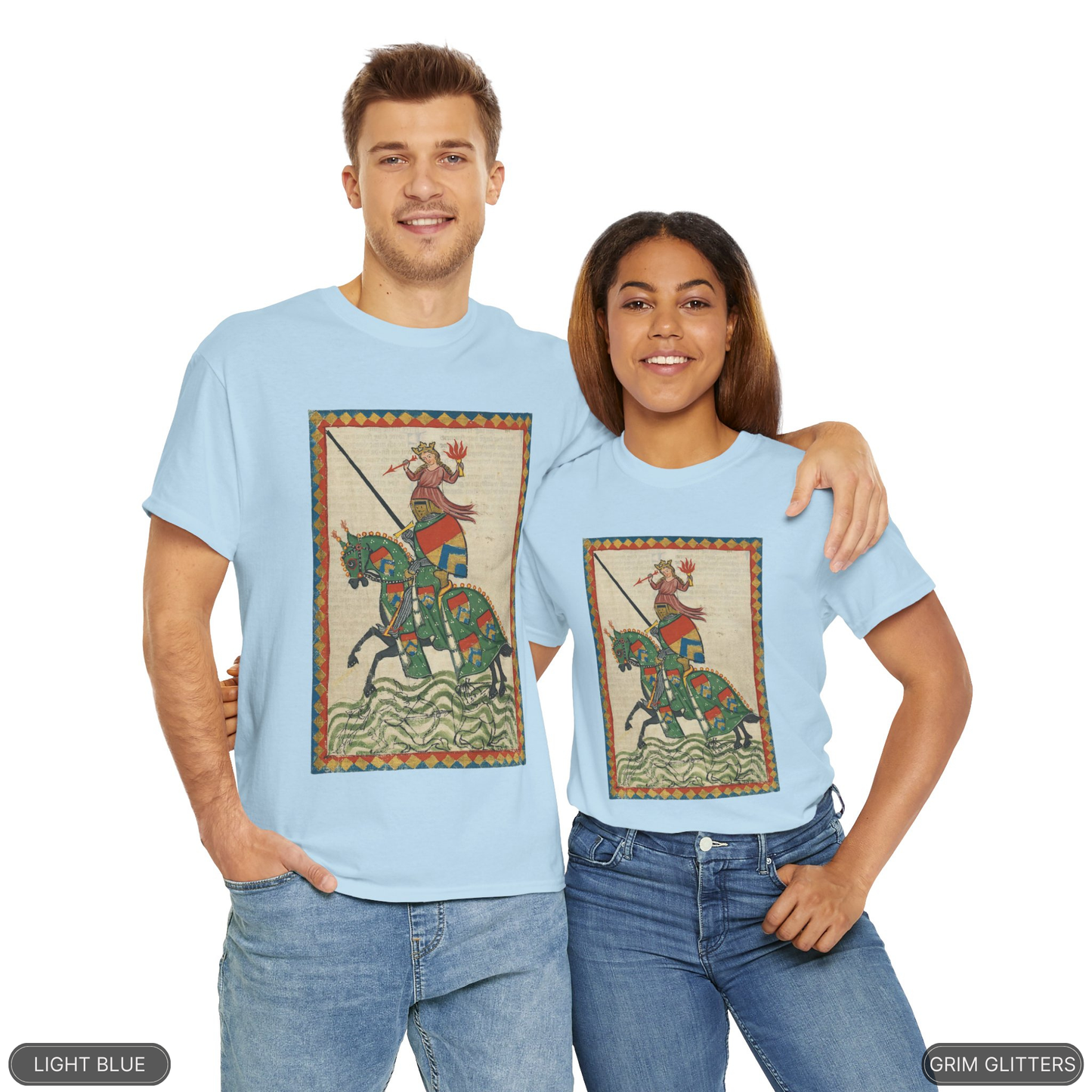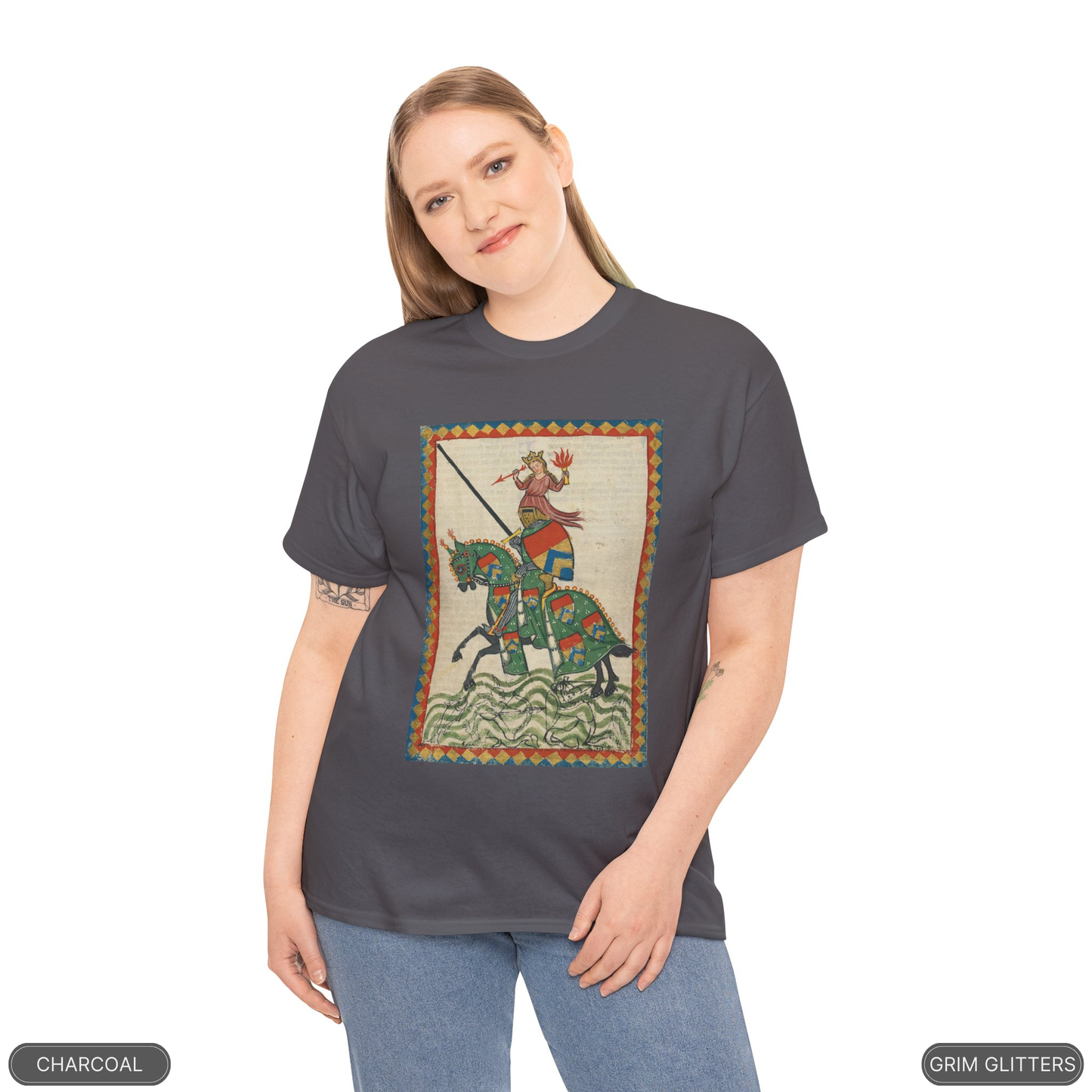 Ride the mythic tide of medieval legend with this vibrant tee featuring Ulrich von Liechtenstein—knight, poet, and courtly icon. Taken from the 14th-century Codex Manesse, this illustration shows Ulrich in dazzling armor with a lady’s head crest atop his helm, galloping across waves as part of his famous poetic journey in honor of idealized love.