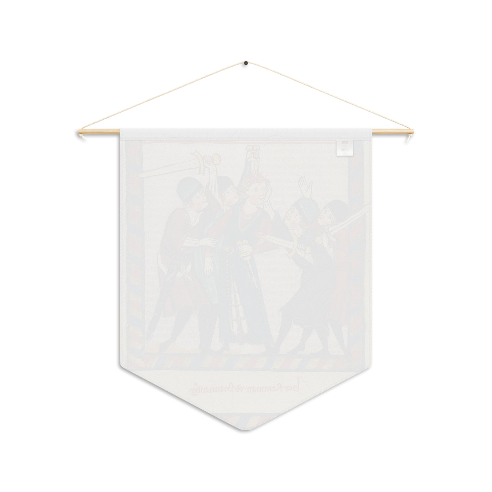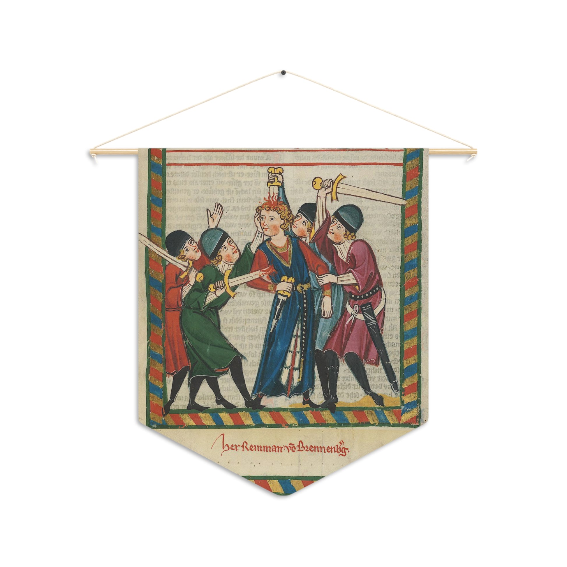 Enter the vivid world of medieval Germany with our Reinmar von Brennenberg Pennant Banner, inspired by the iconic Codex Manesse. This striking illustration depicts the dramatic scene of Reinmar von Brennenberg, a Minnesinger, being unexpectedly attacked. A powerful representation of medieval life, this banner is perfect for history enthusiasts and those who appreciate the intense narratives found in medieval manuscripts.