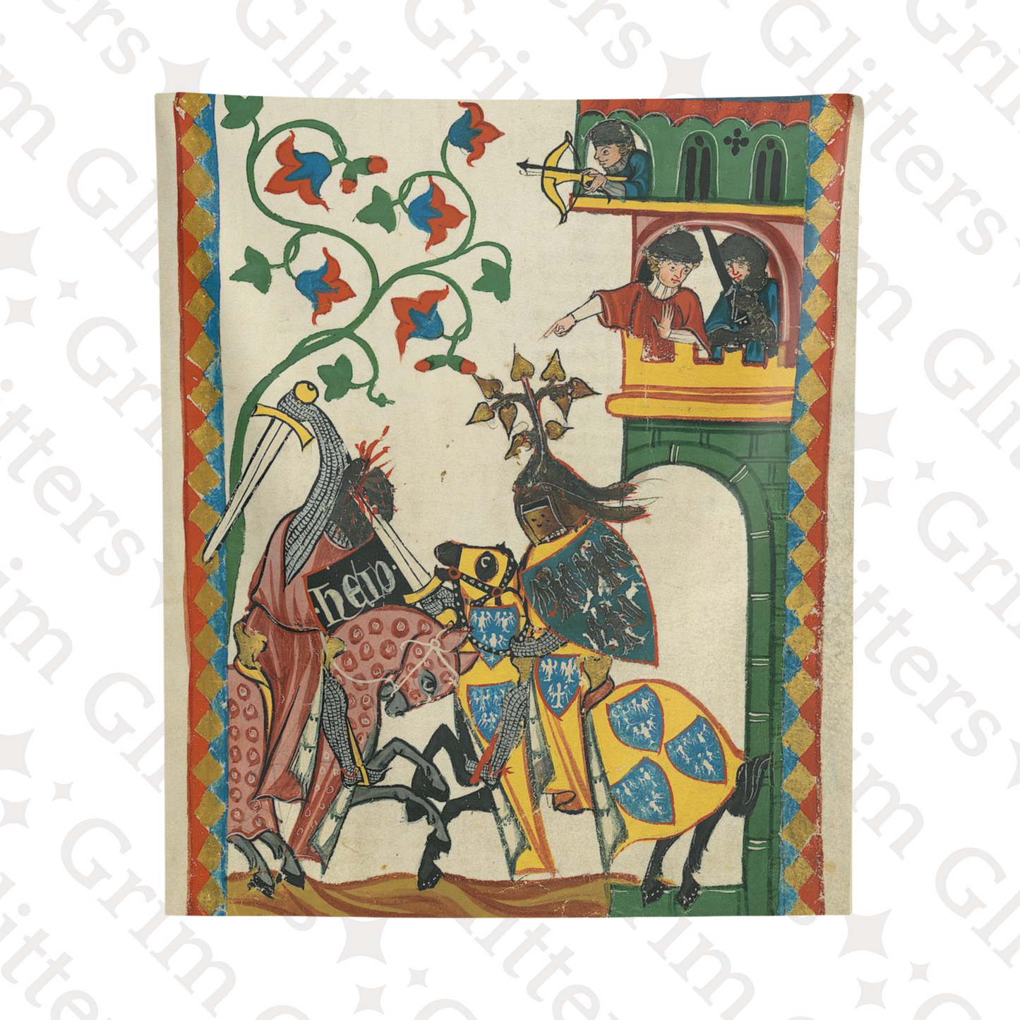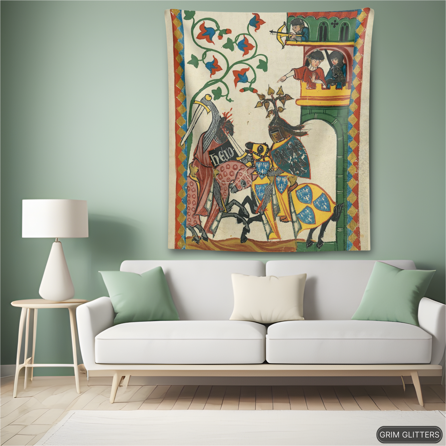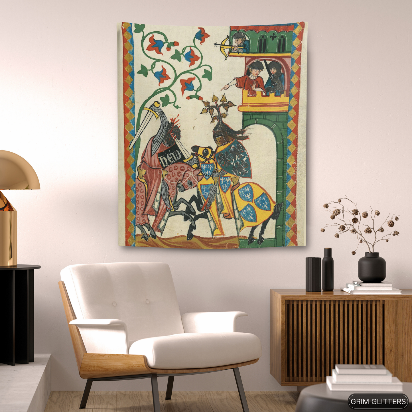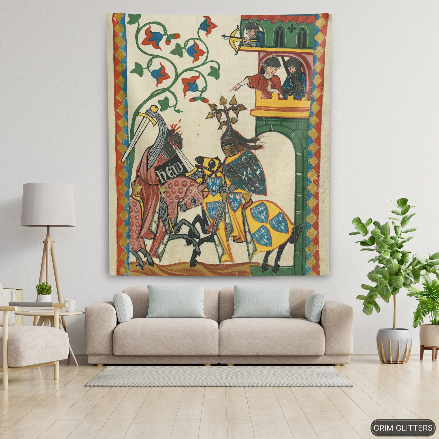 As part of the Codex Manesse collection, this tapestry is more than decor—it’s a piece of history. The manuscript, celebrated for its vivid depictions of German medieval life, is a testament to the chivalric ideals of the era, perfect for collectors, history lovers, and admirers of ancient art.