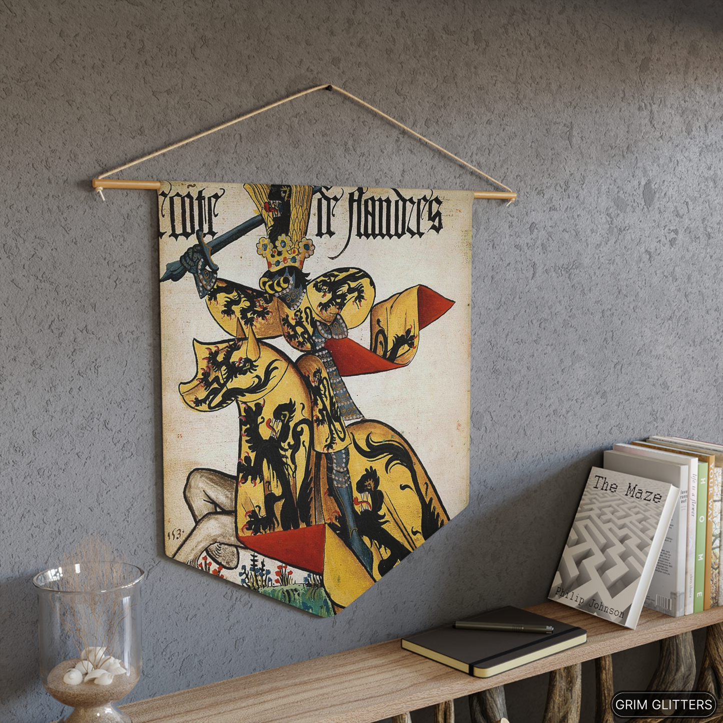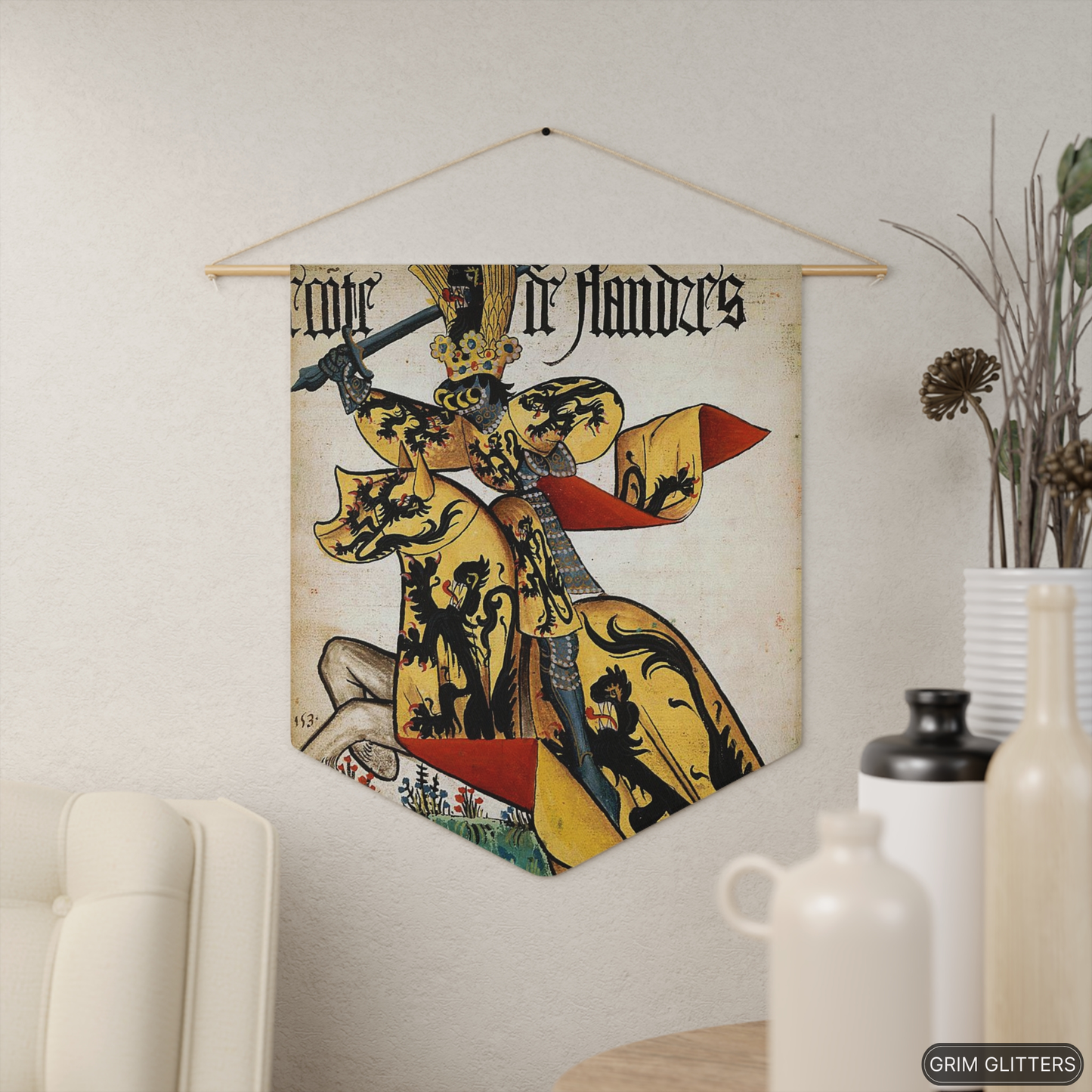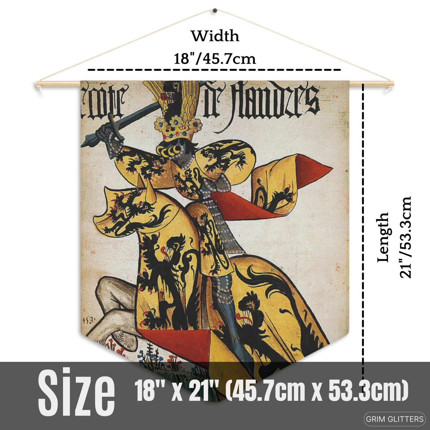 Infuse your space with the commanding presence of the Count of Flanders with this exquisite pennant banner, inspired by the Great Equestrian Armorial of the Golden Fleece. The Duke is portrayed in bold black and gold, his striking heraldic lions exuding power and prestige. This banner is a perfect addition for lovers of medieval art, history enthusiasts, or anyone drawn to the grandeur of noble heraldry.