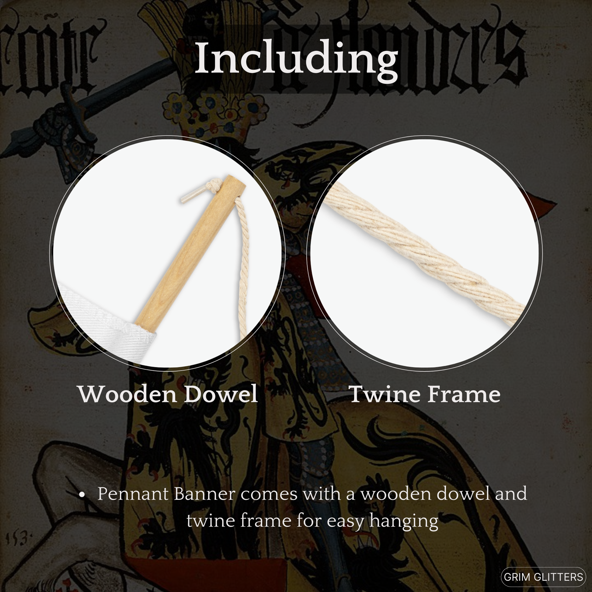 Made from lightweight yet durable polyester twill, this 18" × 21" (45.7cm × 53.3cm) pennant banner features neatly hemmed edges for a polished finish. Its vivid colors and sharp detailing beautifully showcase the artistry of medieval heraldry.