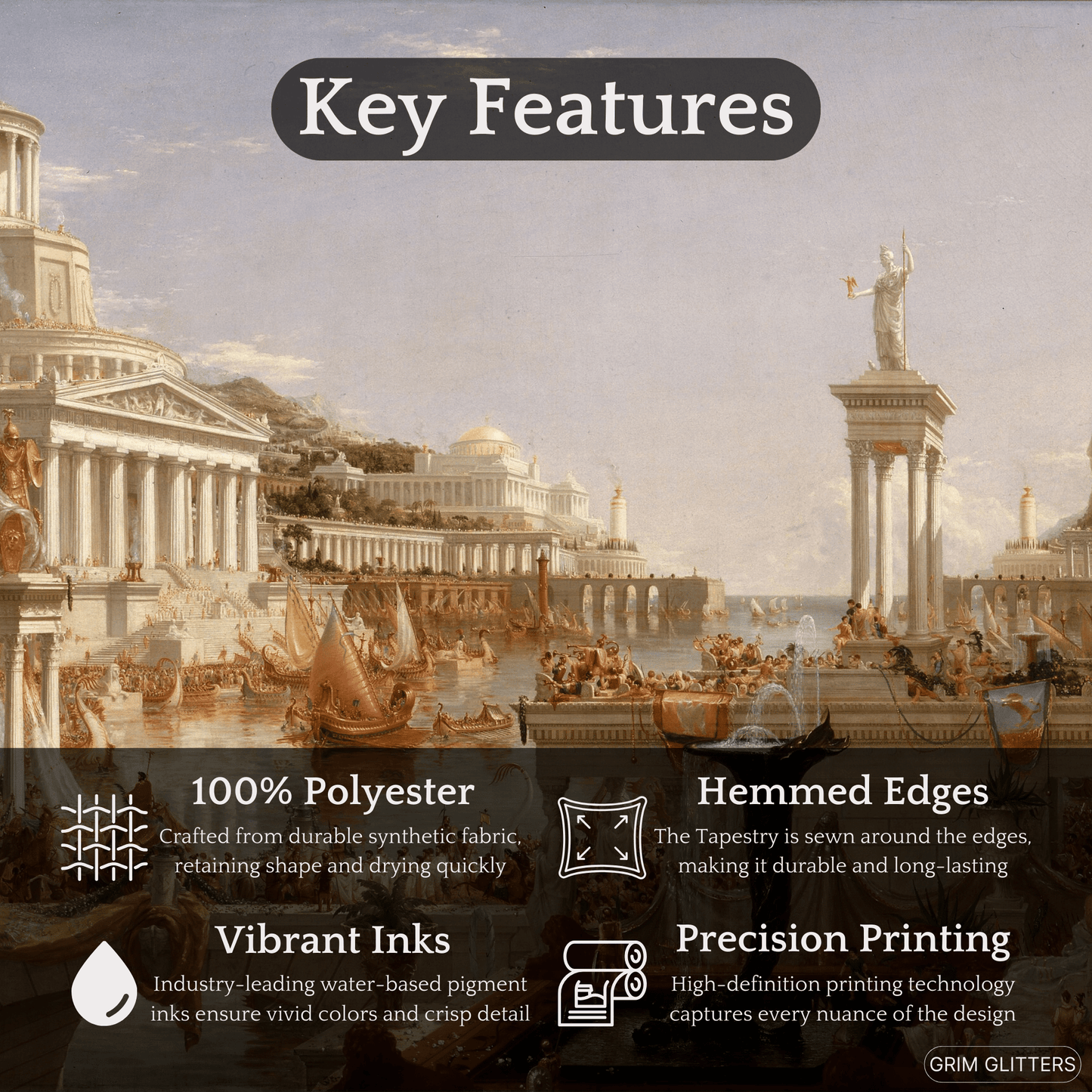 Made from high-quality polyester, this tapestry is designed to endure, with bright, lasting colors and hemmed edges that provide a refined finish. Its detailed depiction of Cole's artwork ensures that every brushstroke is captured with precision.
