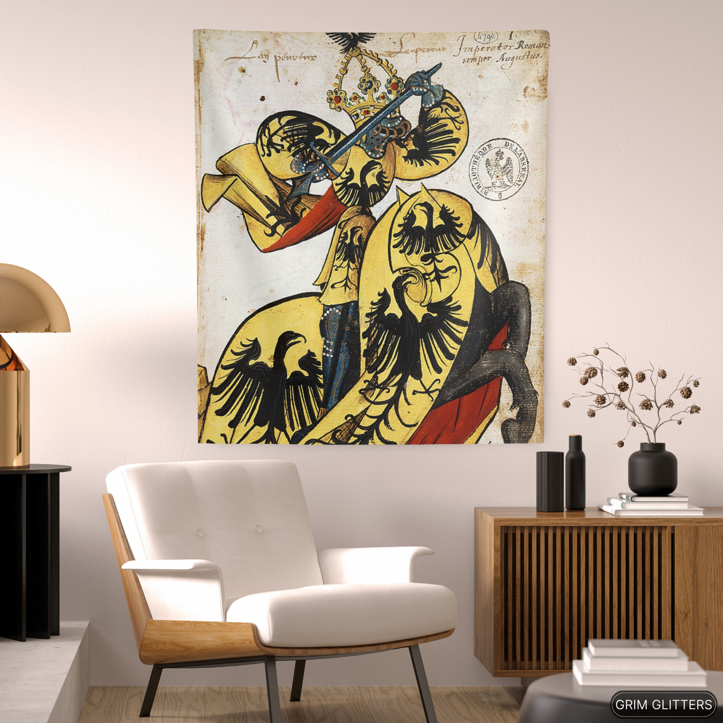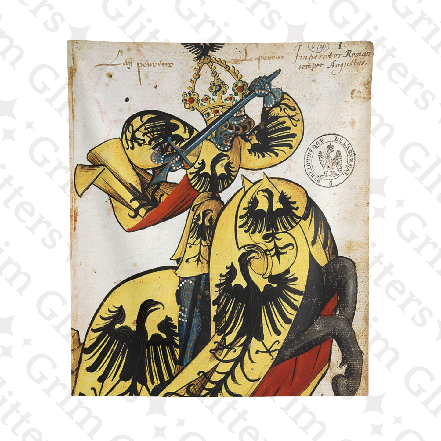 Bring the grandeur of medieval imperial power into your space with The Emperor of the Holy Roman Empire Tapestry, inspired by the Great Equestrian Armorial of the Golden Fleece. This remarkable artwork features the Emperor clad in golden jousting regalia, adorned with the striking black single-headed eagle—an enduring symbol of imperial authority. His majestic crowned helm and the richly decorated caparison of his horse capture the magnificence and prestige of medieval rulership, making this tapestry a perfect centerpiece for lovers of medieval history, heraldry, and historic decor.