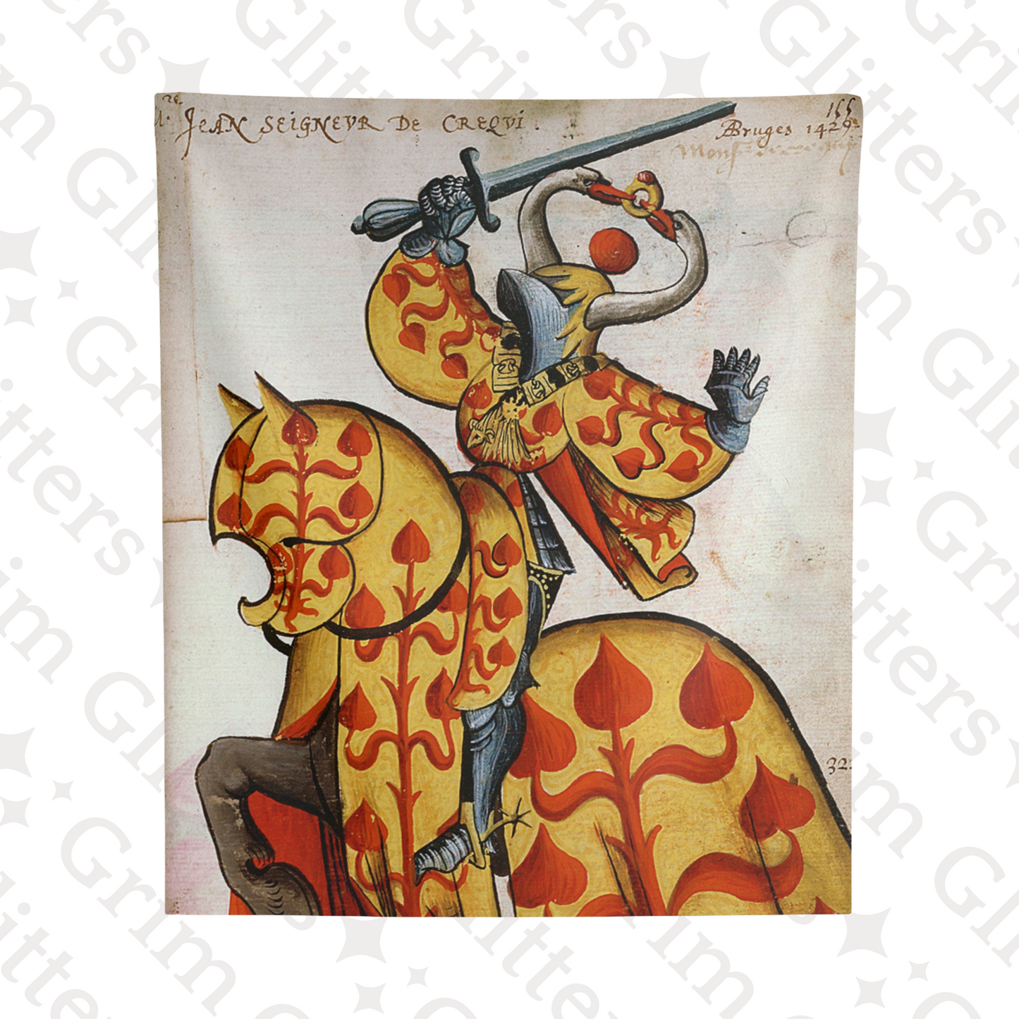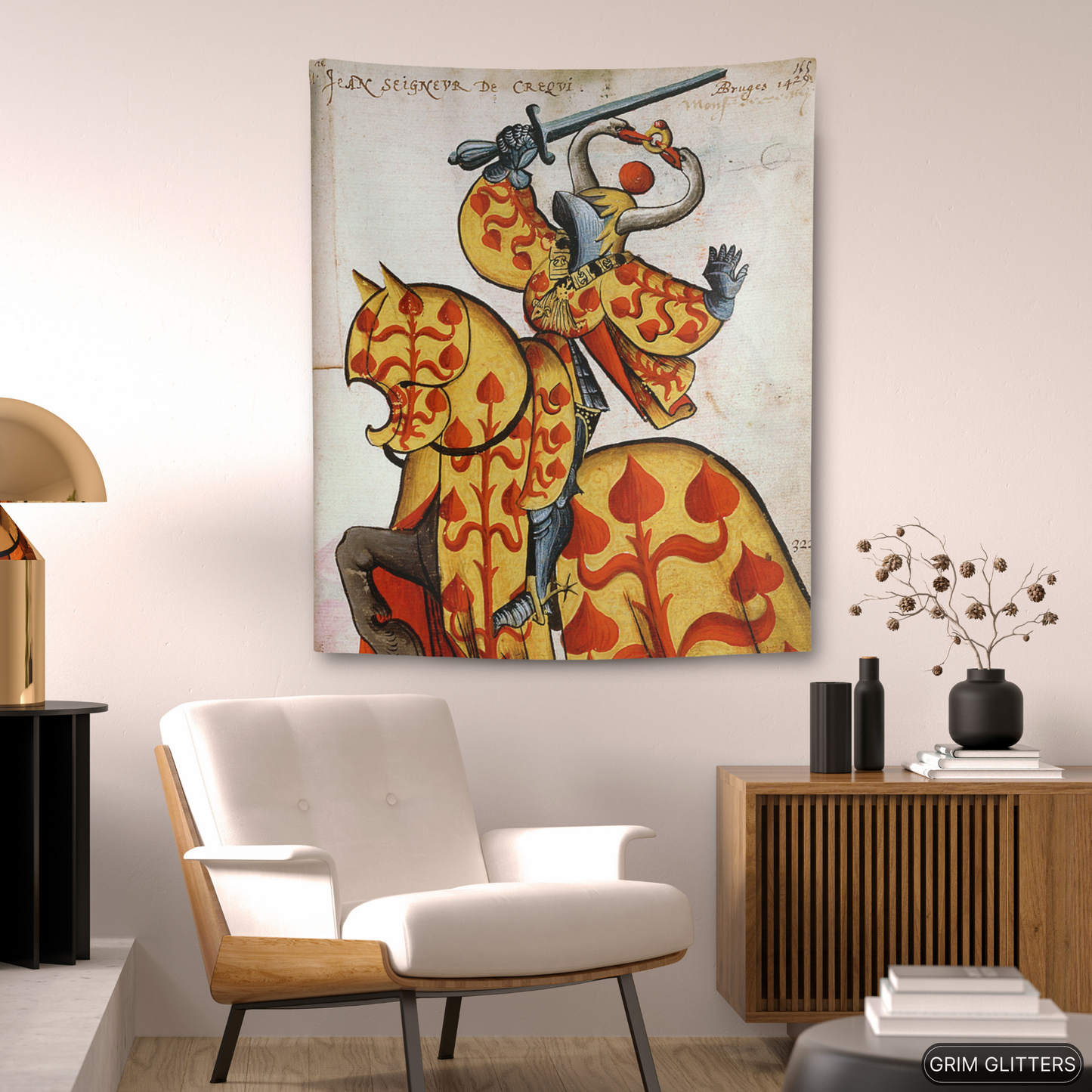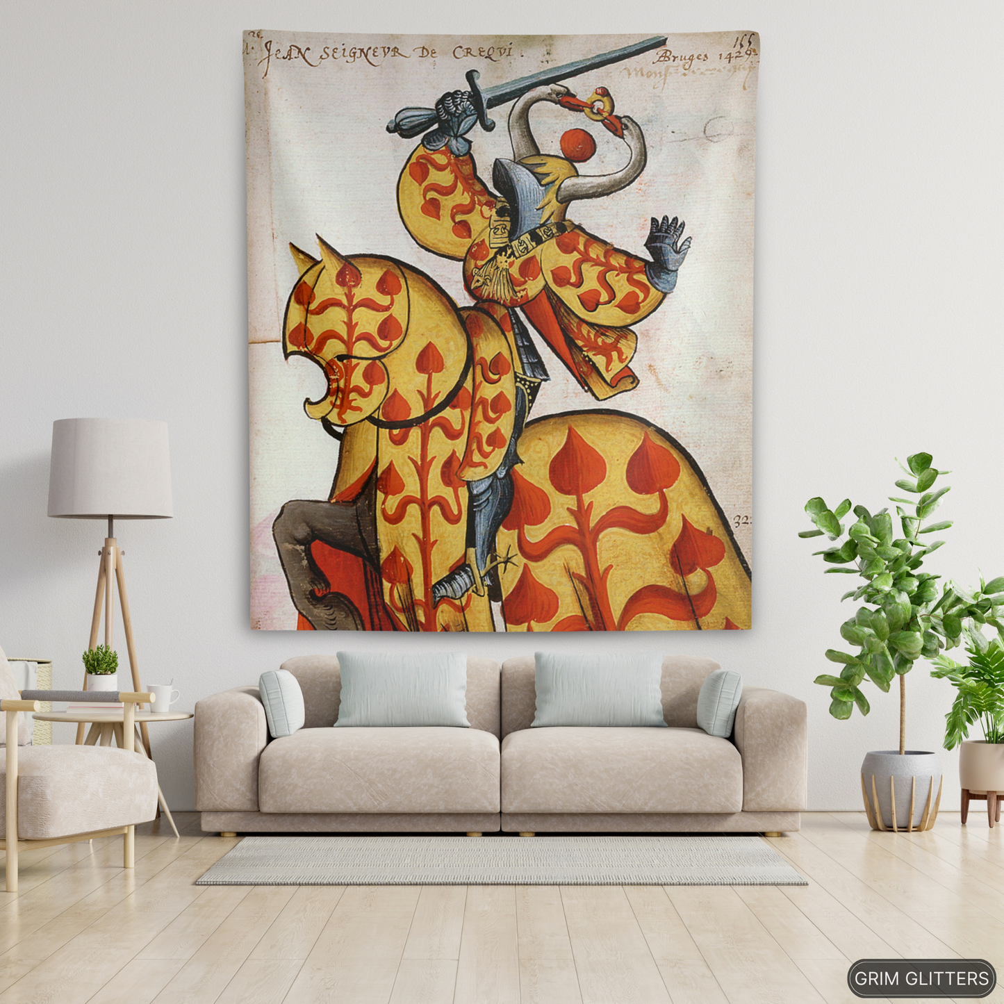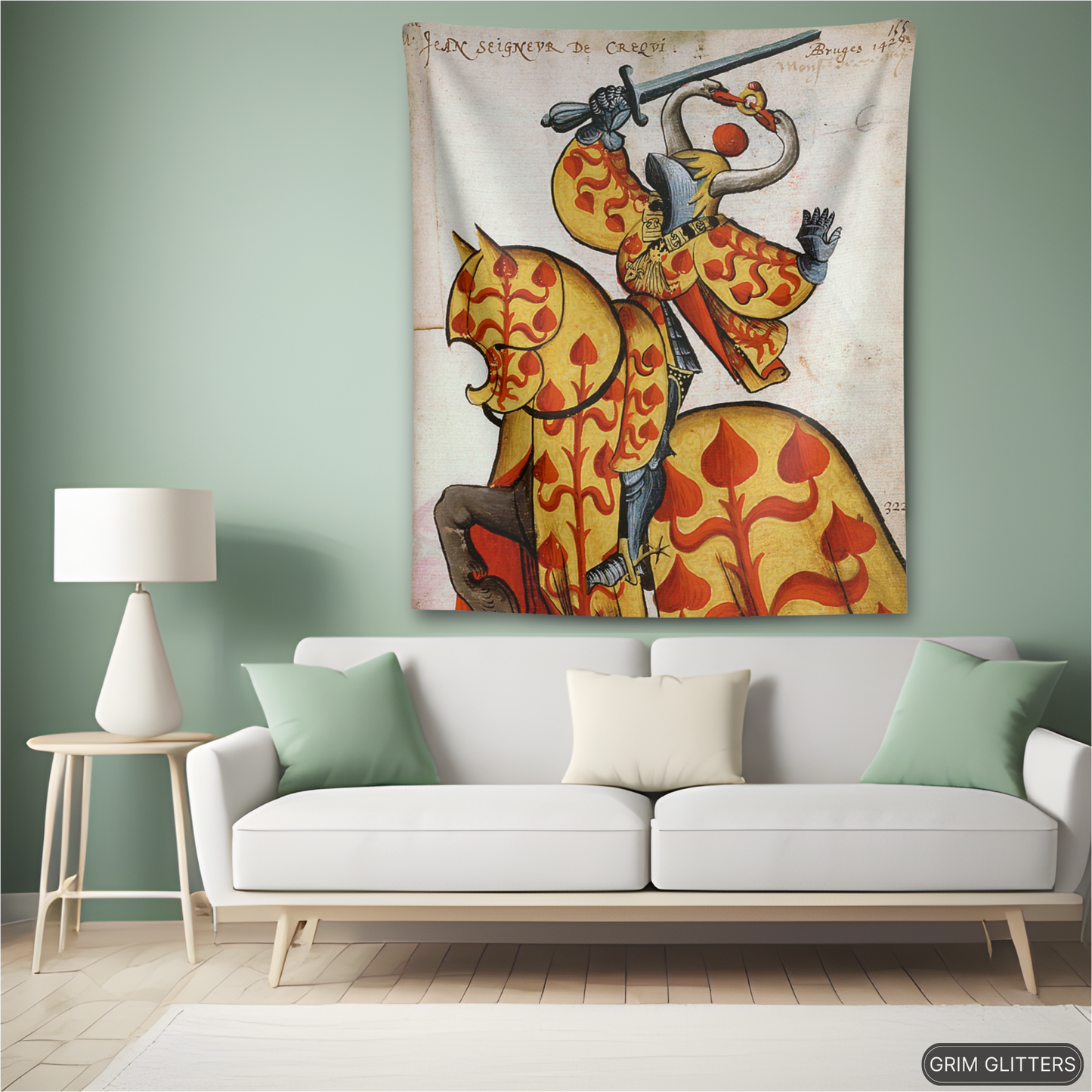 Immerse yourself in the splendor of medieval heraldry with The Lord of Crequi Tapestry, featuring the noble Jean de Créquy. This captivating design, inspired by the Great Equestrian Armorial of the Golden Fleece, showcases Jean adorned in a vibrant gold and red surcoat, with patterns of stylized flames and spades symbolizing power and valor. His elaborate helm, crowned with two regal swan heads holding a golden ring, radiates an aura of prestige and knightly honor. Perfect for medieval enthusiasts and history aficionados, this tapestry brings an air of chivalric magnificence to your decor.
