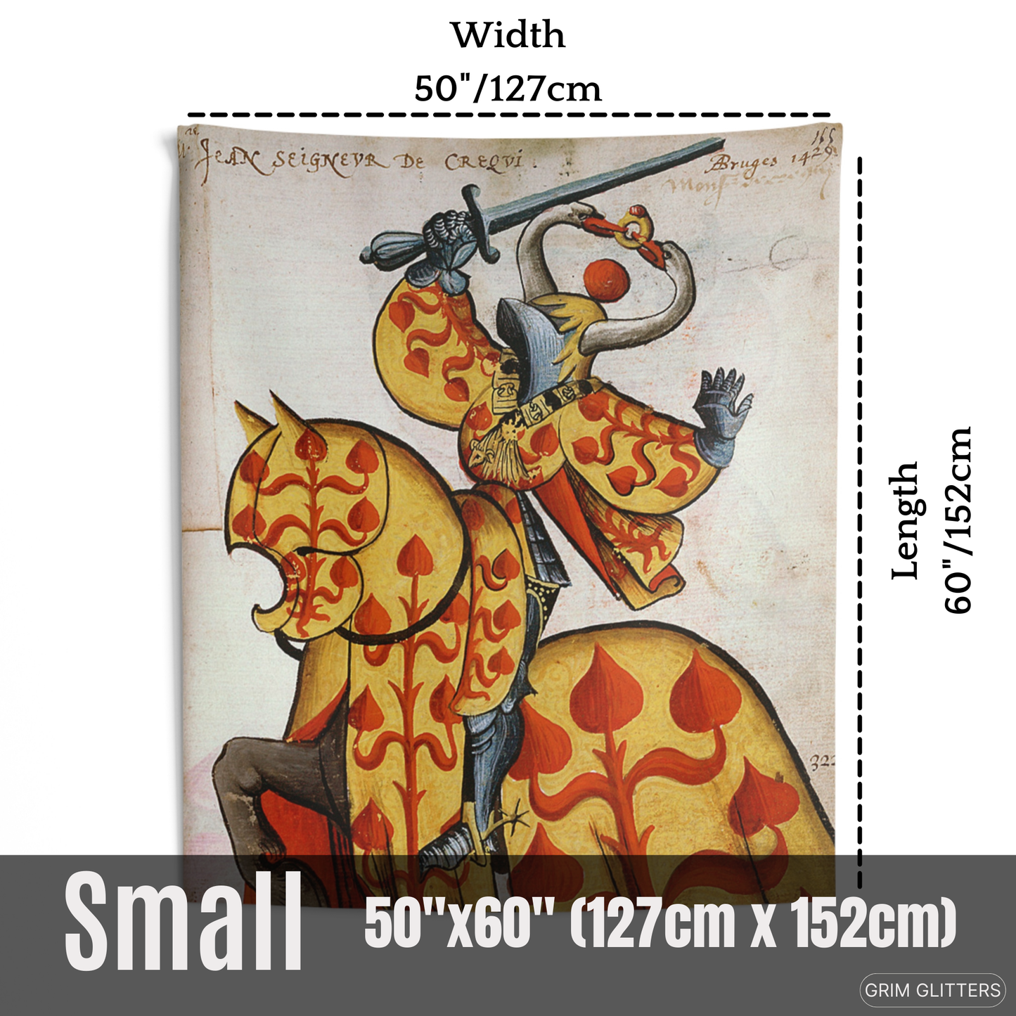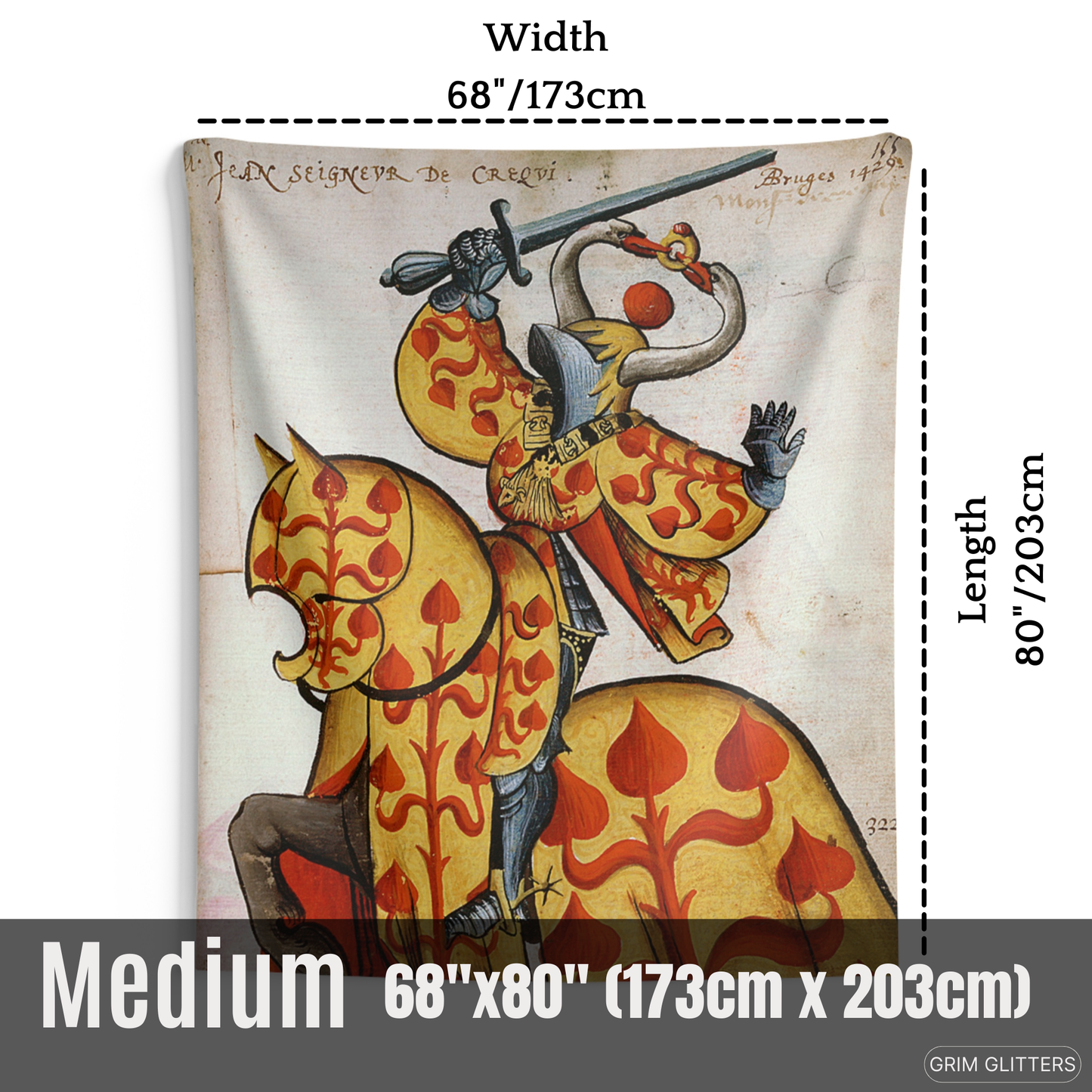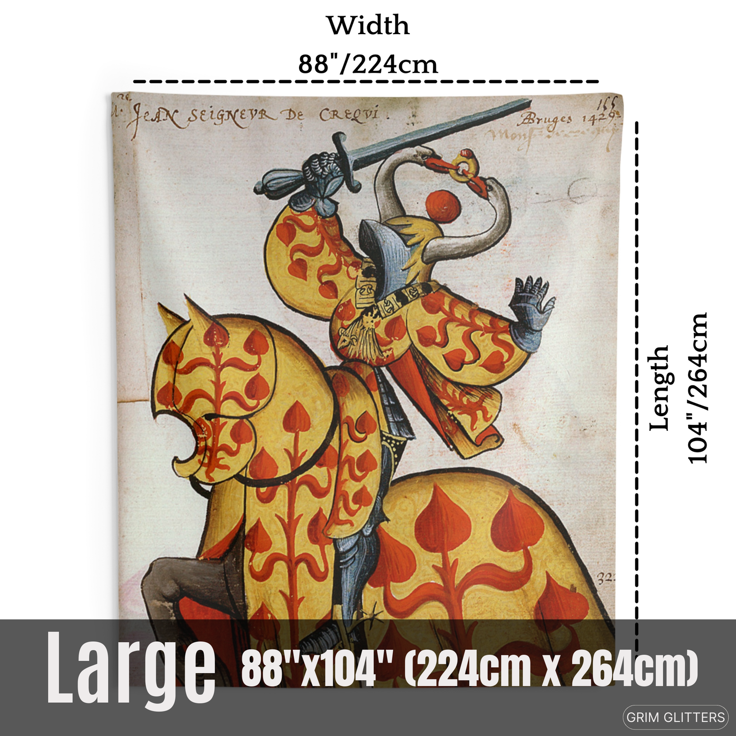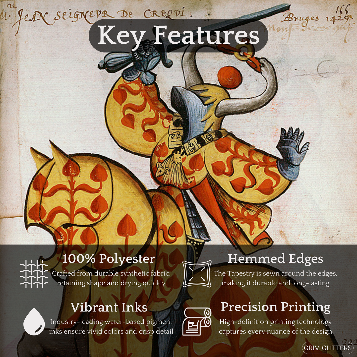Immerse yourself in the splendor of medieval heraldry with The Lord of Crequi Tapestry, featuring the noble Jean de Créquy. This captivating design, inspired by the Great Equestrian Armorial of the Golden Fleece, showcases Jean adorned in a vibrant gold and red surcoat, with patterns of stylized flames and spades symbolizing power and valor. His elaborate helm, crowned with two regal swan heads holding a golden ring, radiates an aura of prestige and knightly honor. Perfect for medieval enthusiasts and history aficionados, this tapestry brings an air of chivalric magnificence to your decor.