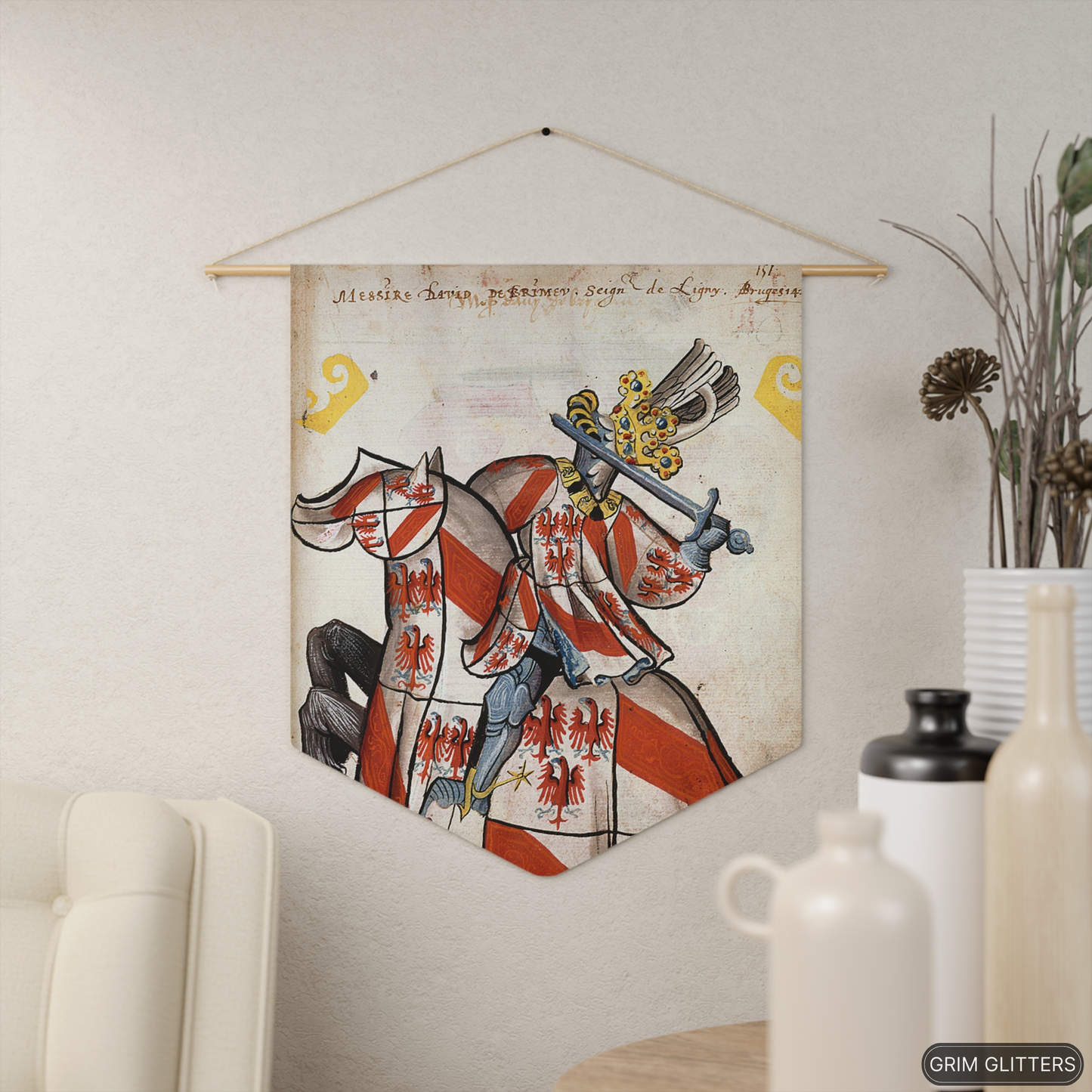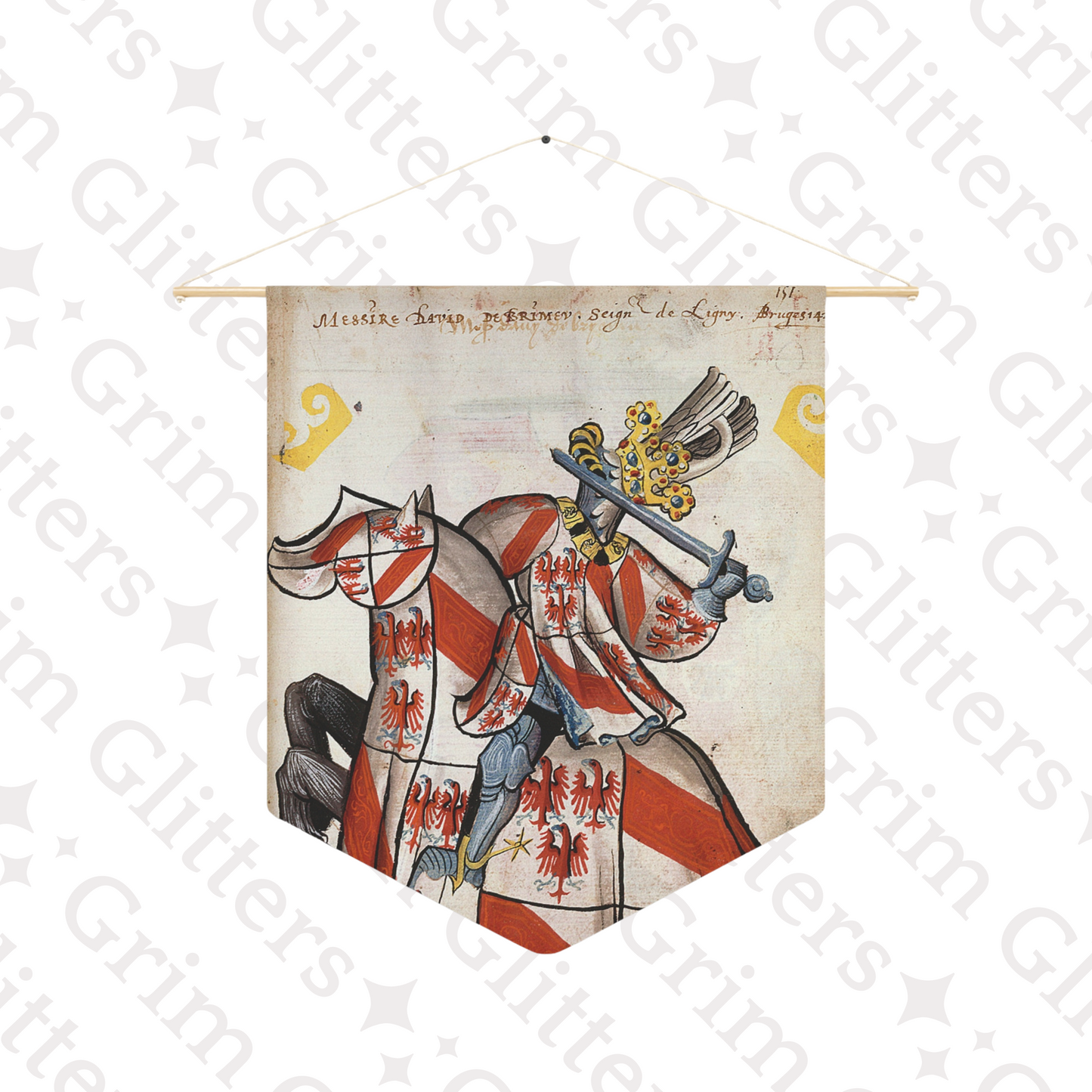 Celebrate the noble legacy of David de Brimeu, Lord of Ligny, with this captivating pennant banner inspired by the Great Equestrian Armorial of the Golden Fleece. This banner showcases David de Brimeu in tournament regalia, featuring bold red eagles on a white and red-striped field. His magnificent helm is adorned with white swan wings, symbolizing grace, nobility, and the chivalric ideals of his lineage.