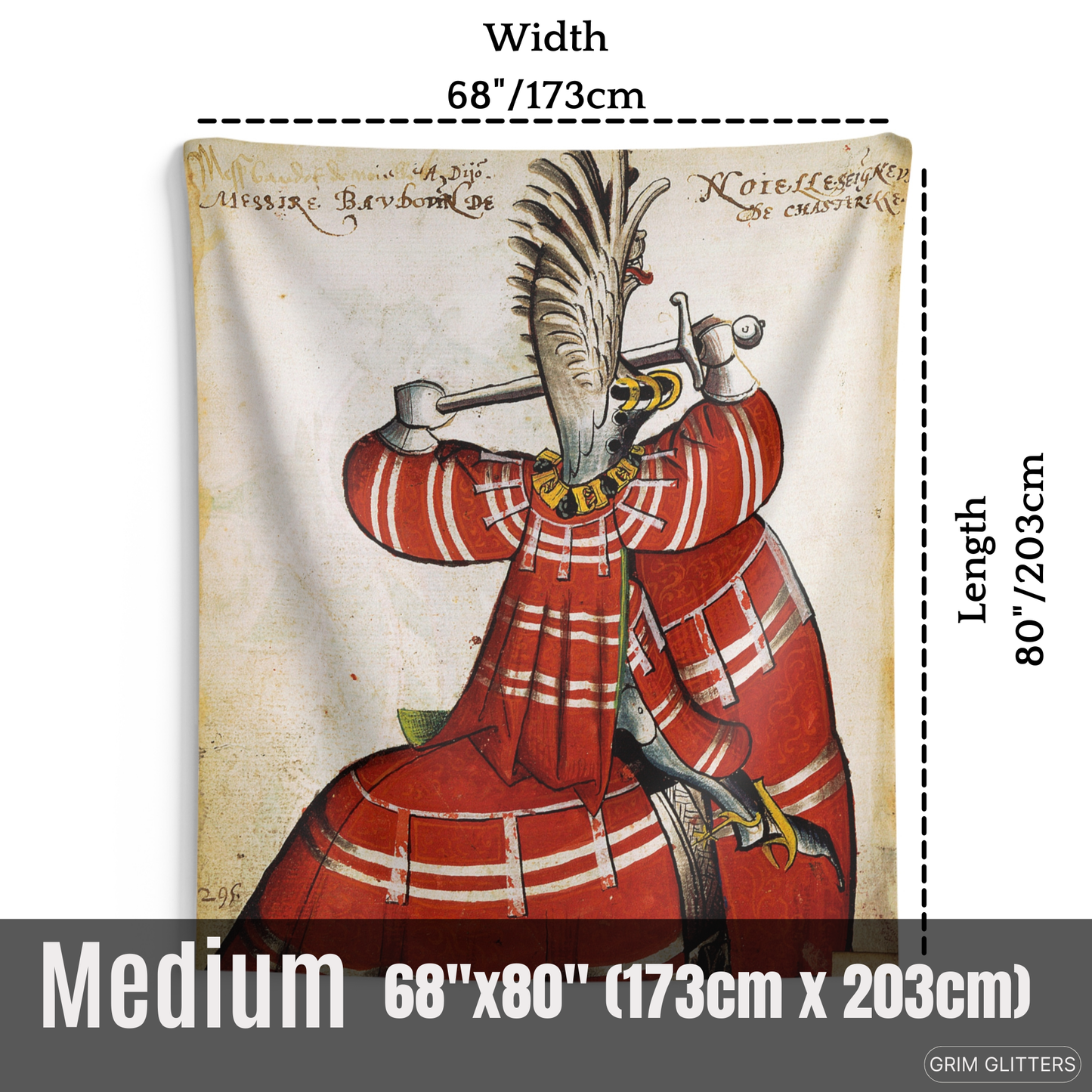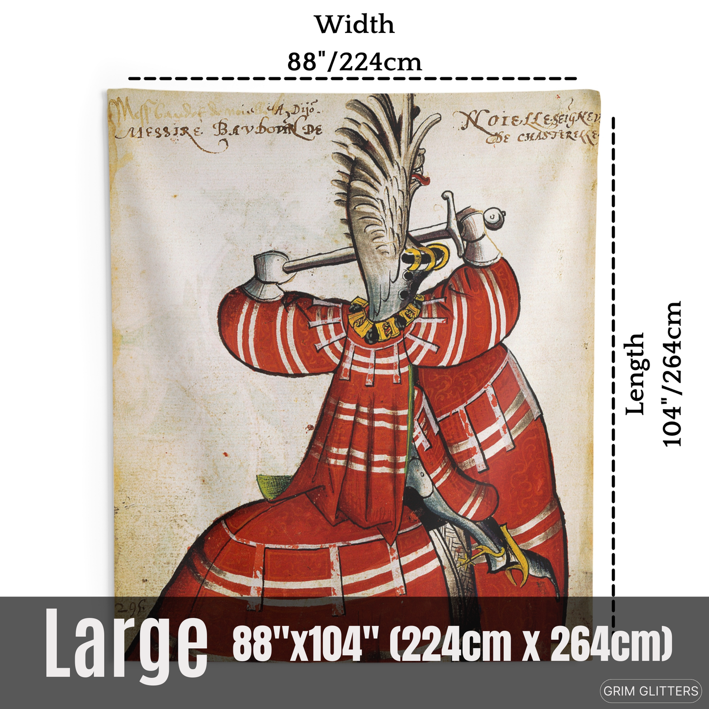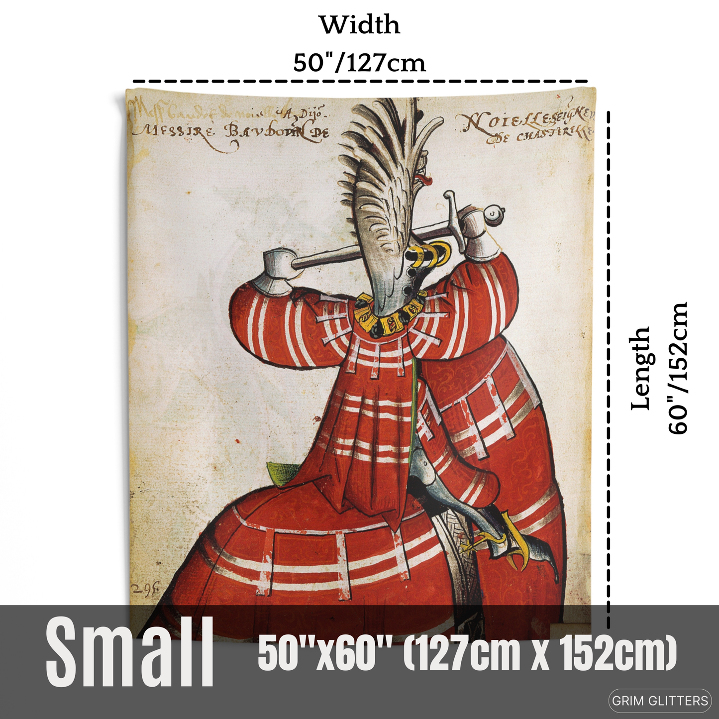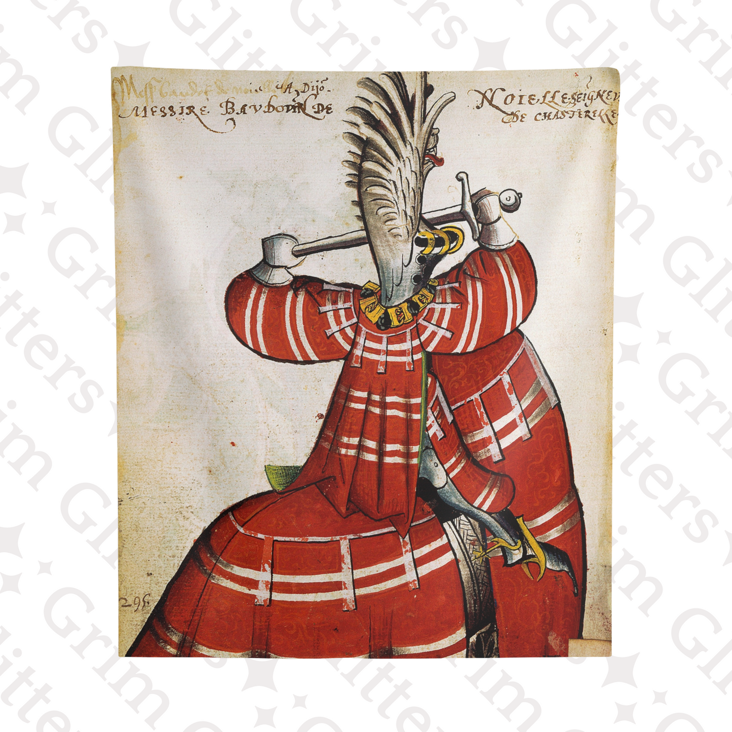 Honor the grandeur of medieval knighthood with The Lord of Noyelles Tapestry, inspired by the Great Equestrian Armorial of the Golden Fleece. This striking artwork portrays Baudot de Noyelles-Wion, magnificently clad in red jousting regalia, his surcoat and horse's caparison adorned with bold white stripes. Wearing a dramatic winged helm and gripping his sword in a poised combat stance, this tapestry embodies the elegance and power of medieval chivalry, making it an extraordinary piece for historic decor and medieval art enthusiasts.