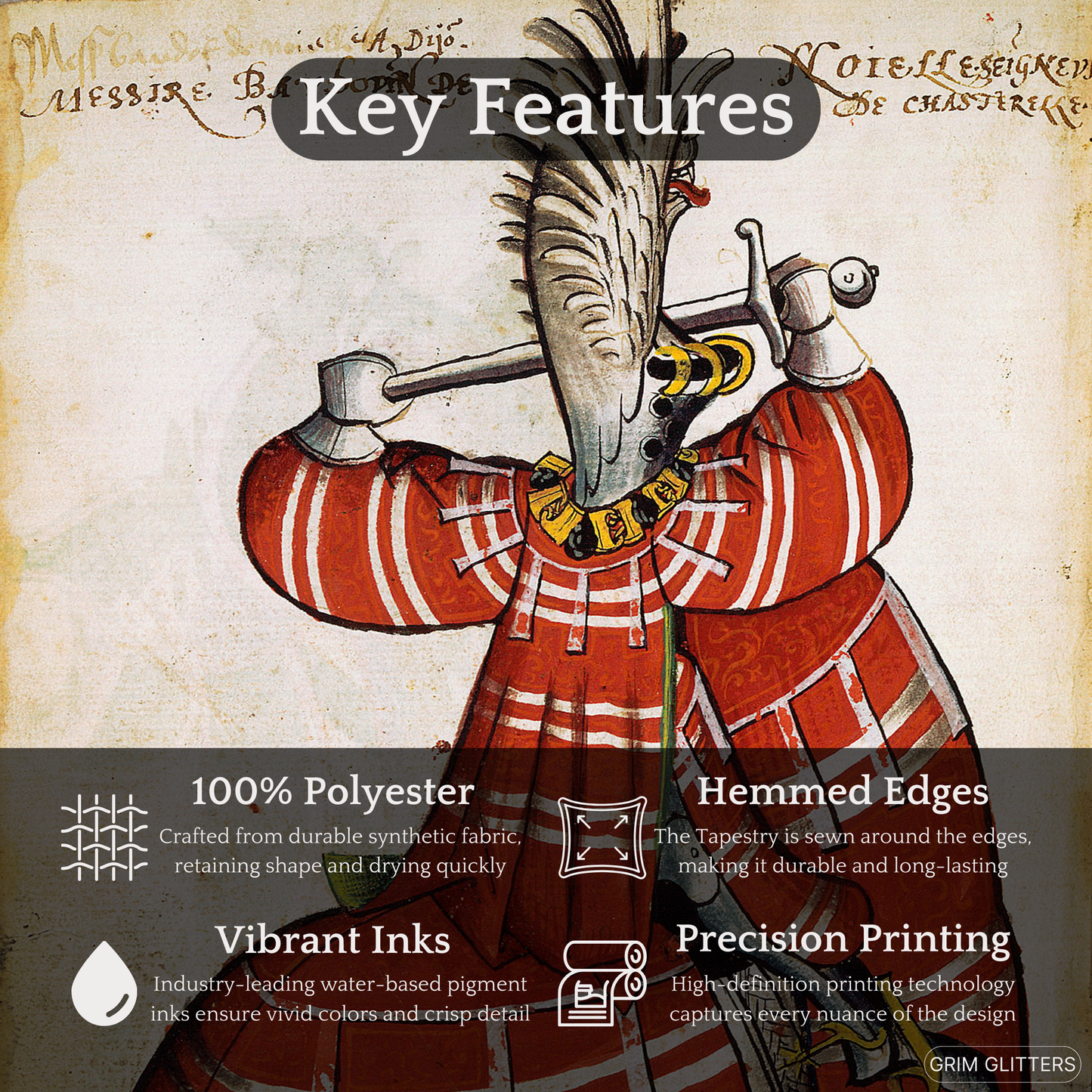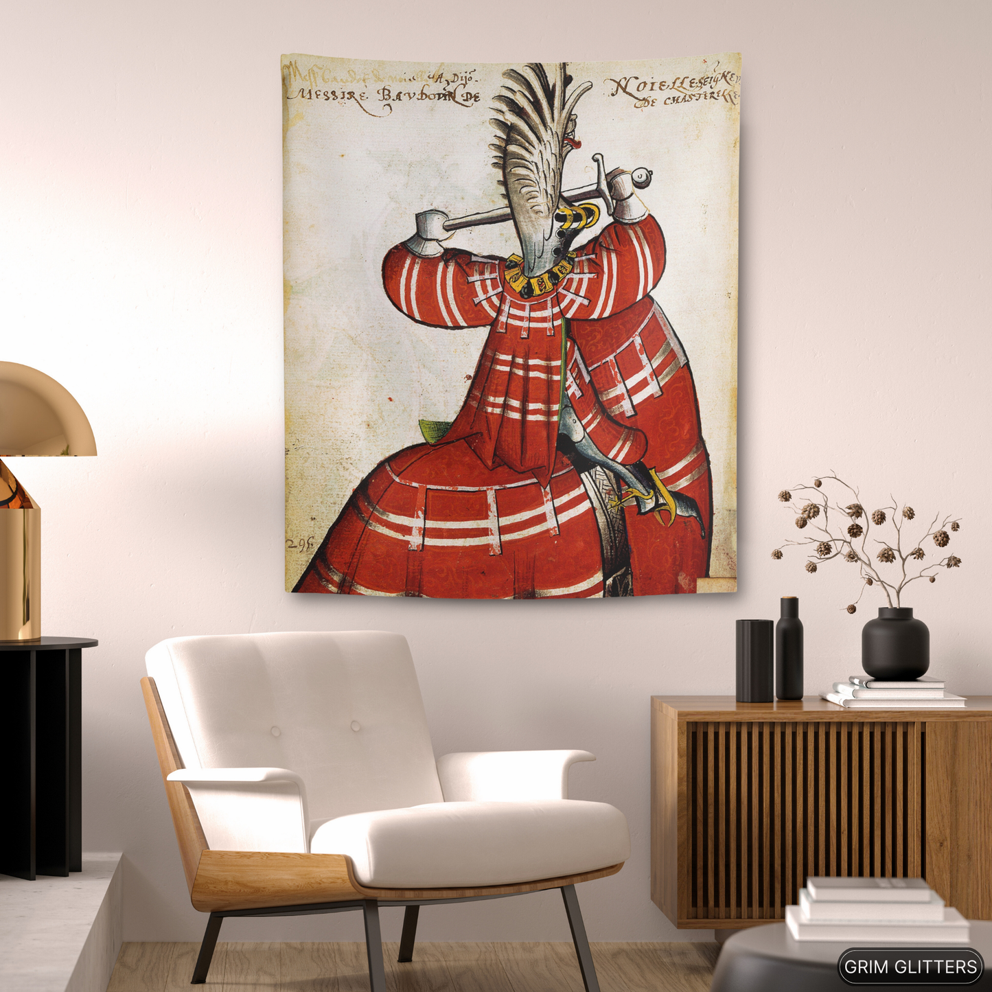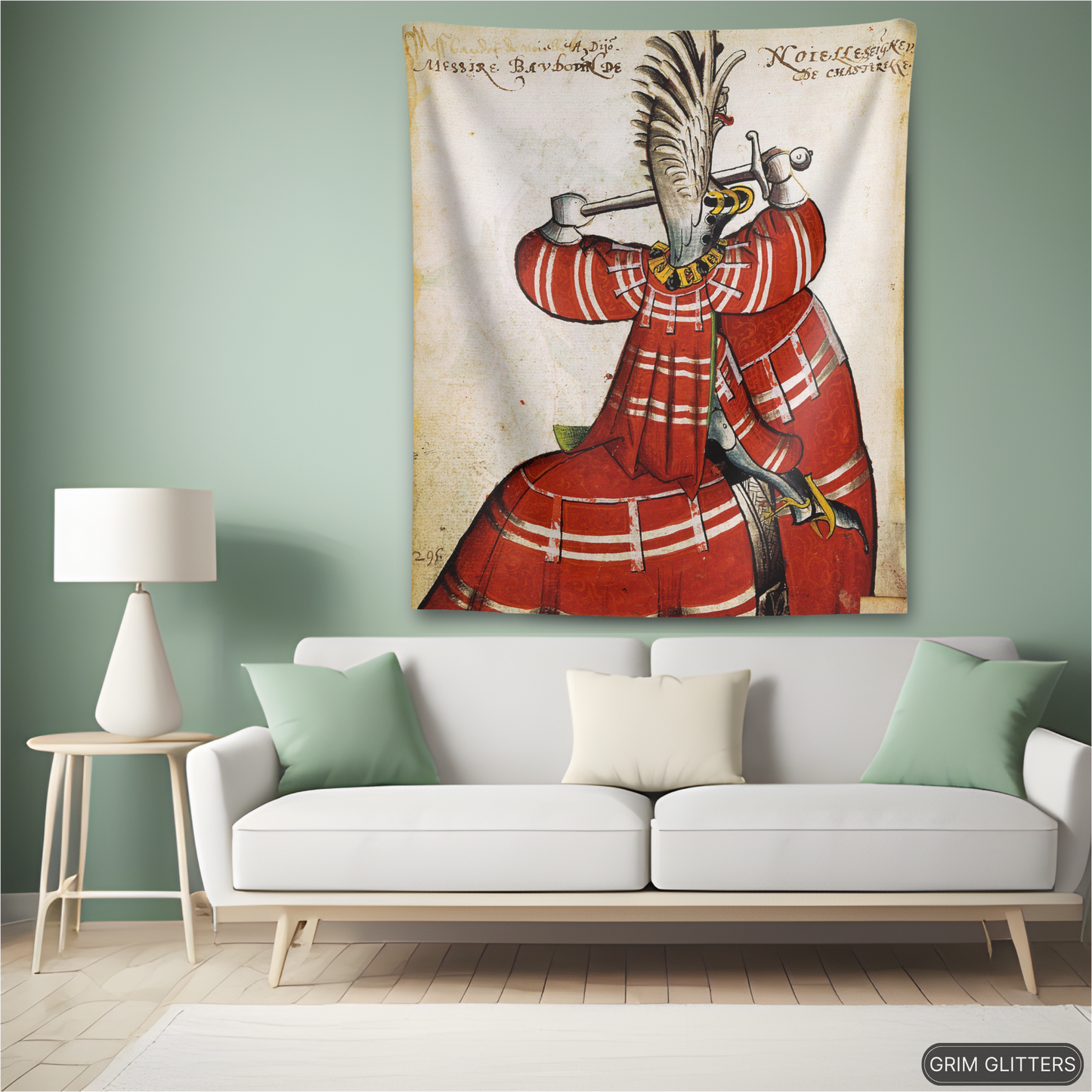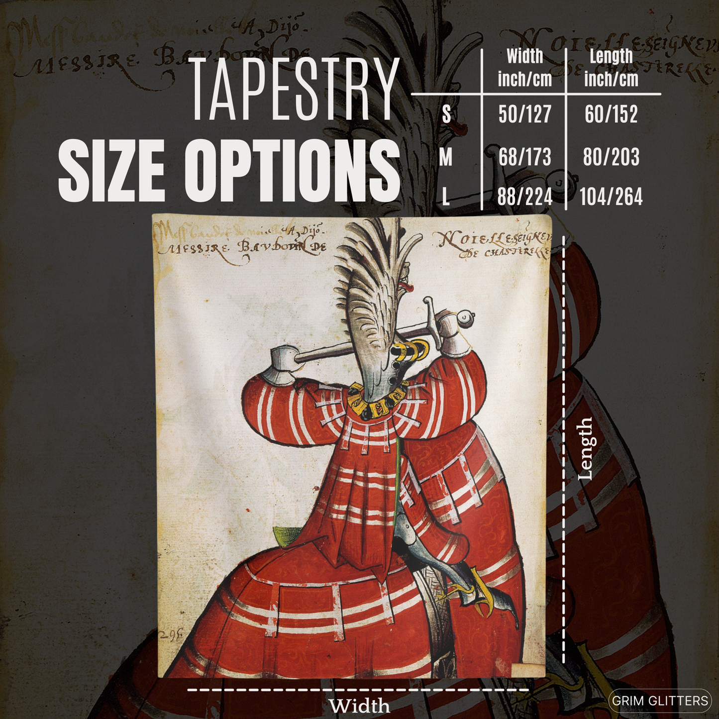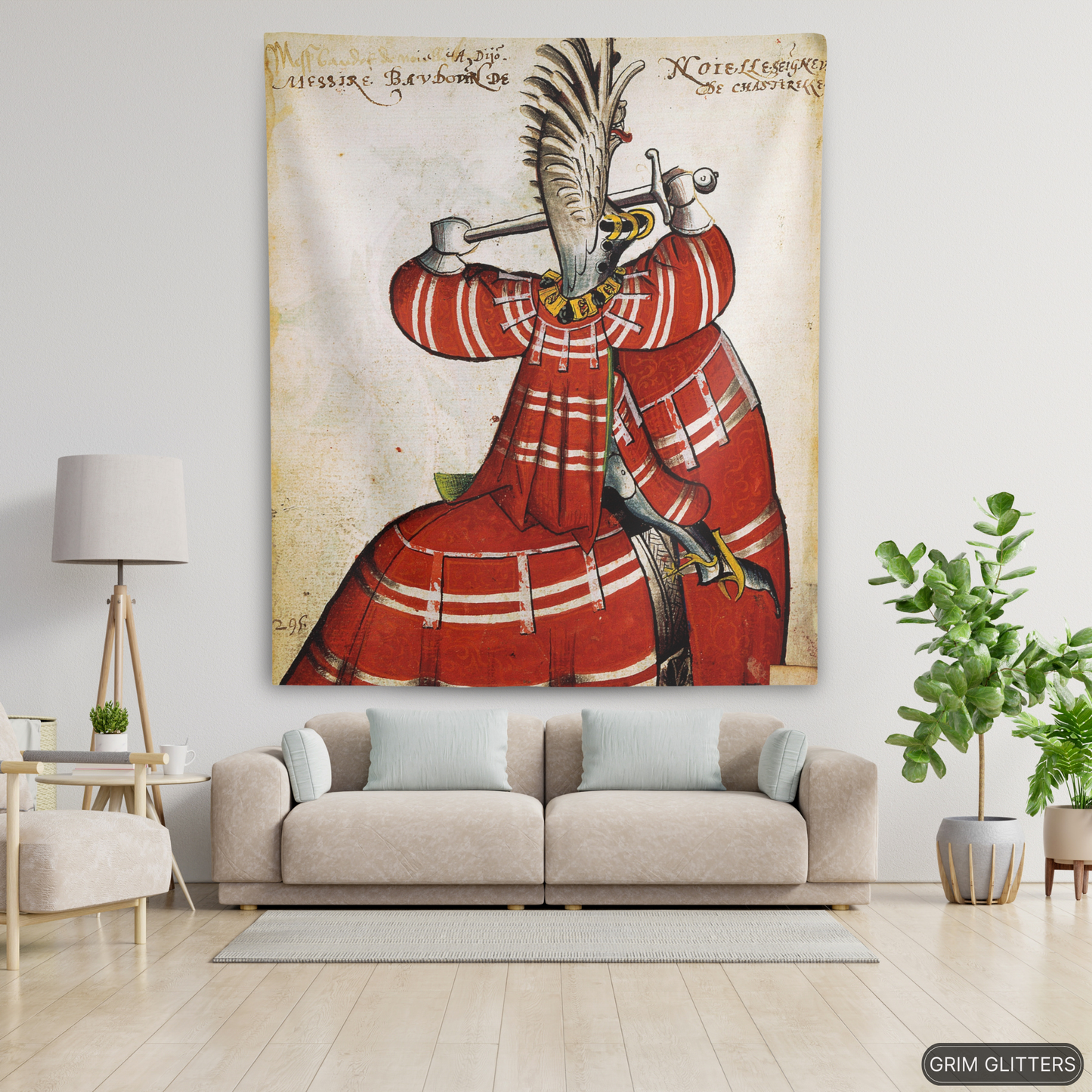 Honor the grandeur of medieval knighthood with The Lord of Noyelles Tapestry, inspired by the Great Equestrian Armorial of the Golden Fleece. This striking artwork portrays Baudot de Noyelles-Wion, magnificently clad in red jousting regalia, his surcoat and horse's caparison adorned with bold white stripes. Wearing a dramatic winged helm and gripping his sword in a poised combat stance, this tapestry embodies the elegance and power of medieval chivalry, making it an extraordinary piece for historic decor and medieval art enthusiasts.