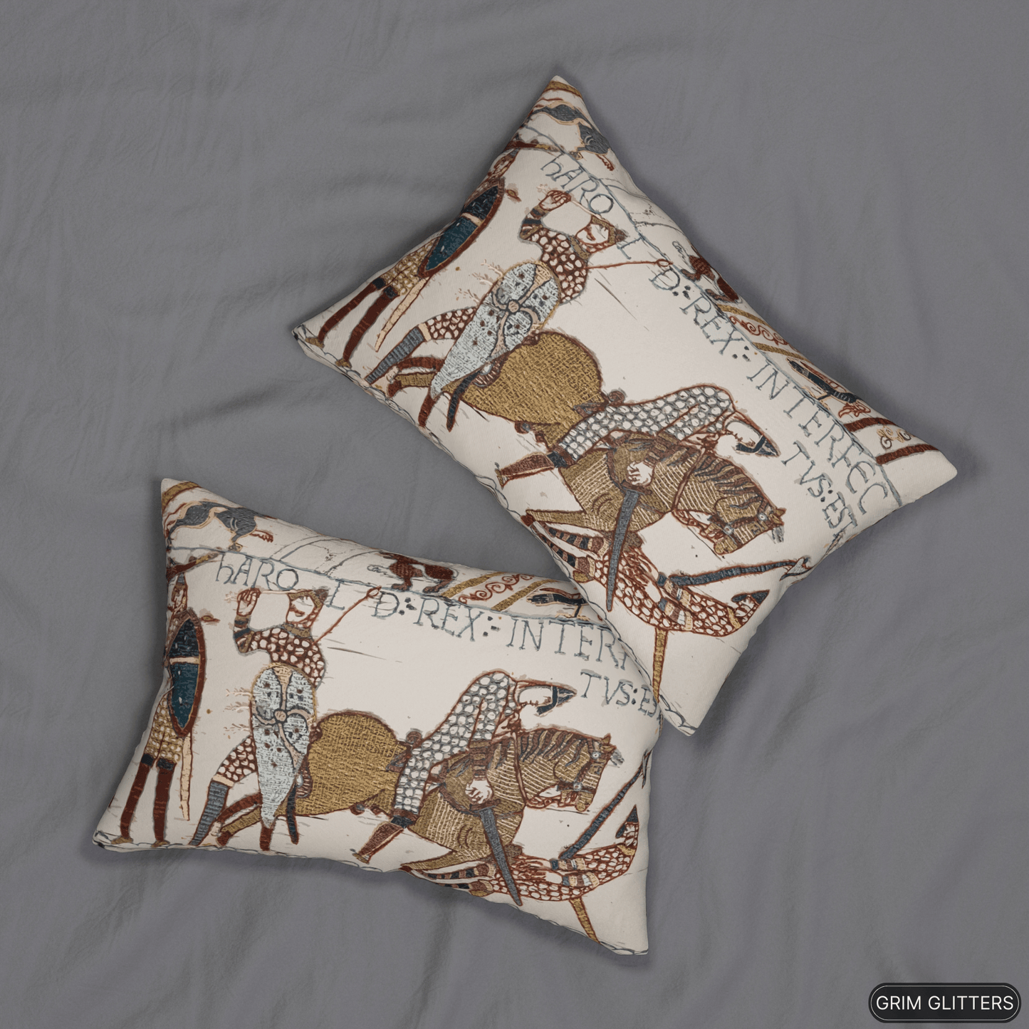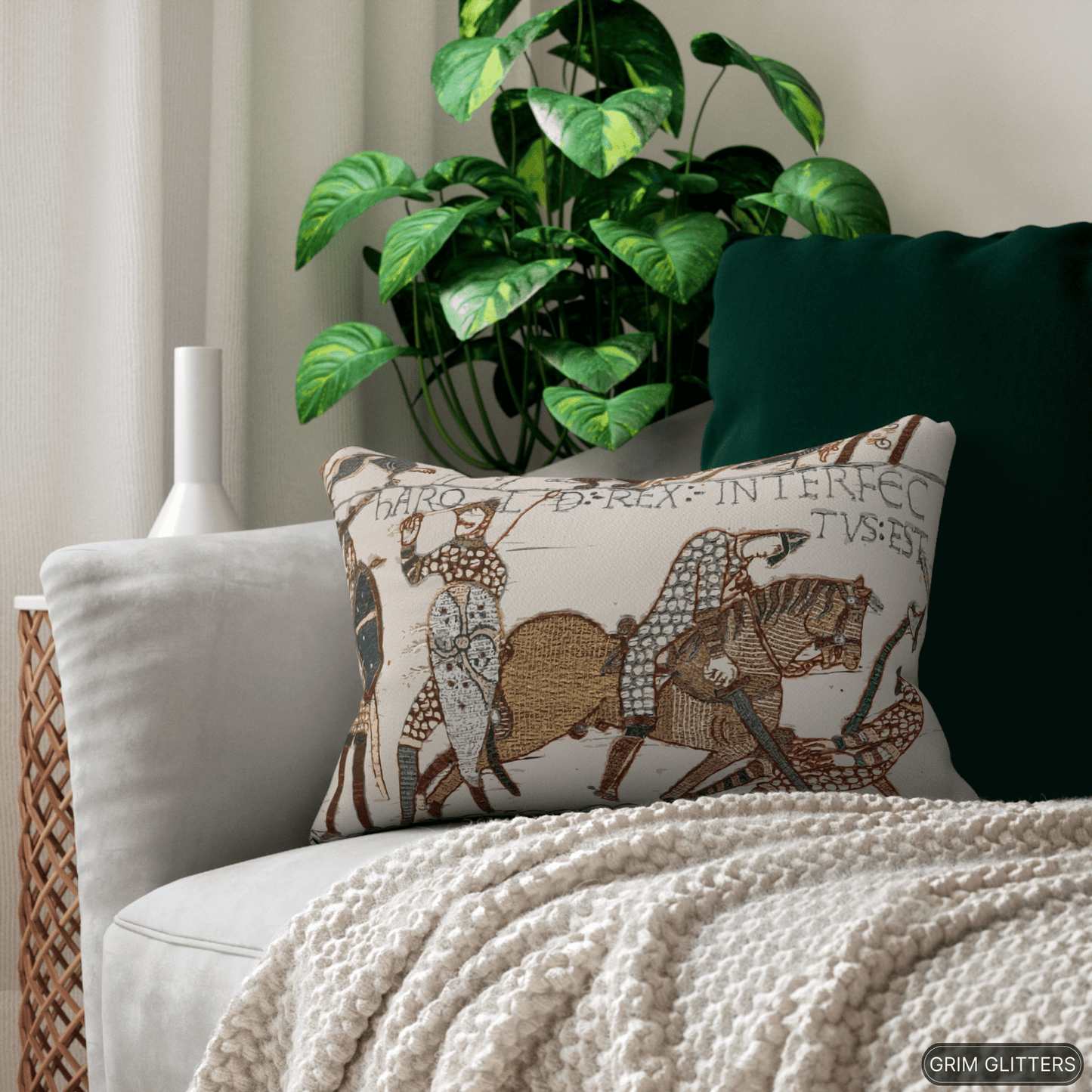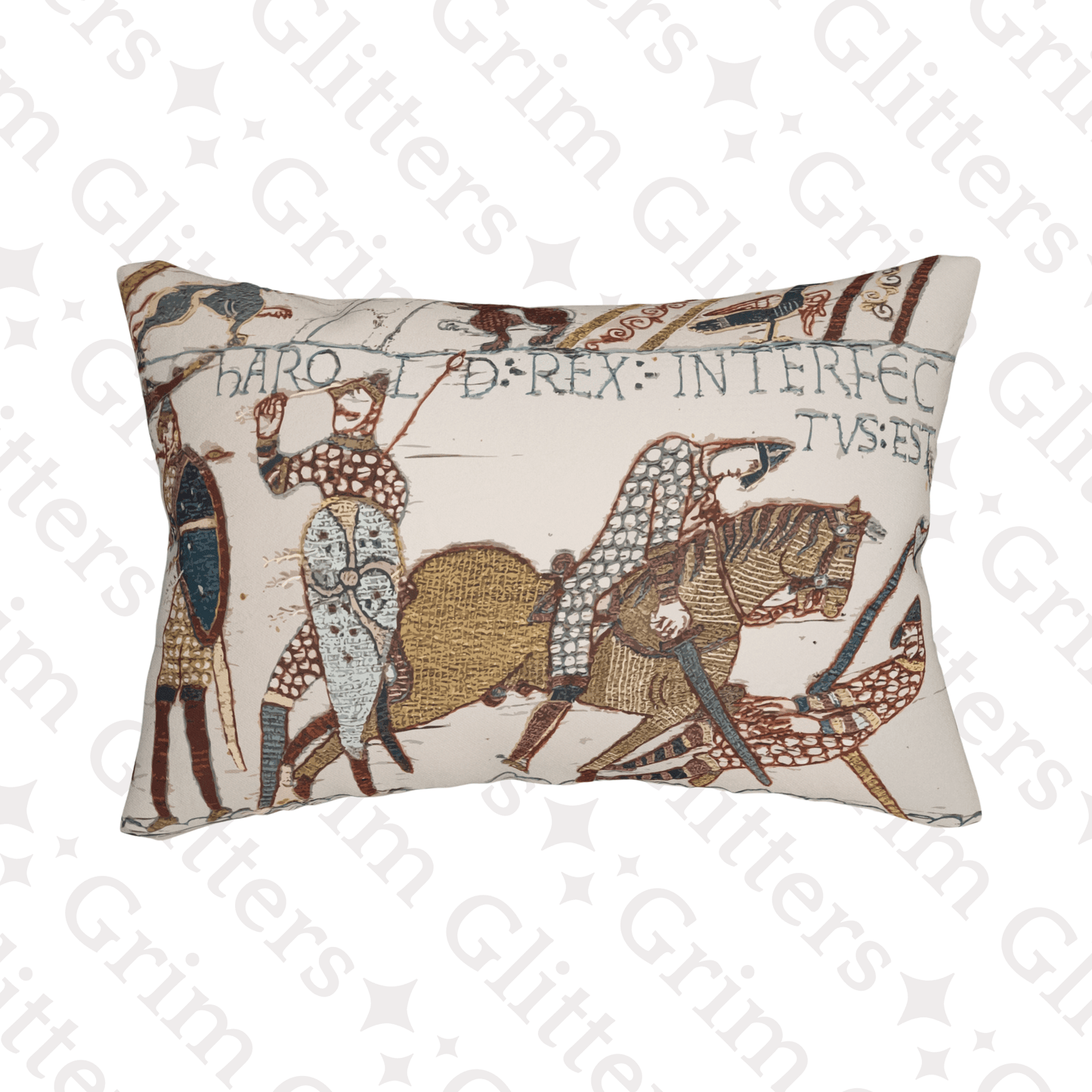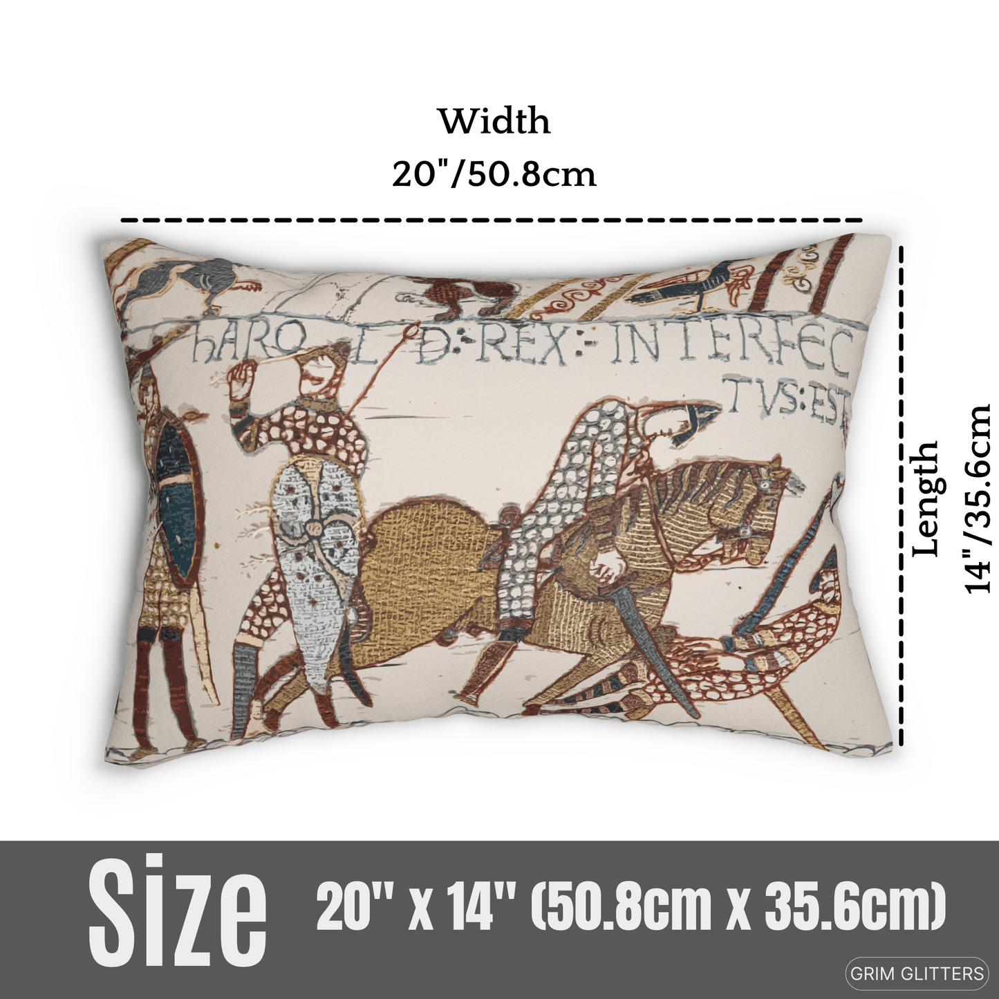 Enhance your home with the timeless beauty of our Bayeux Tapestry Lumbar Pillow - The Death of King Harold. Perfect for gifting or as a cherished addition to your own collection, this enchanting throw pillow brings the rich history and artistry of the medieval era to any space.