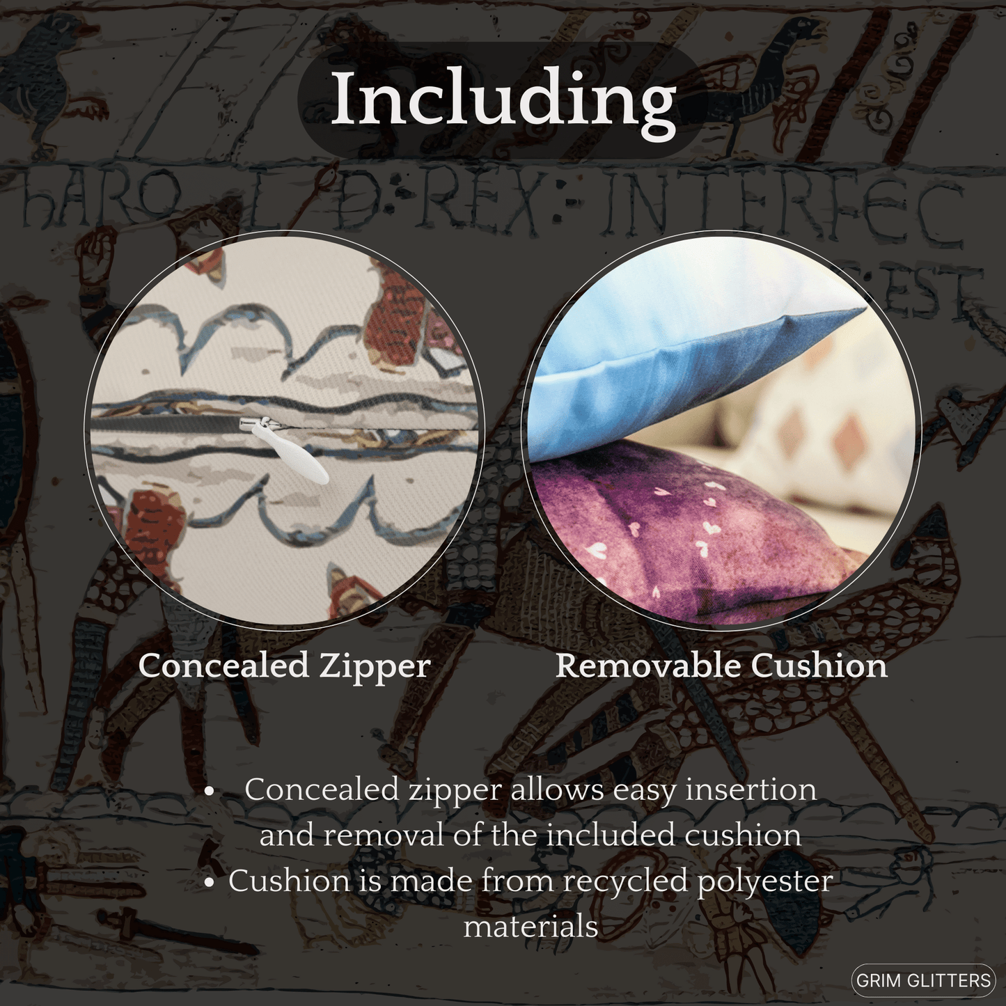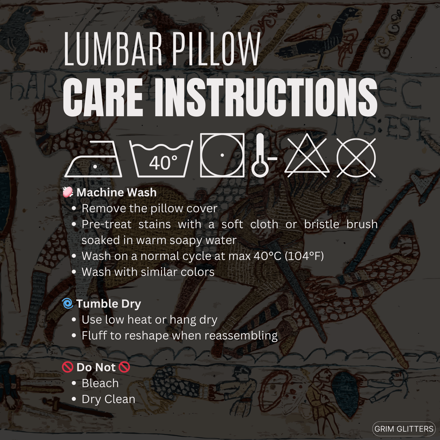 Maintaining the beauty of your Bayeux Tapestry pillow is simple. Remove the cover and pre-treat any stains with a soft cloth or bristle brush soaked in warm soapy water. Machine wash on a normal cycle at a maximum of 40°C (104°F). Do not bleach, tumble dry on low, and avoid dry-cleaning. Iron, steam, or dry on low heat only. Fluff the insert to reshape when reassembling.