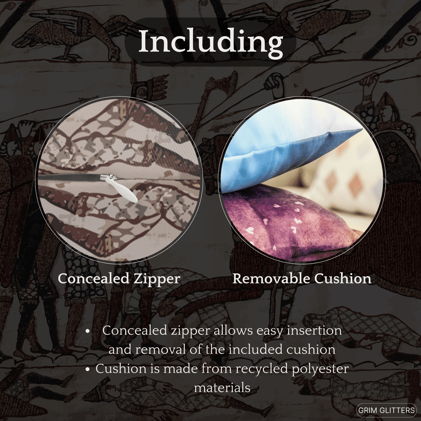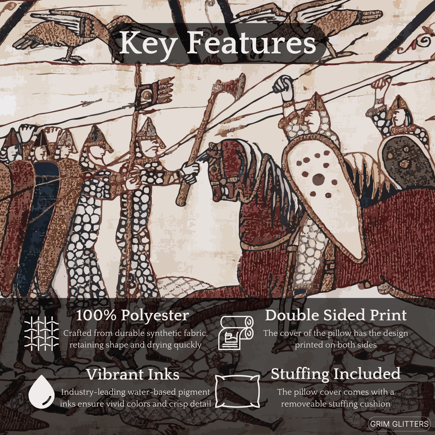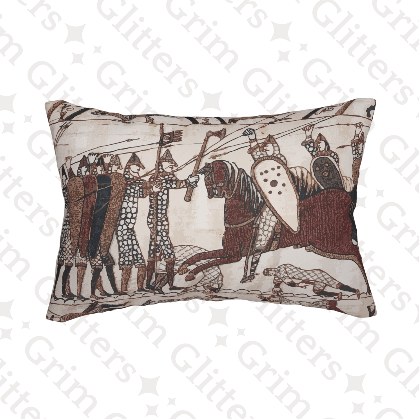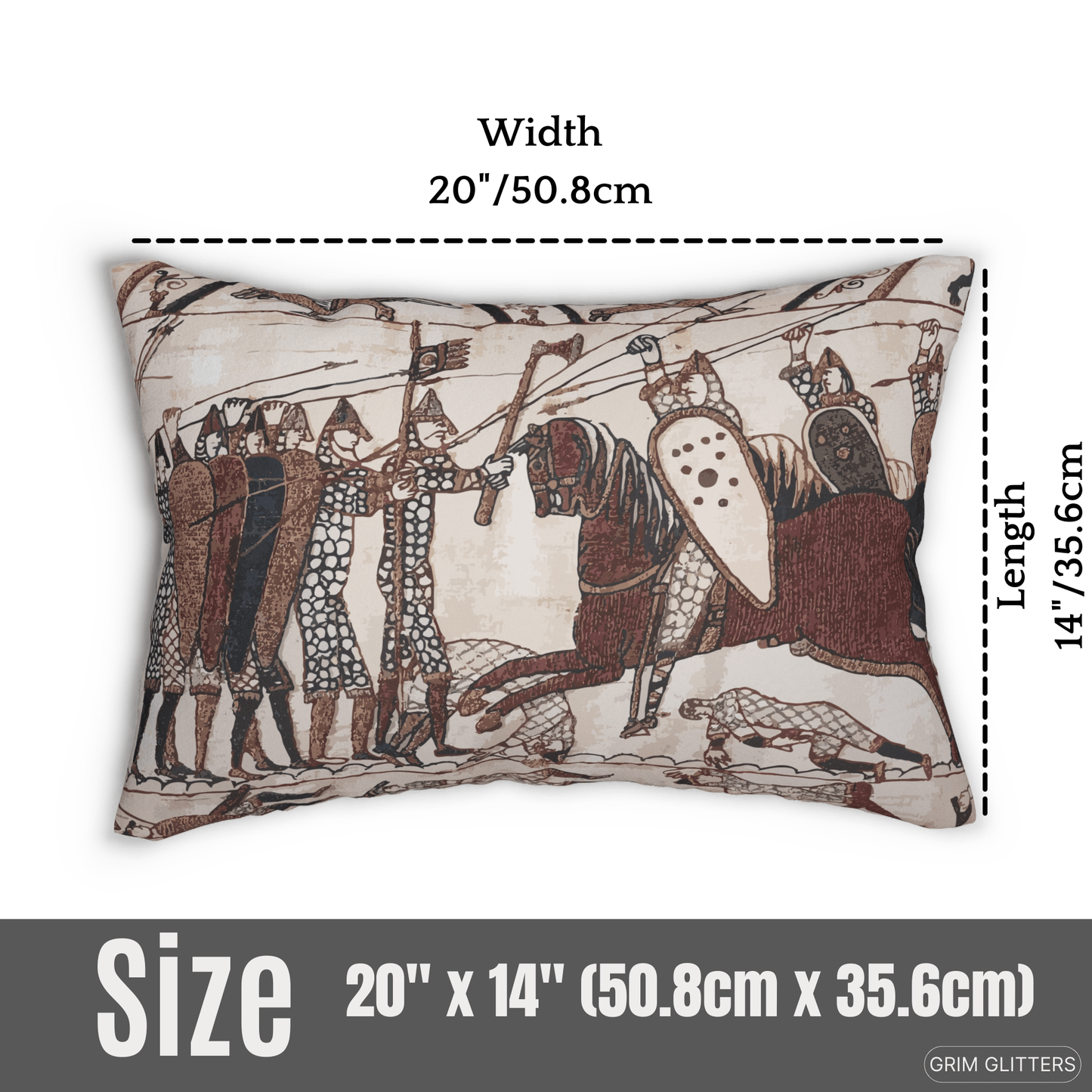 Bring the epic clash of medieval history into your home with our Bayeux Tapestry Lumbar Pillow. This stunning pillow, inspired by the iconic Bayeux Tapestry, vividly depicts the thrilling charge of Norman knights against Anglo-Saxon warriors during the Battle of Hastings, capturing the drama and valor of the historic Norman Conquest.