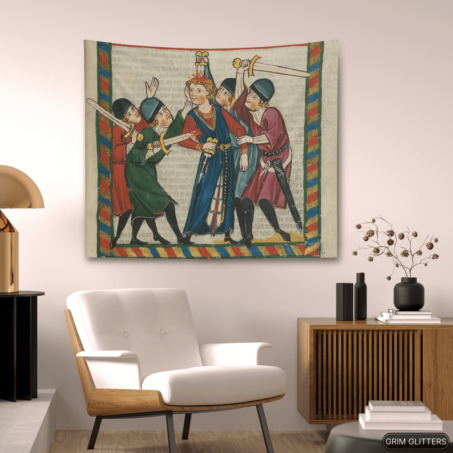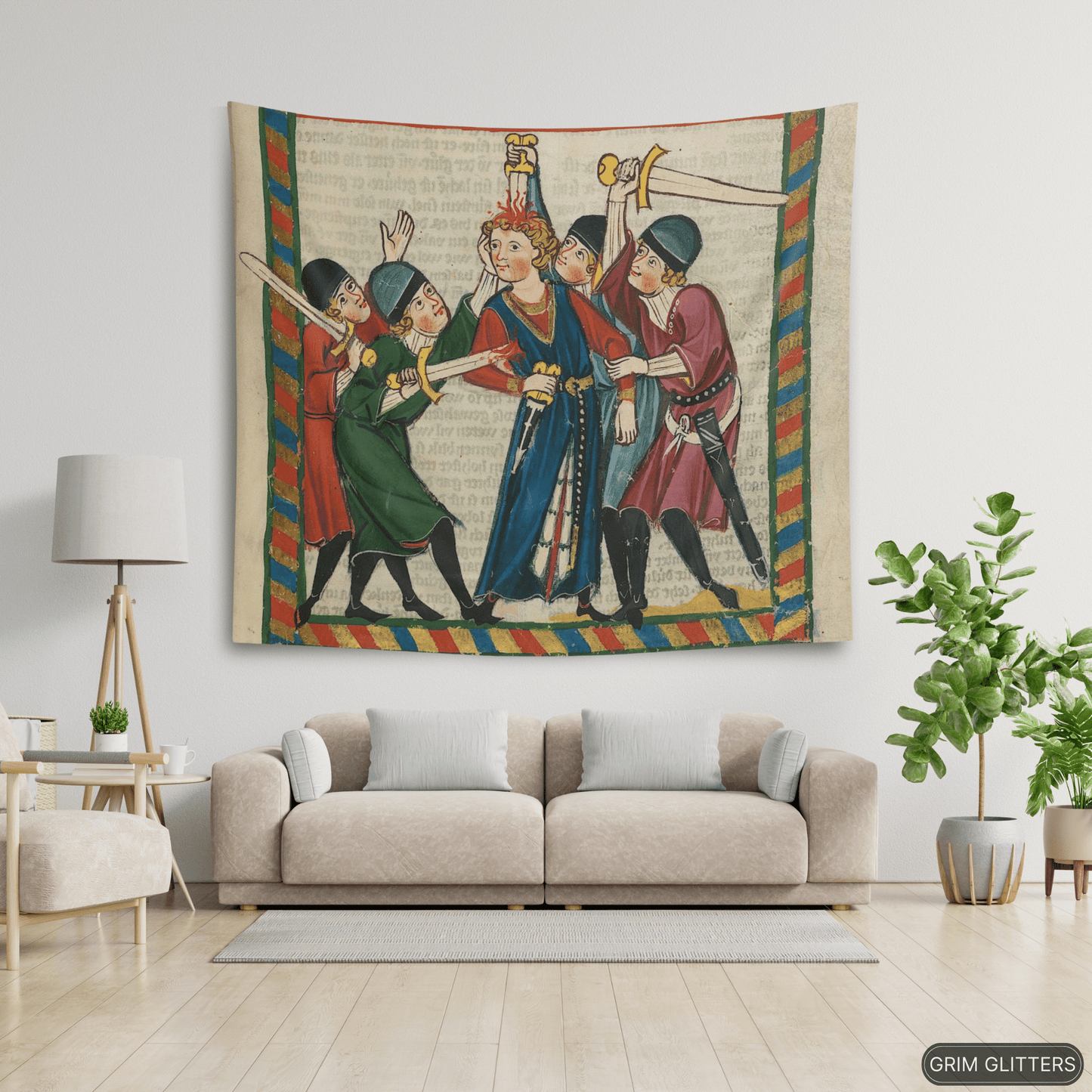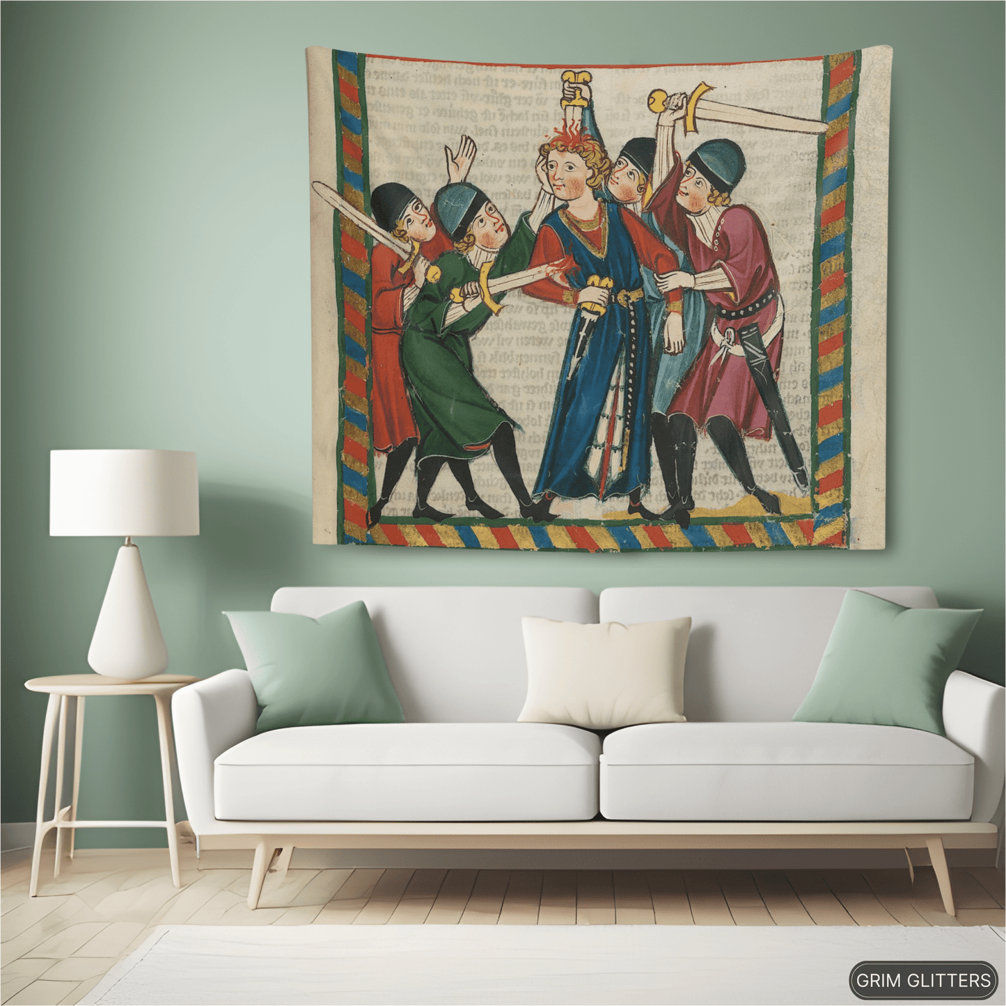 Enrich your space with this evocative tapestry that brings the stark realities of the Middle Ages into your home. The depiction of Herr Reinmar von Brennenberg adds an element of historical drama and artistry to your decor.